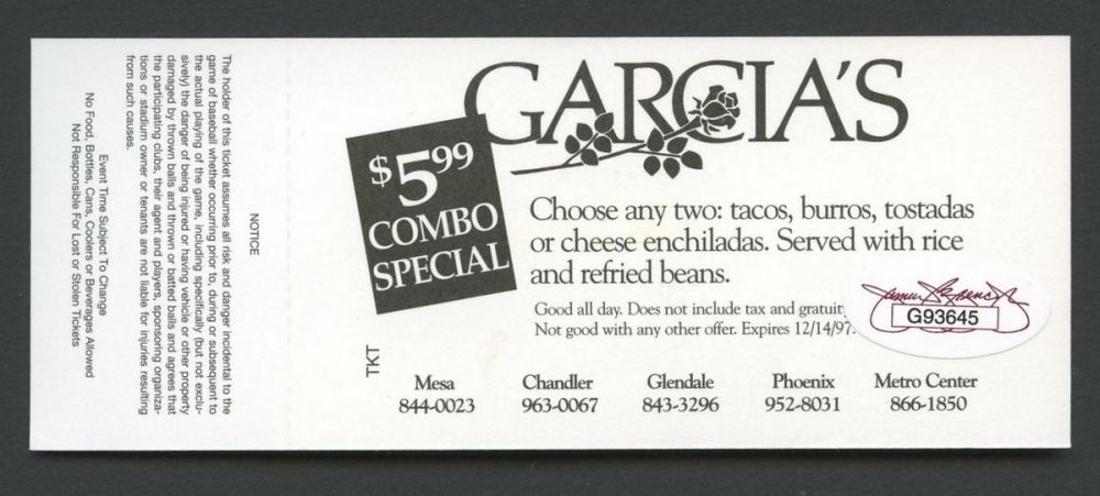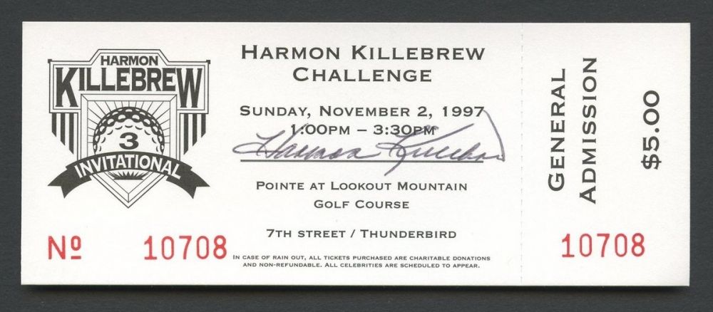 Ticket stub from November 2, 1997 has been hand-signed in black ink by Harmon Killebrew (Twins HOF D 2011). Autograph includes an official James Spence Authentication (JSA) hologram and matching COA for authenticity purposes.
