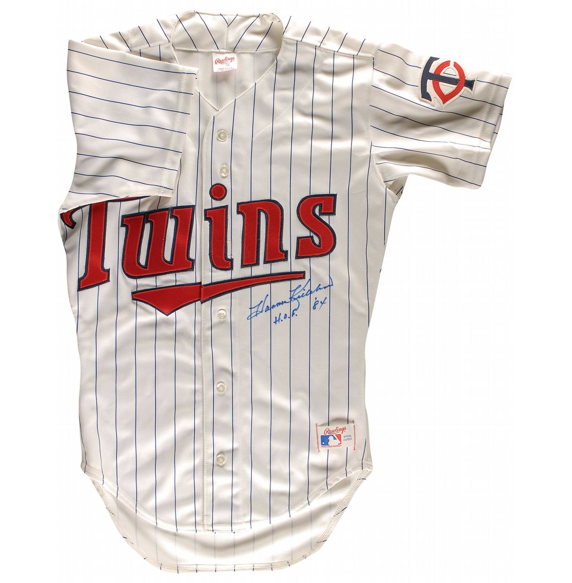 Official Rawlings replica Minnesota Twins baseball jersey, with sewn on letters, signed in black felt tip on the front, “Harmon Killebrew H.O.F. ‘84.” In fine condition.