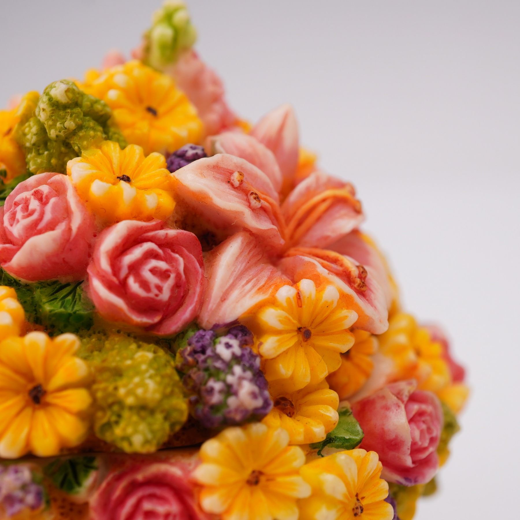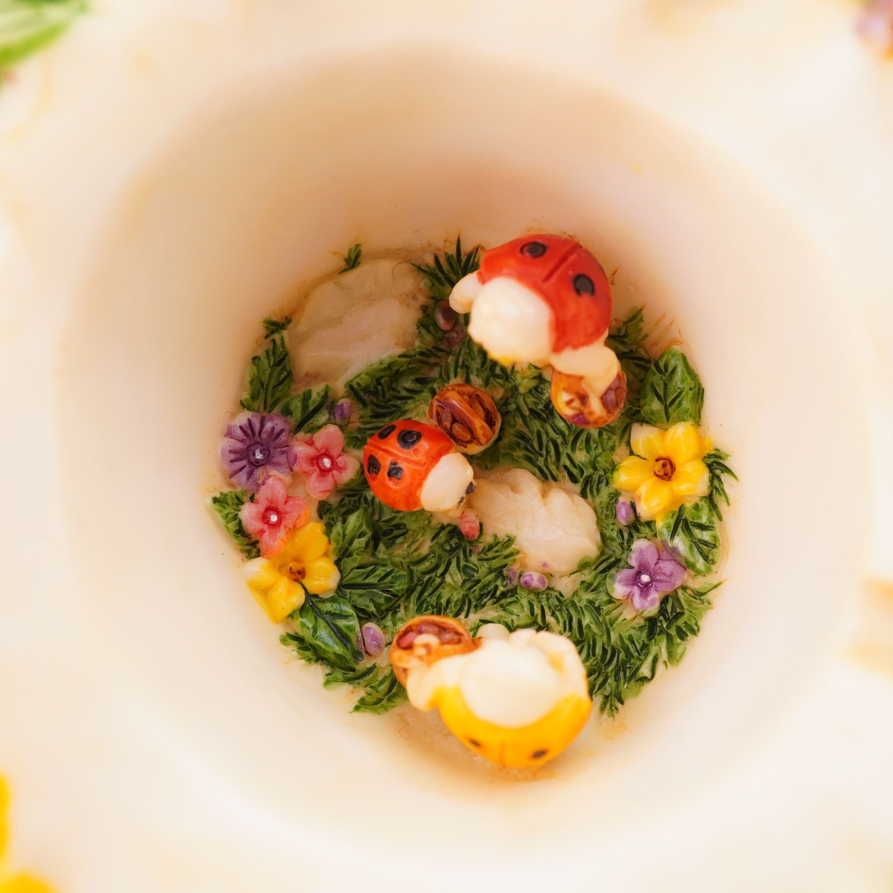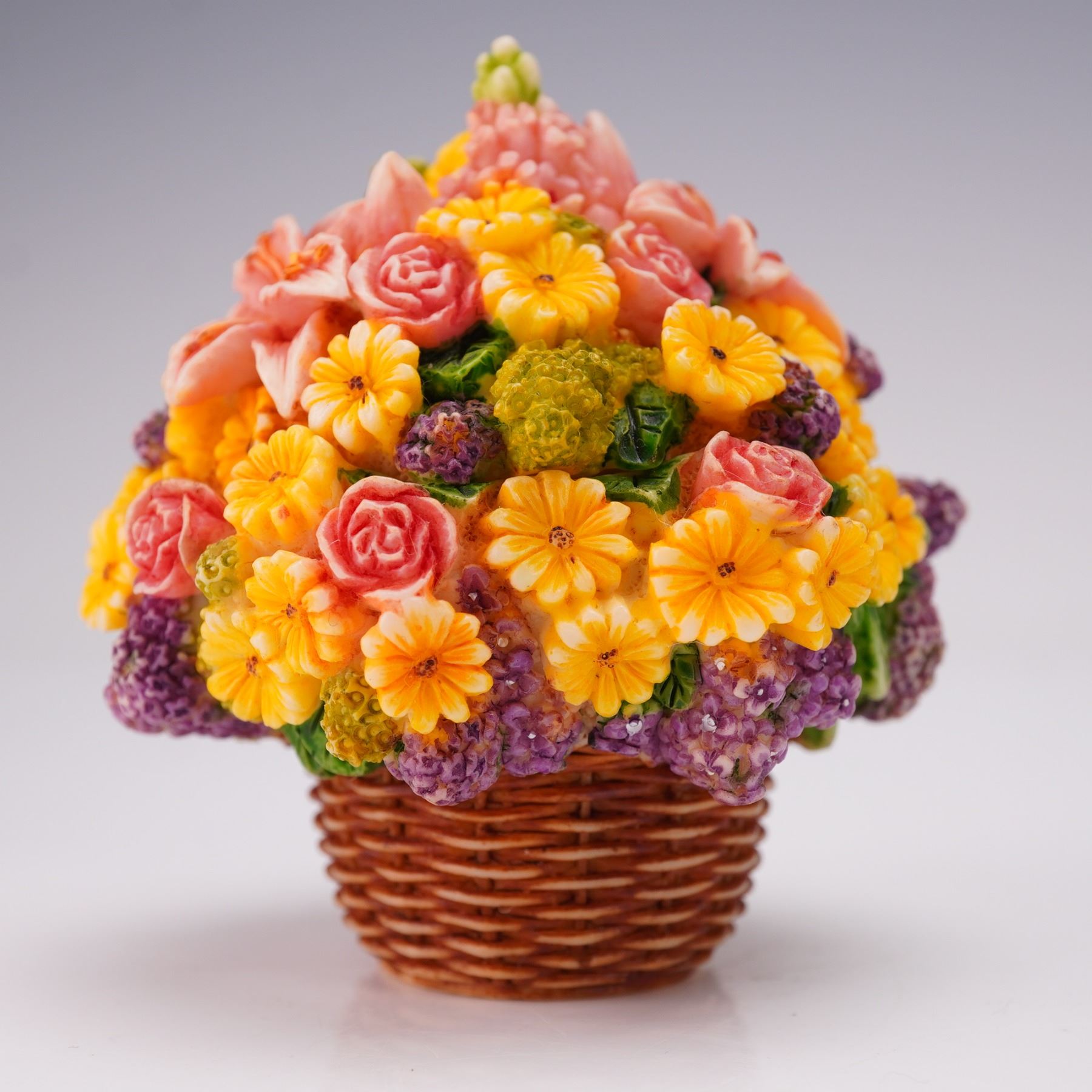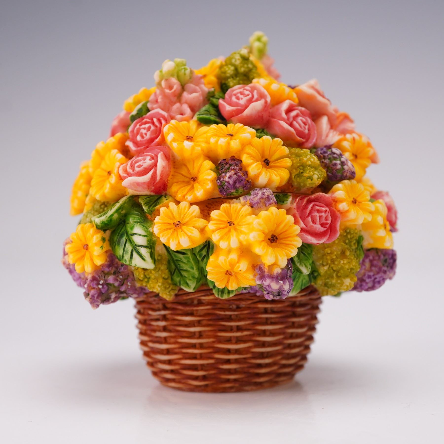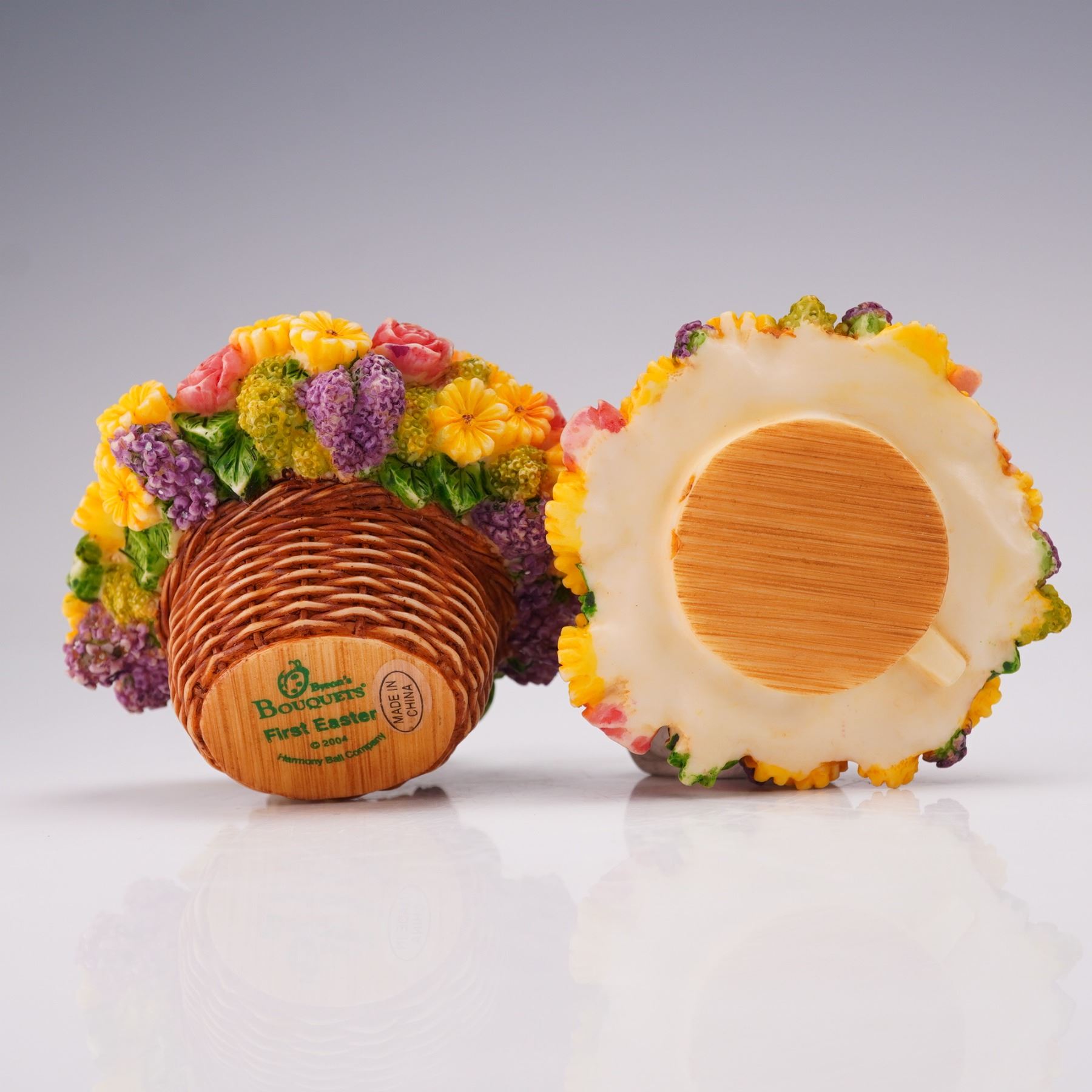 From the Lord Byron's Harmony Garden Bouquets collection. The figural box is designed as a woven basket topped with a bouquet of pink, yellow, green, and purple flowers. The removable lid reveals an interior scene depicting Lord Byron the ladybug with his family during an Easter Egg Hunt. The underside is marked Harmony Ball Company.