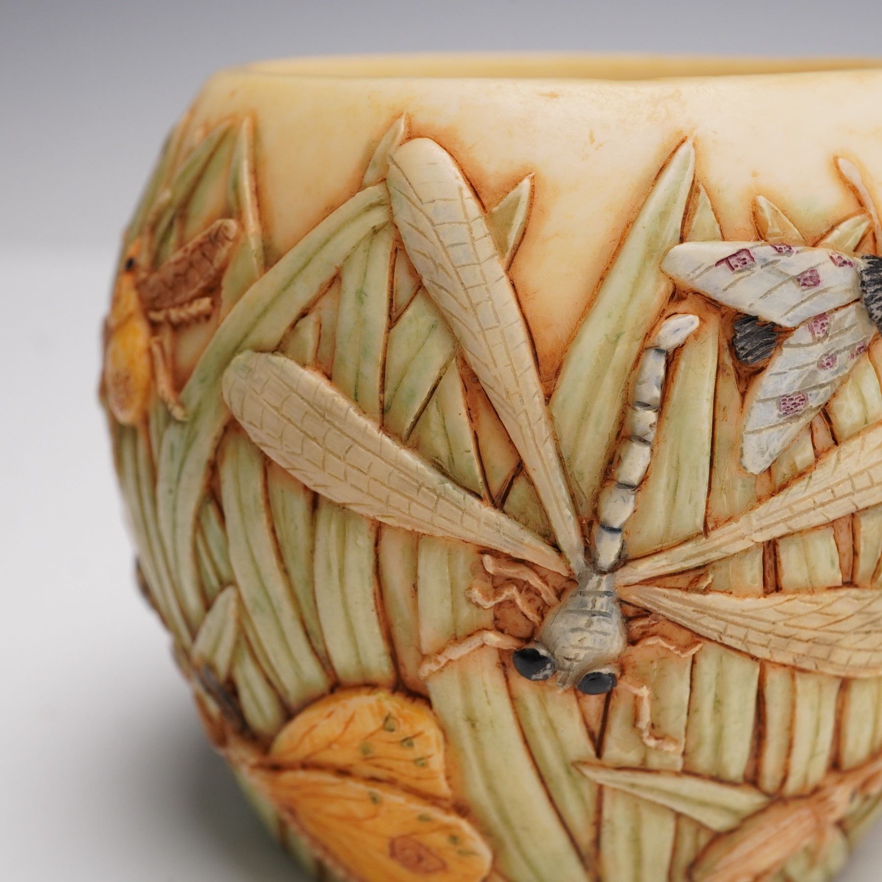 Harmony Ball Jardinia Wings of Desire treasure box, finely detailed with a raised garden motif featuring butterflies, ladybugs, bees, and grasshoppers among blades of grass. The lid continues the design with a ladybug accent, and the underside is marked Jardinia Wings of Desire, Made in China. Includes the original box. Box measures 6"L x 4.75"H.