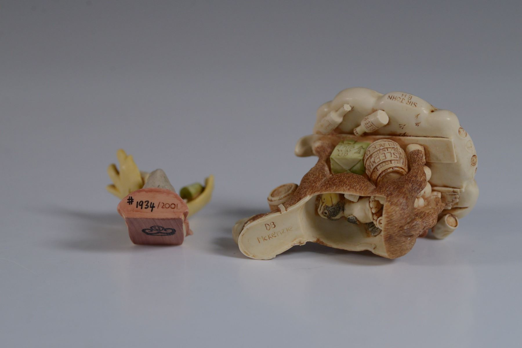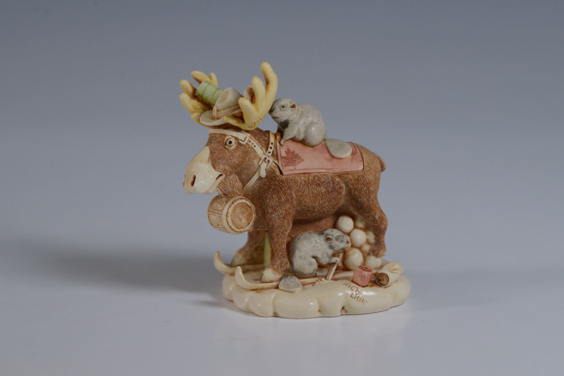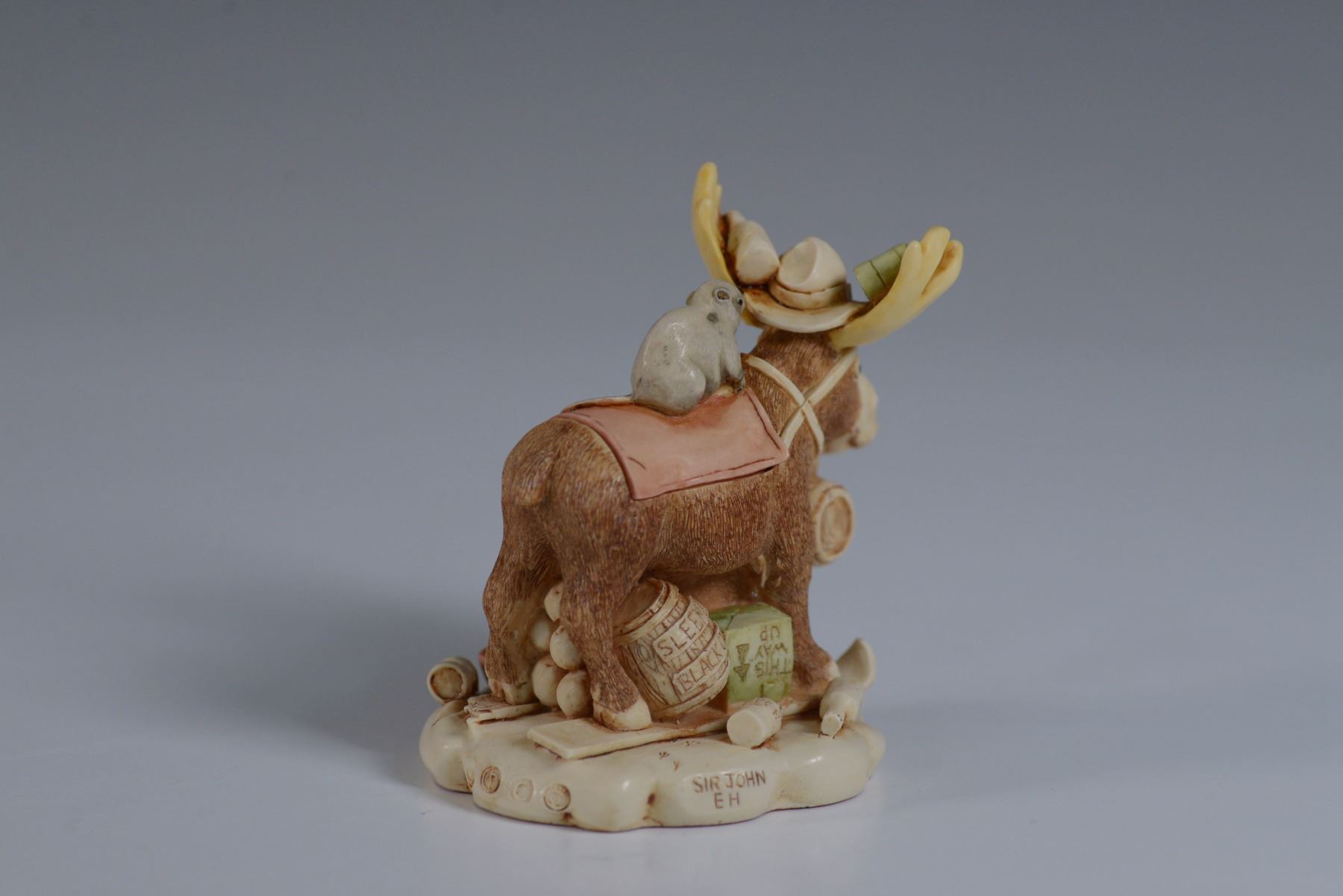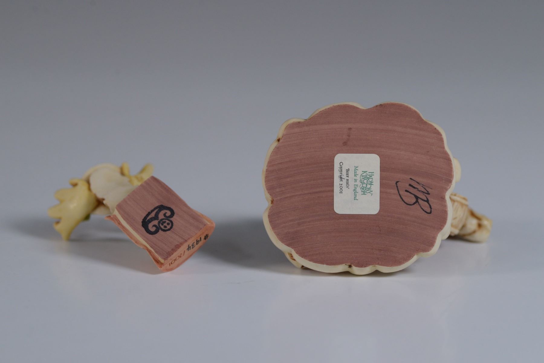 This Limited Edition whimsical Bear Nuts figurine from Harmony Kingdom is a delightful creation by master carver Monique Baldwin. Crafted in 2001 in England, the piece features a charming moose adorned with a playful hat and intricate details, embodying Baldwin's signature style. The figurine is accompanied by its original box and certificate of authenticity, enhancing its collectible appeal. The base of the figurine is marked with the Harmony Kingdom hallmark, confirming its authenticity and craftsmanship.