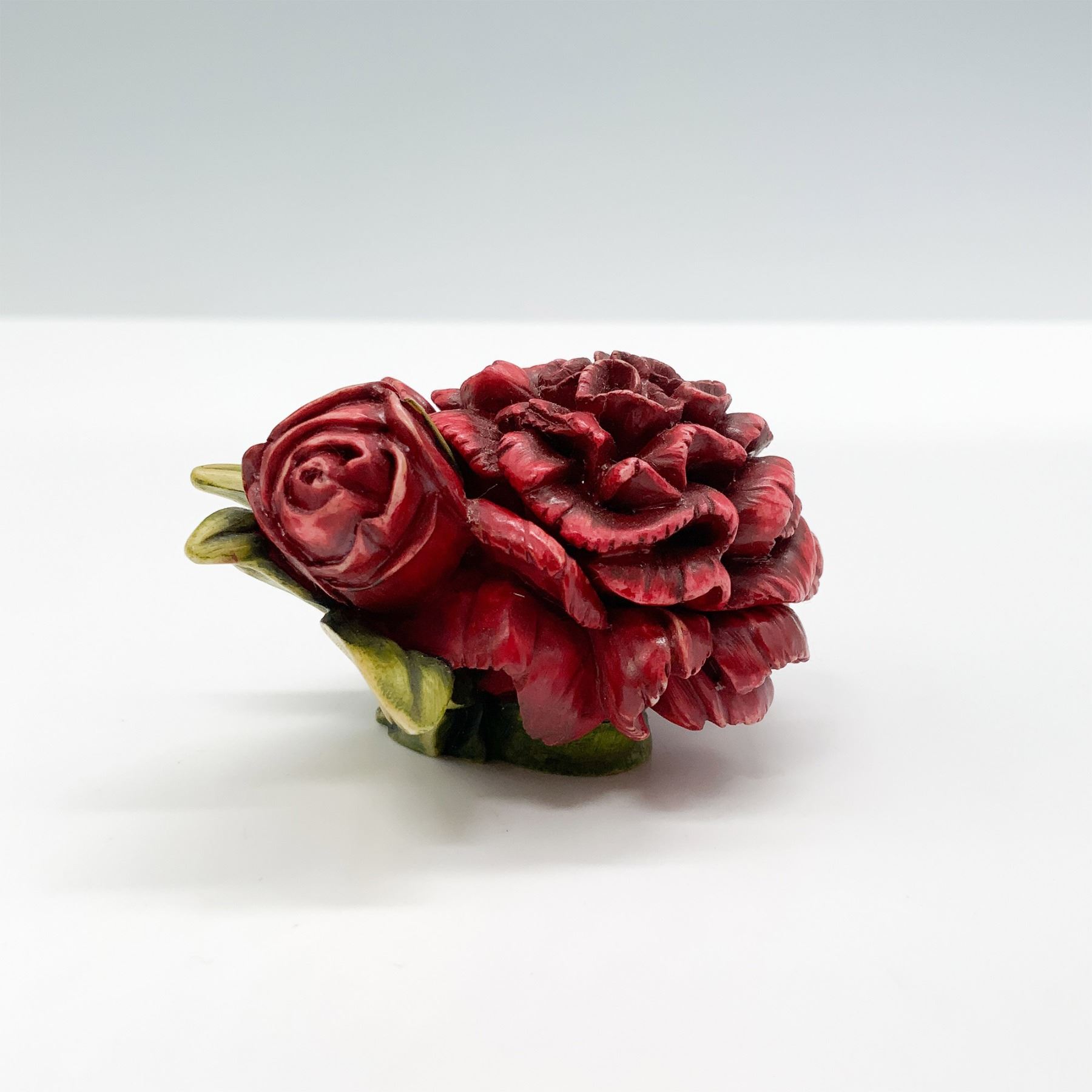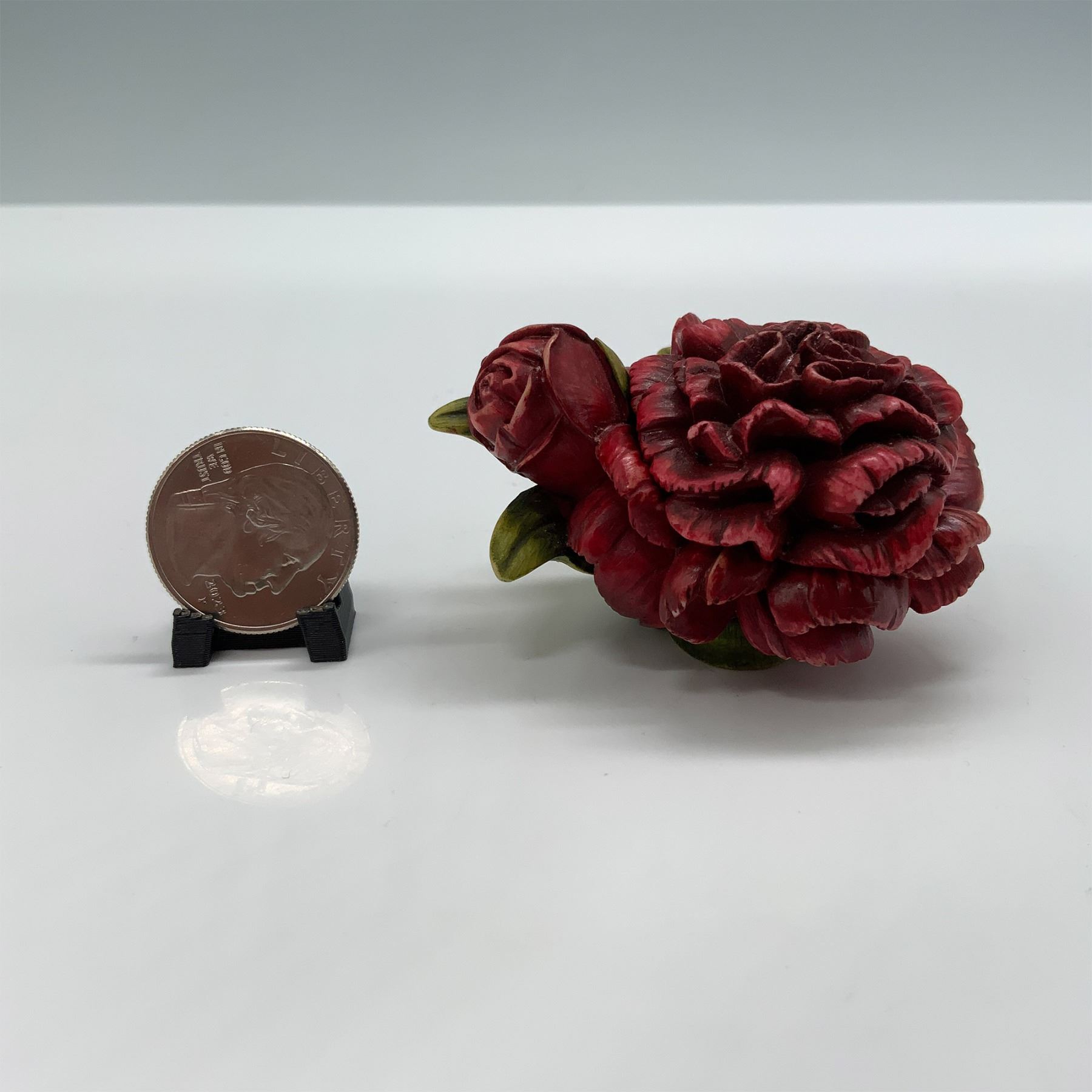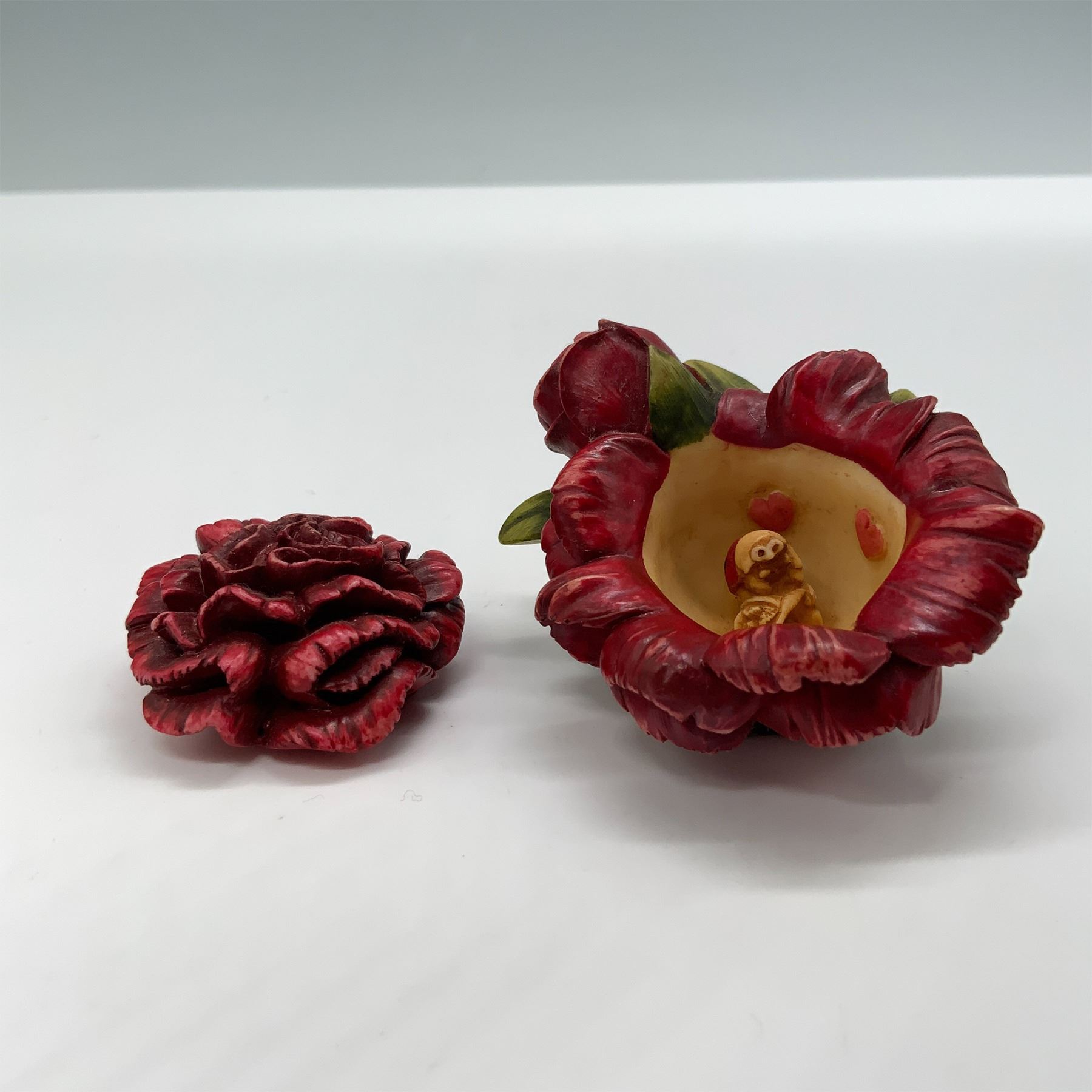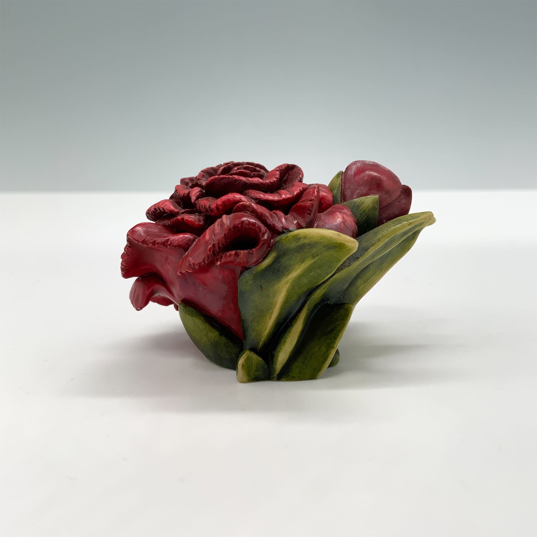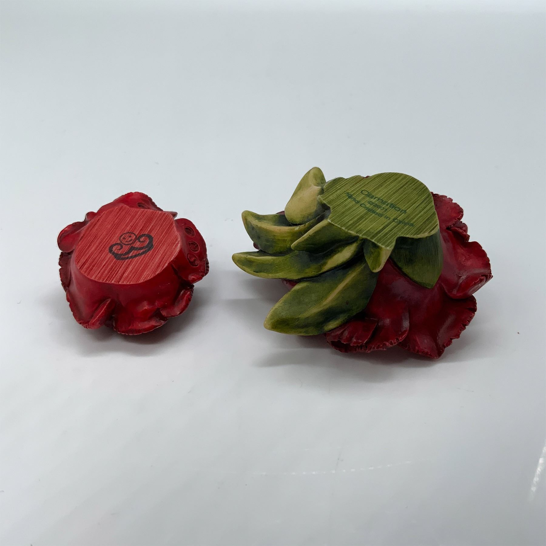 Harmony Kingdom Carnation Figure Box, designed in 2001, hand-carved in China. This intricately crafted treasure box features a vibrant red carnation bloom with green foliage. Inside, it conceals a delightful figure of a ladybug. The base is marked with the Harmony Kingdom logo and "Carnation 2001." Known for their collectible treasure boxes, Harmony Kingdom pieces are cherished for their artistry and whimsical designs.