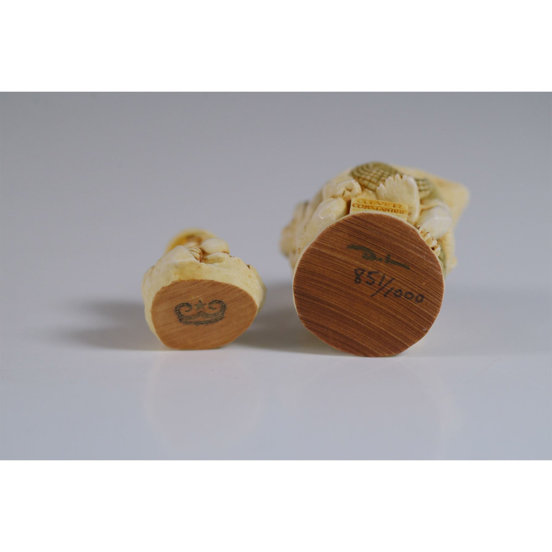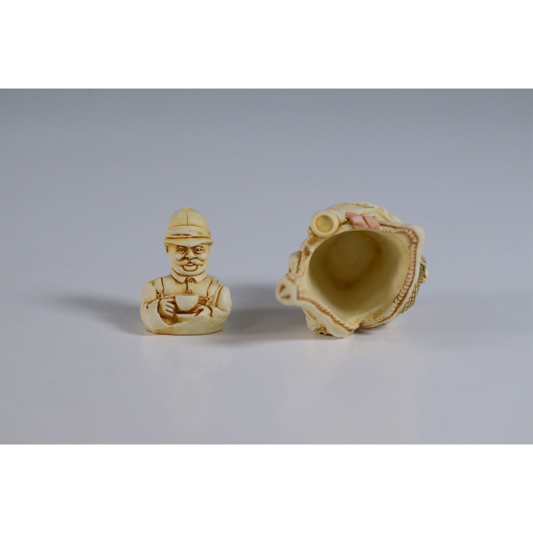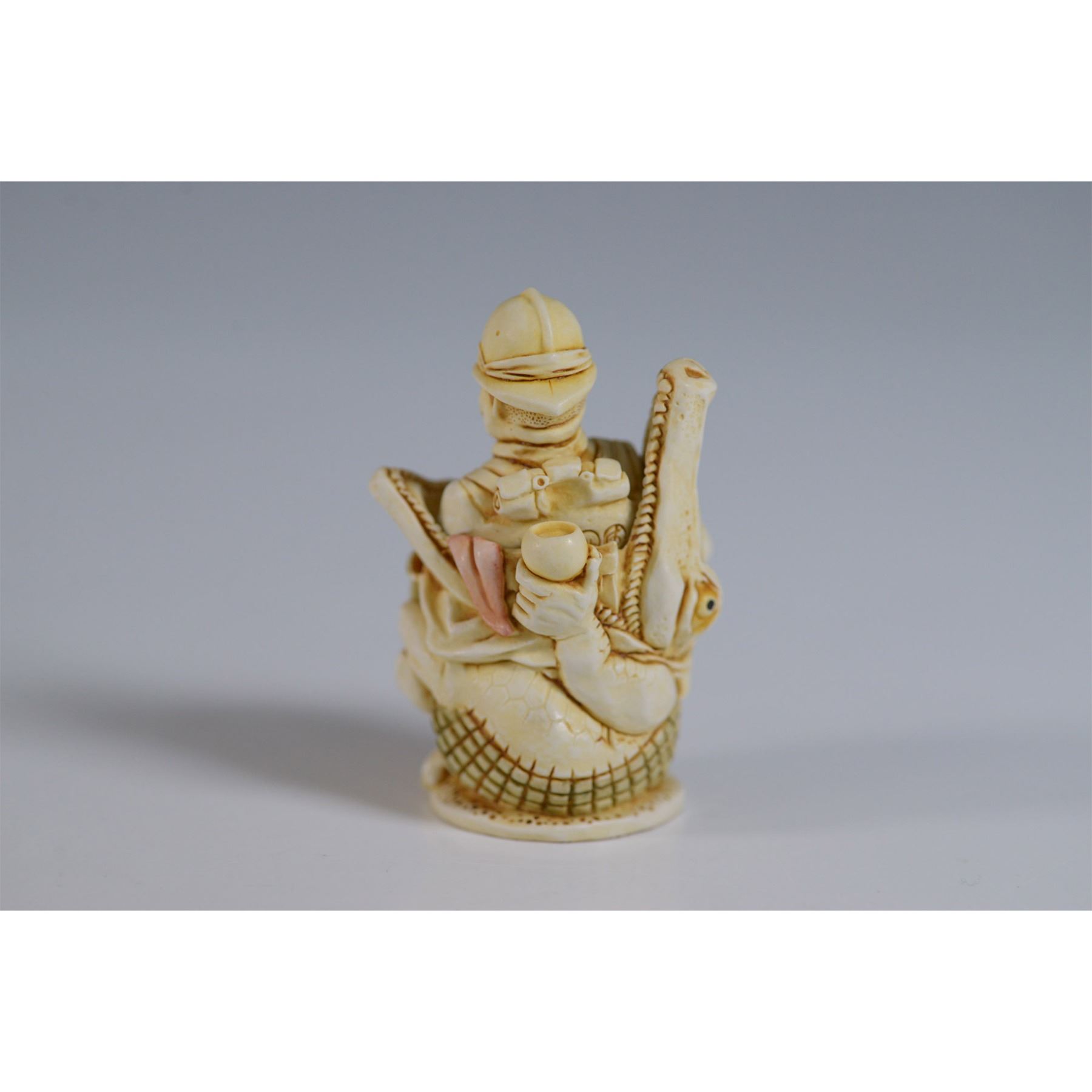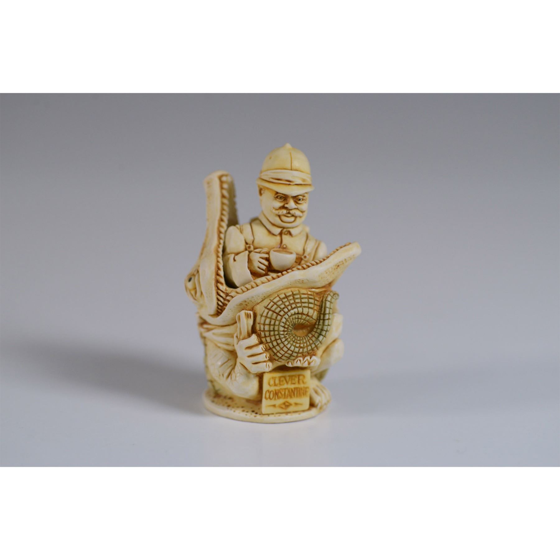 A finely crafted Harmony Kingdom Clever Constantine Treasure Box, 2"H featuring a whimsical explorer encased in a crocodile's mouth. This intricately hand-painted collectible is sculpted in a detailed resin composite, mimicking the look of antique ivory. The piece is designed as a hidden compartment ring box, revealing a removable bust of the explorer holding a tea cup. Marked on the base with the Harmony Kingdom crown logo and numbered 851 of 1000, signifying its limited edition status.