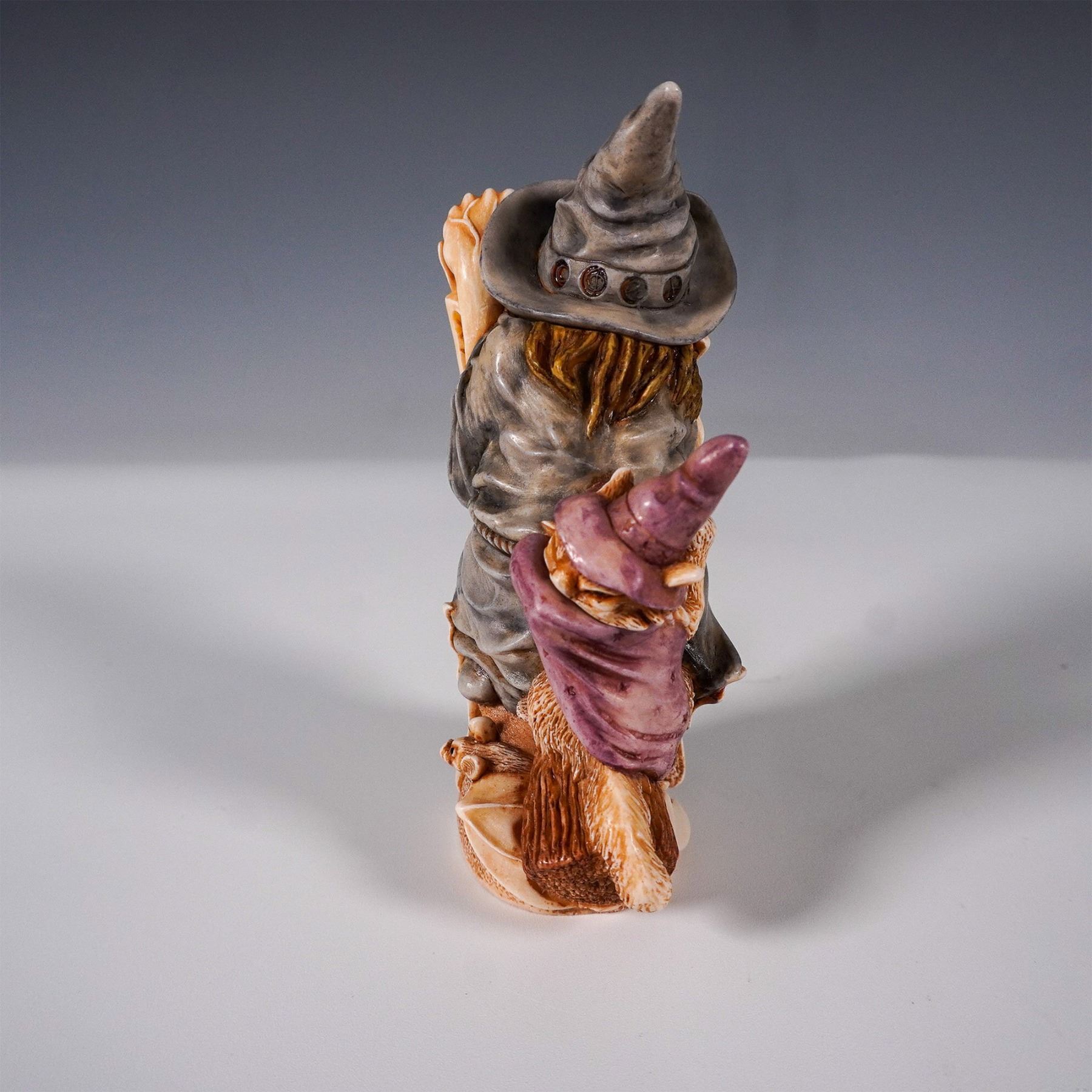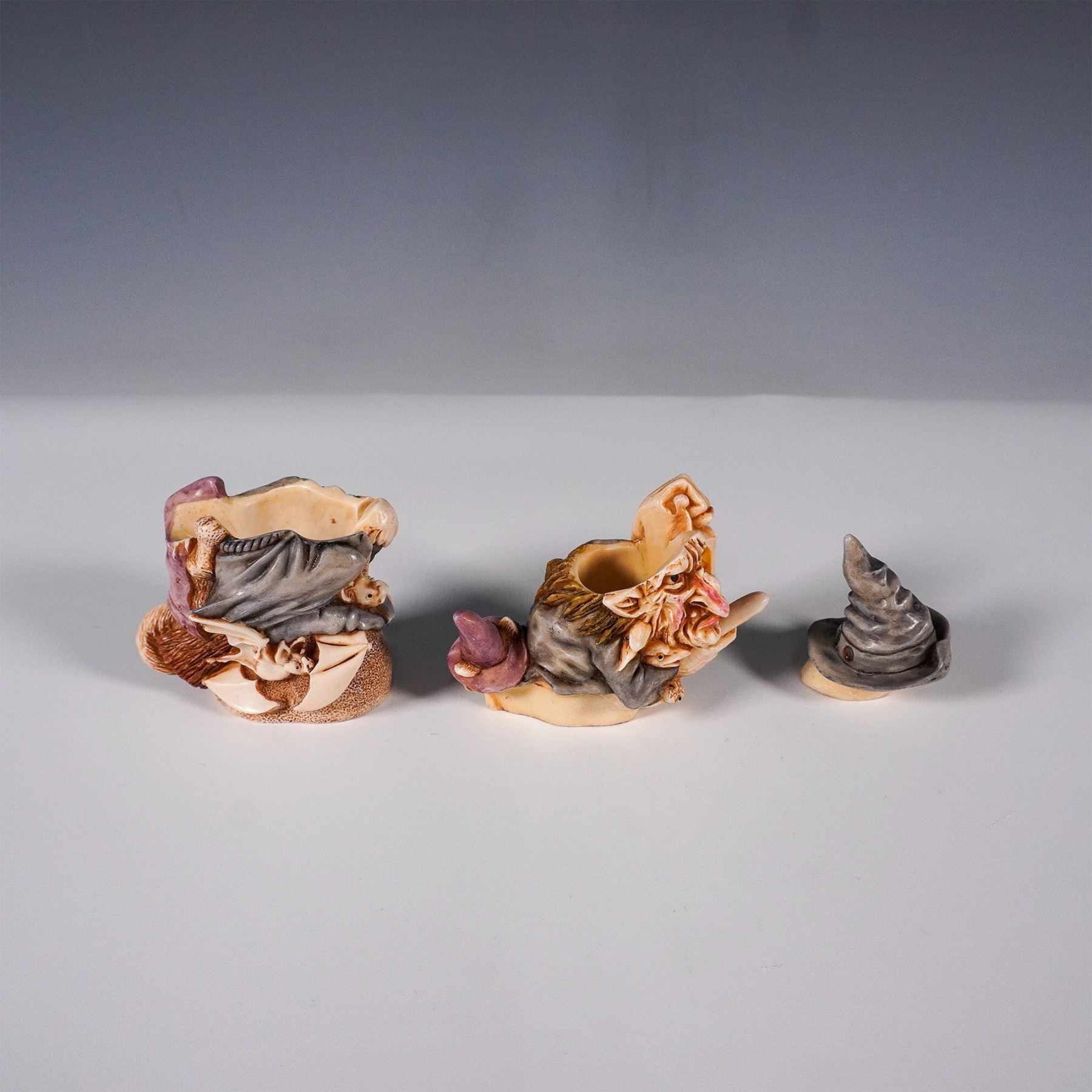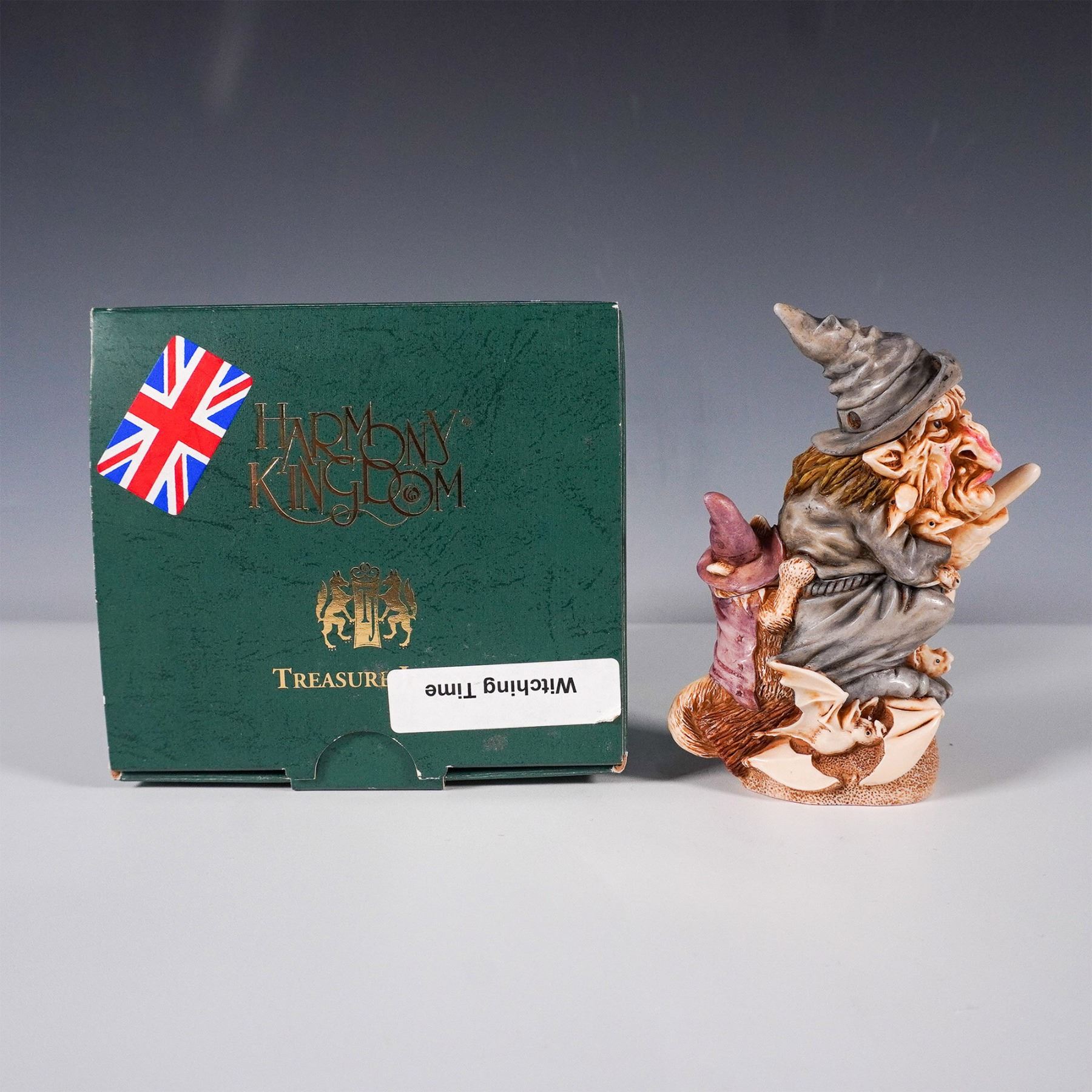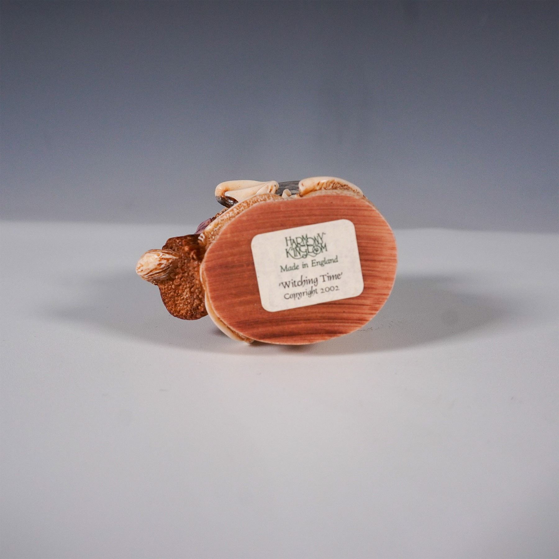 This collectible Harmony Kingdom ring box, titled "Witching Time," was crafted in England and is marked with the 2002 copyright on the base. Measuring 3.75"H, the intricate design features a whimsical witch and detailed embellishments, including bats and other magical motifs. The box comes with its original dimensions of 4"L x 3.5"W x 3.25"H, offering both charm and functionality. Ideal for collectors, this piece showcases the exceptional craftsmanship and storytelling elements Harmony Kingdom is known for.