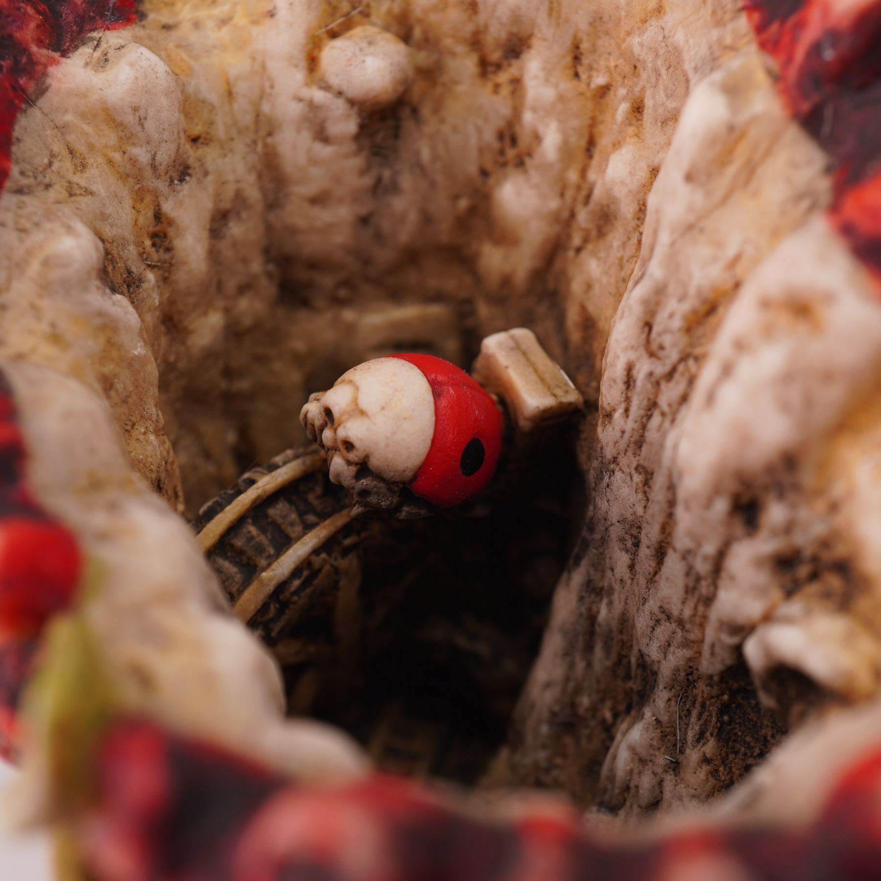 From the Lord Byron's Harmony Garden collection. The piece features a removable lid designed with textured red berries and green leaves, concealing an interior scene with Lord Byron, the ladybug, inside the hollow center. Model number HGCR. The underside is marked Harmony Kingdom.