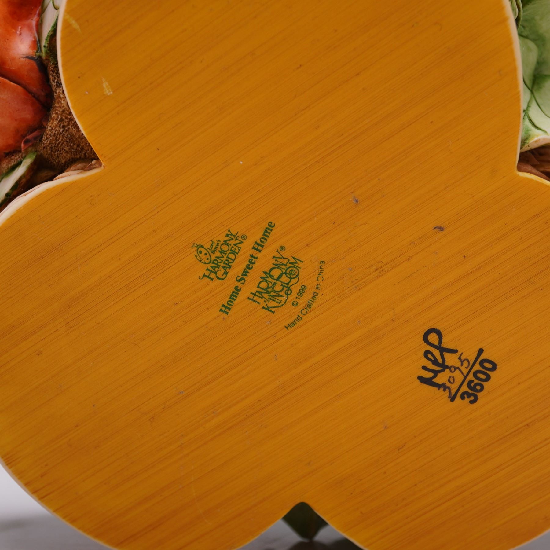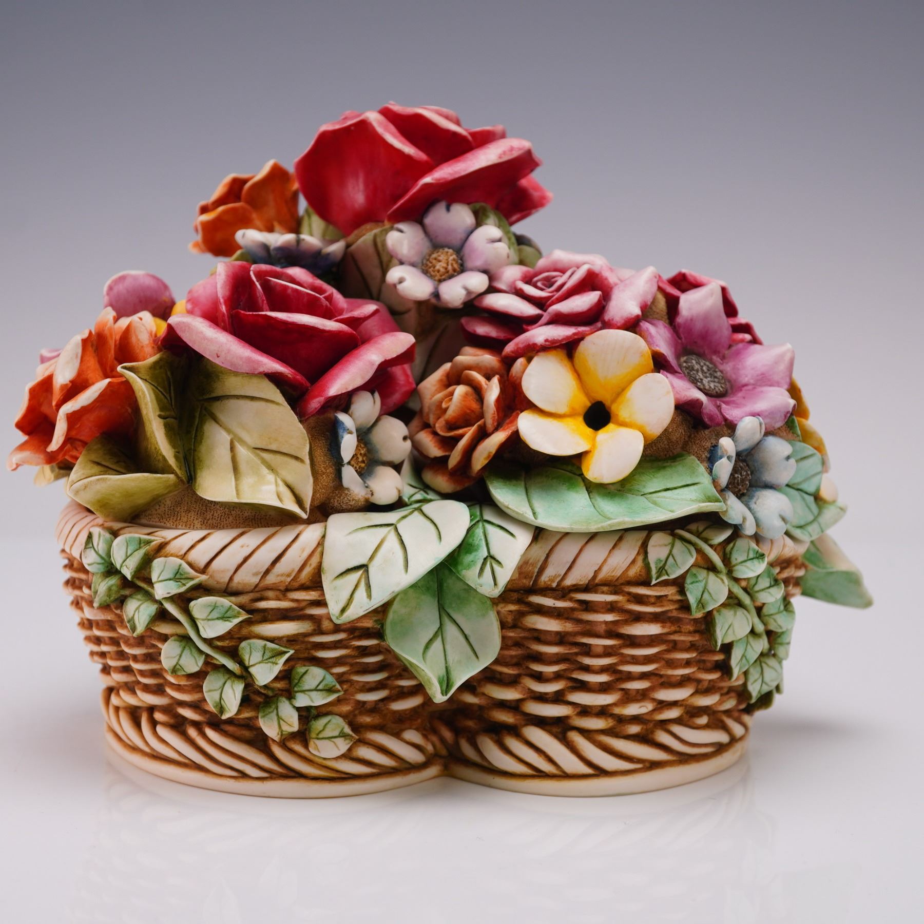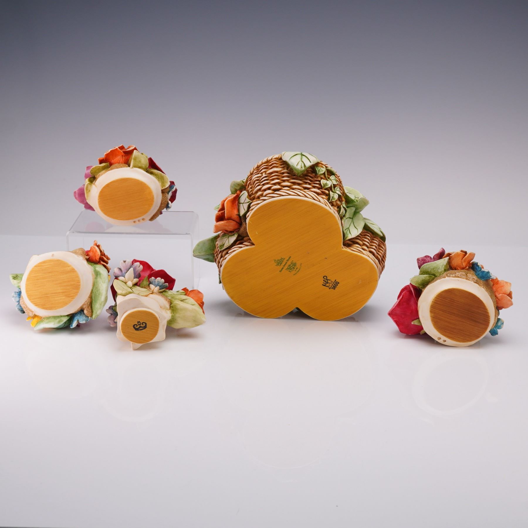 Part of the Lord Byron's Harmony Garden collection. This limited edition piece, model number HGLELR3, features a woven basket base adorned with colorful flowers and four removable lids. The multi-compartment design reveals interior scenes, each decorated with detailed miniature settings, including a character represented as a ladybug, known as Lord Byron. The figurine depicts Byron's rose garden home, reimagined and furnished during his absence, with four separate lids concealing the interior compartments. Marked Harmony Kingdom on the underside.