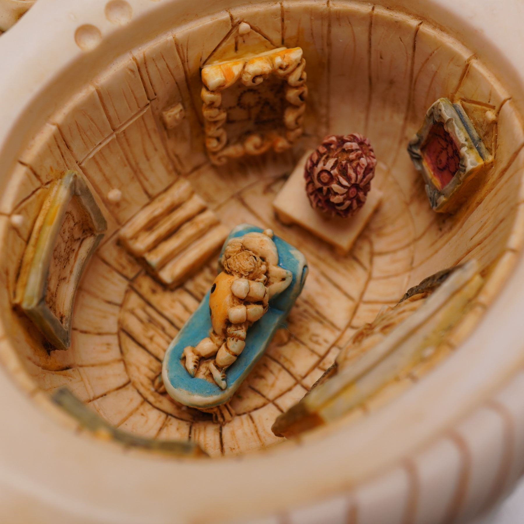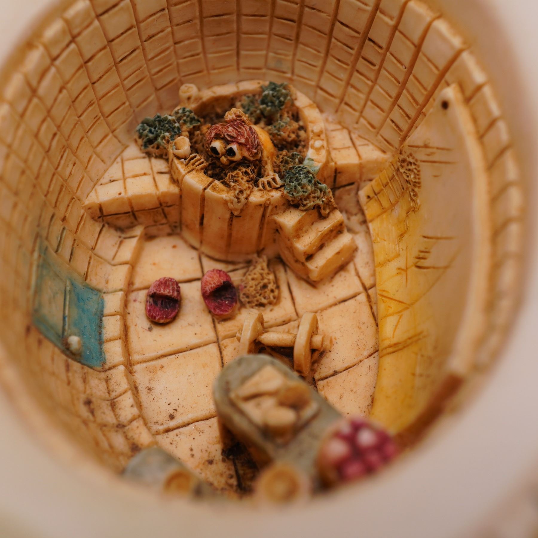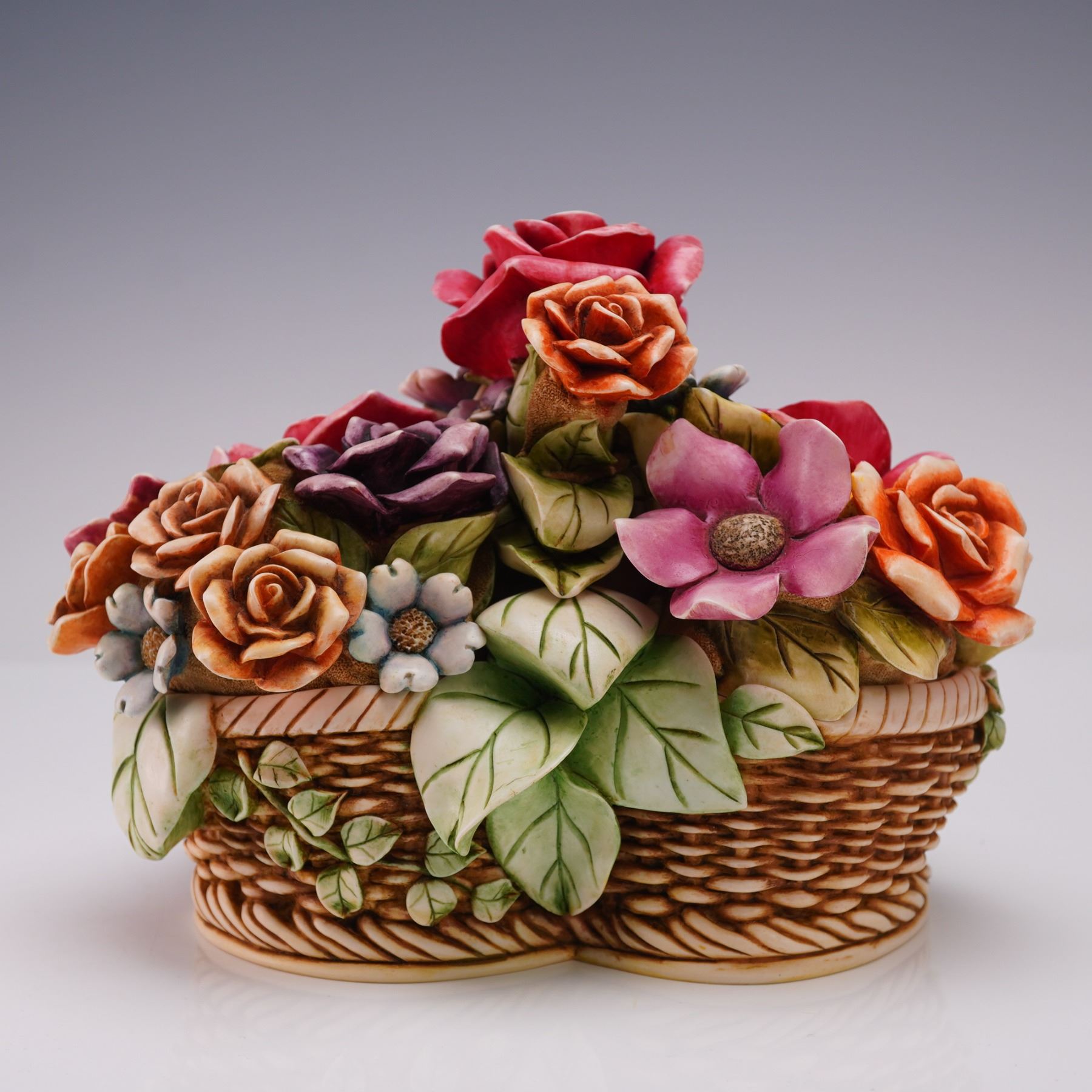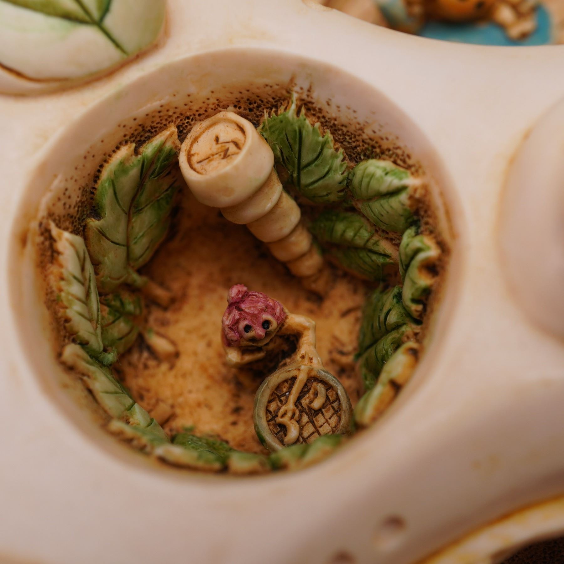 Part of the Lord Byron's Harmony Garden collection. This limited edition piece, model number HGLELR3, features a woven basket base adorned with colorful flowers and four removable lids. The multi-compartment design reveals interior scenes, each decorated with detailed miniature settings, including a character represented as a ladybug, known as Lord Byron. The figurine depicts Byron's rose garden home, reimagined and furnished during his absence, with four separate lids concealing the interior compartments. Marked Harmony Kingdom on the underside.