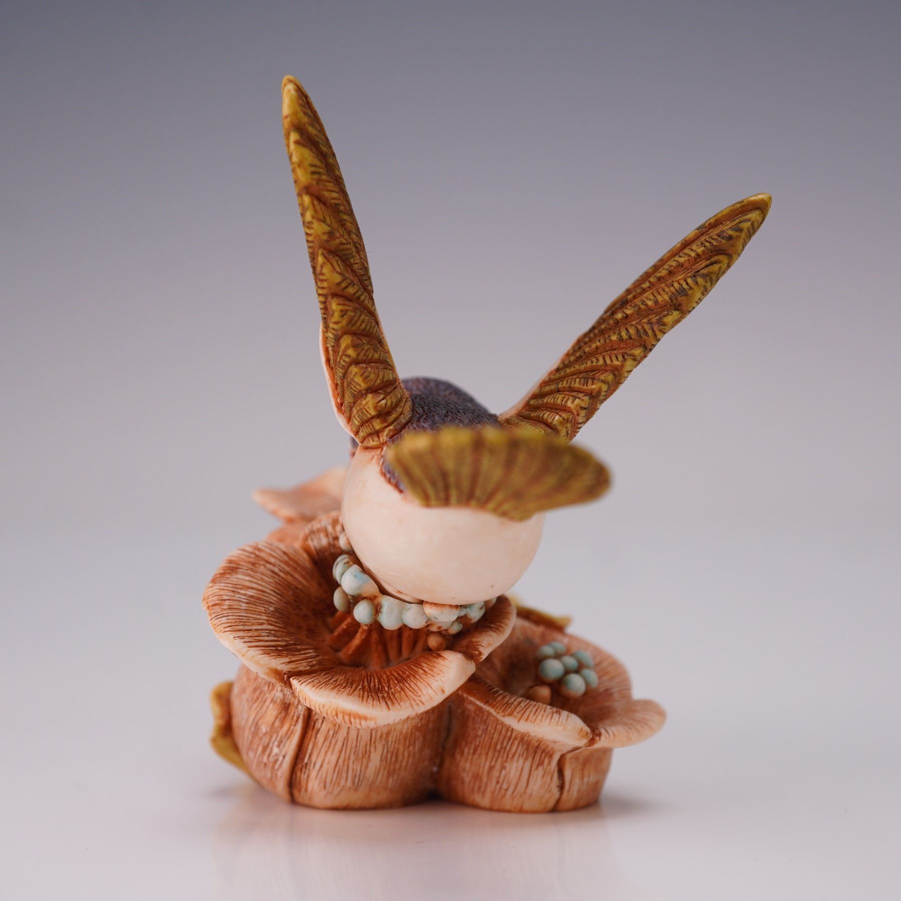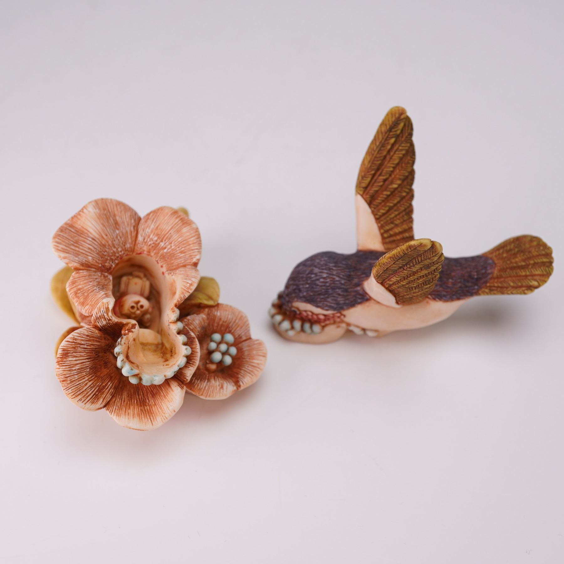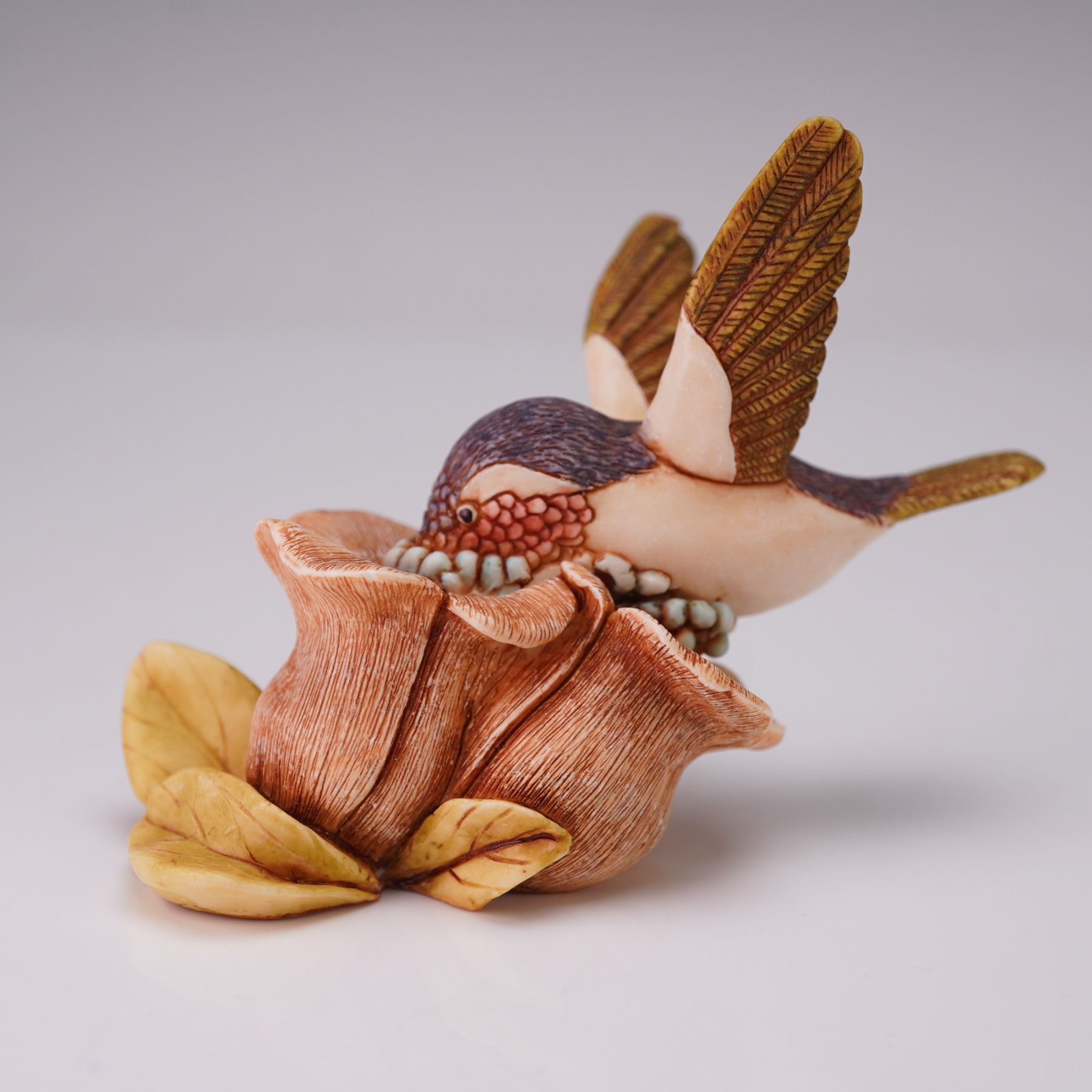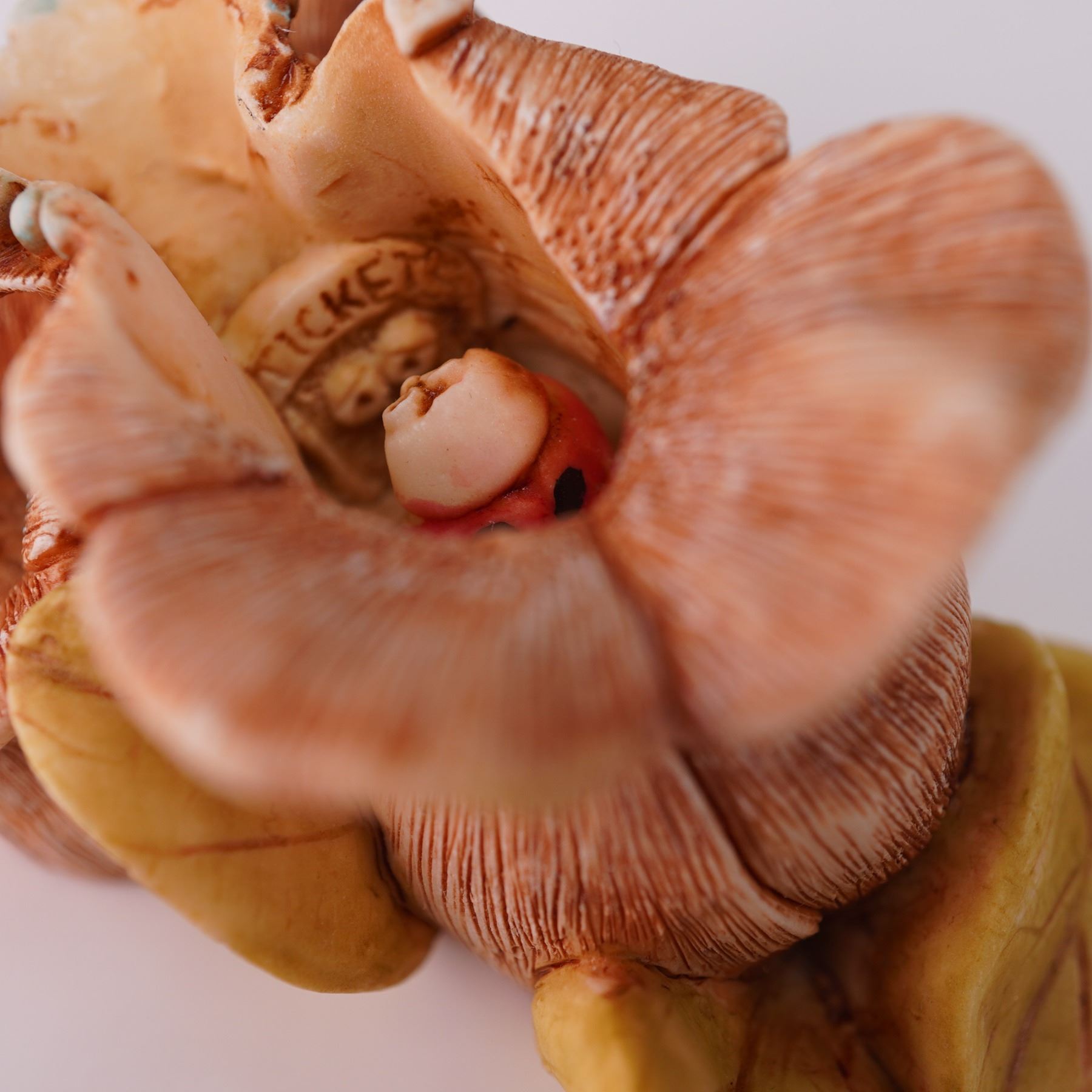 This limited edition piece is part of Lord Byron's Harmony Garden collection, with Lord Byron represented as a ladybug. Depicting a hummingbird drawing nectar from a flower. The figurine opens to reveal a hidden interior scene of Lord Byron buying a ticket with a suitcase behind him. Signed in black ink by Monique Baldwin. Model number RW99SS. The underside is marked Harmony Kingdom.
