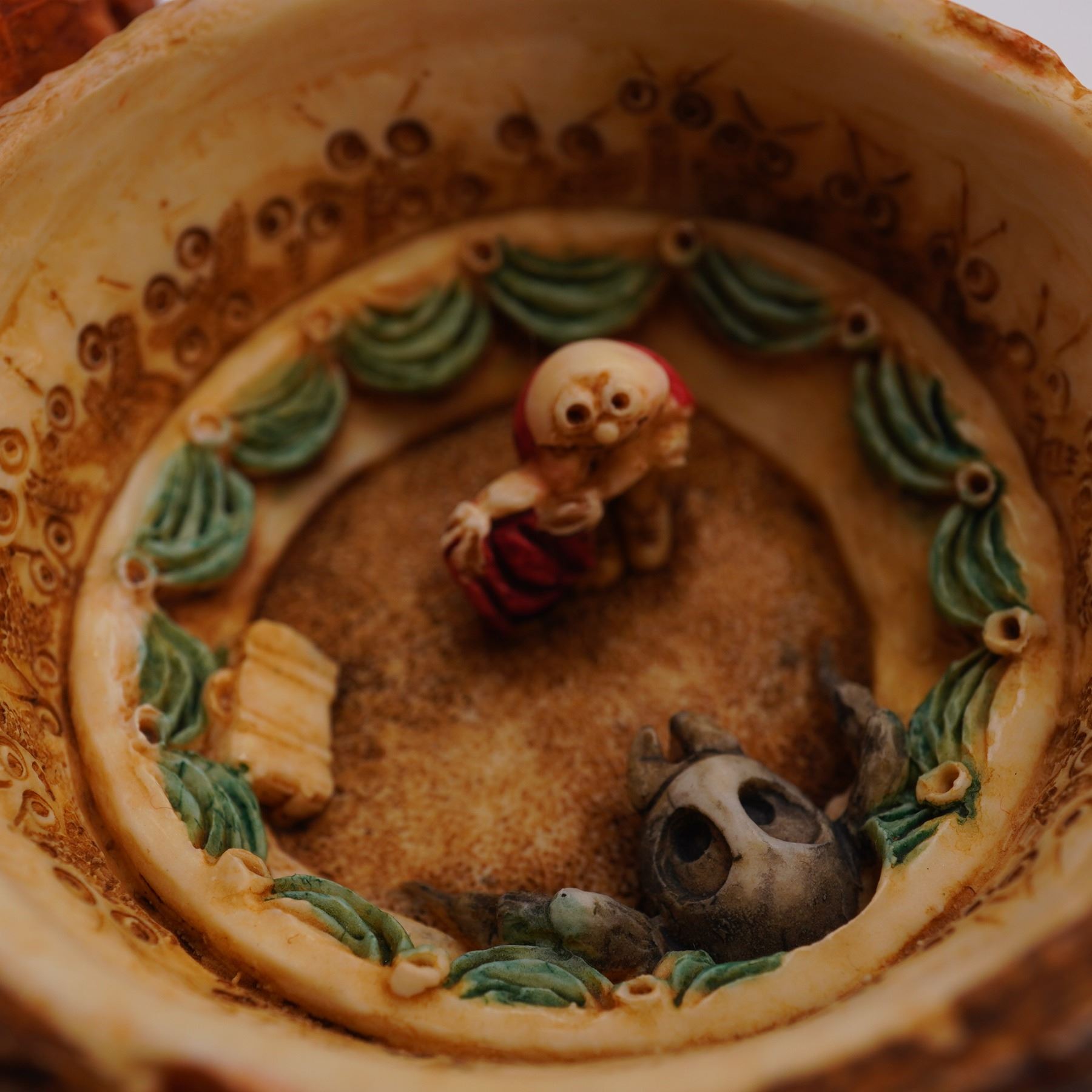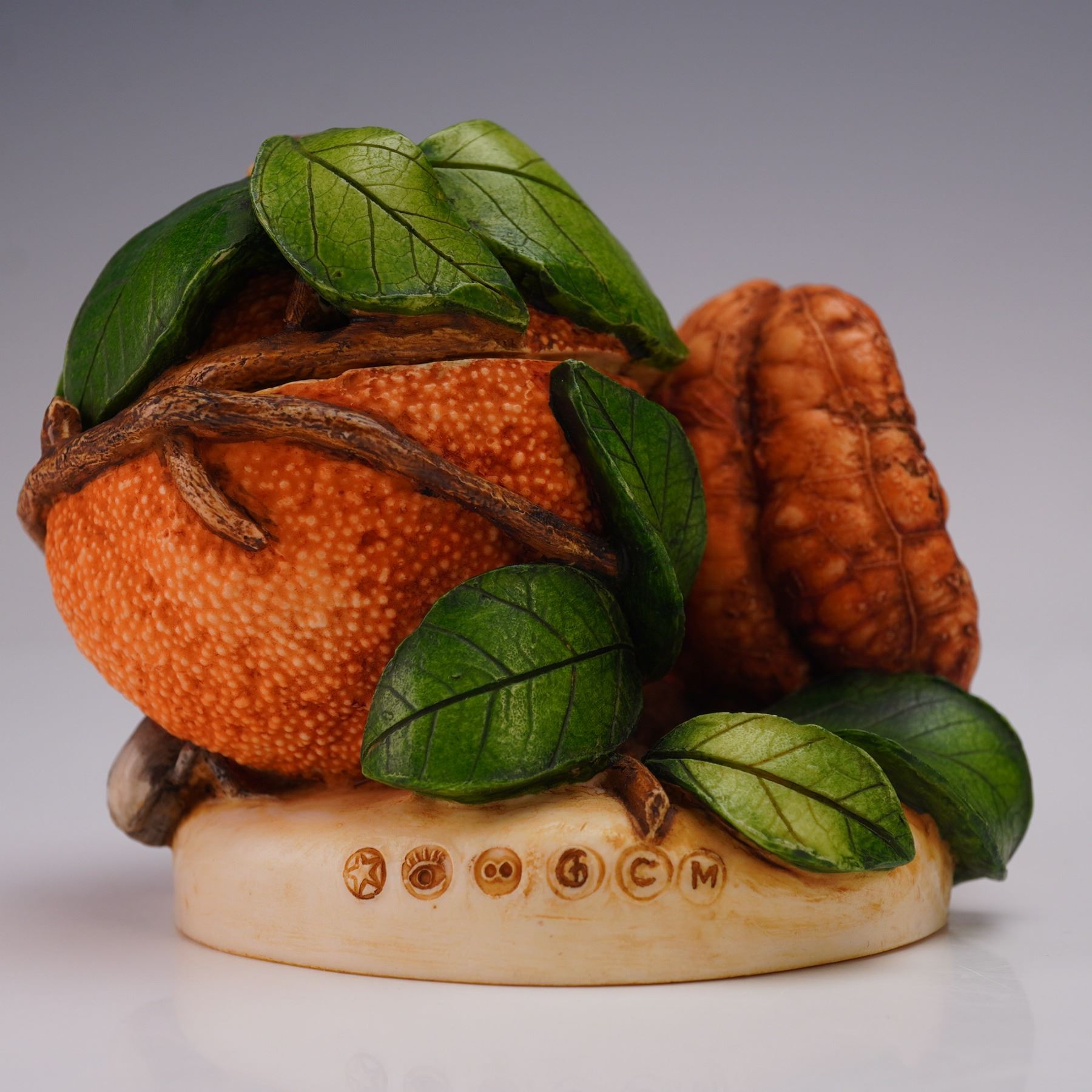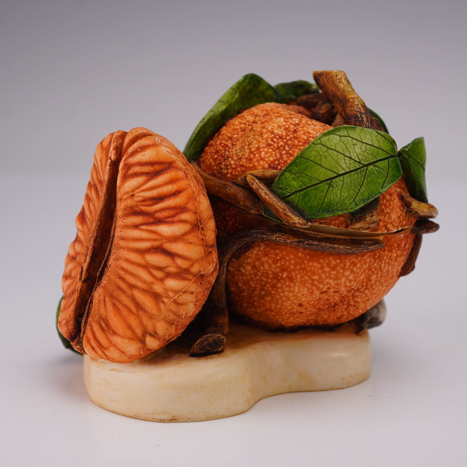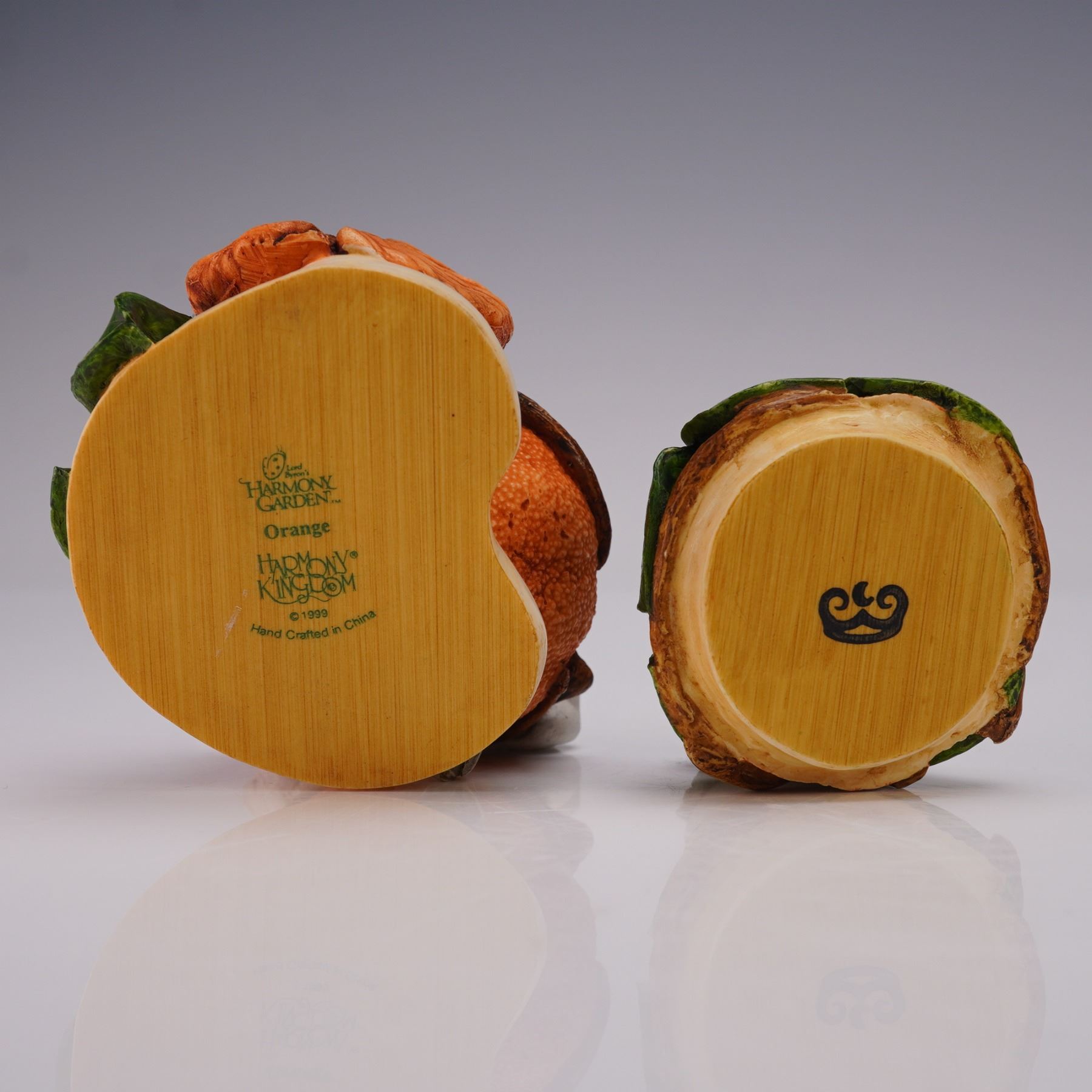 From the Lord Byron's Harmony Garden collection. This collectible features Lord Byron, the ladybug character, depicted in Spain's Orange Arena where he faces and defeats Mighty Toro, a beetle. The covered box form includes a fitted lid that conceals a small interior compartment, characteristic of the Harmony Kingdom style. Model number HG3OR. The underside is marked Harmony Kingdom.