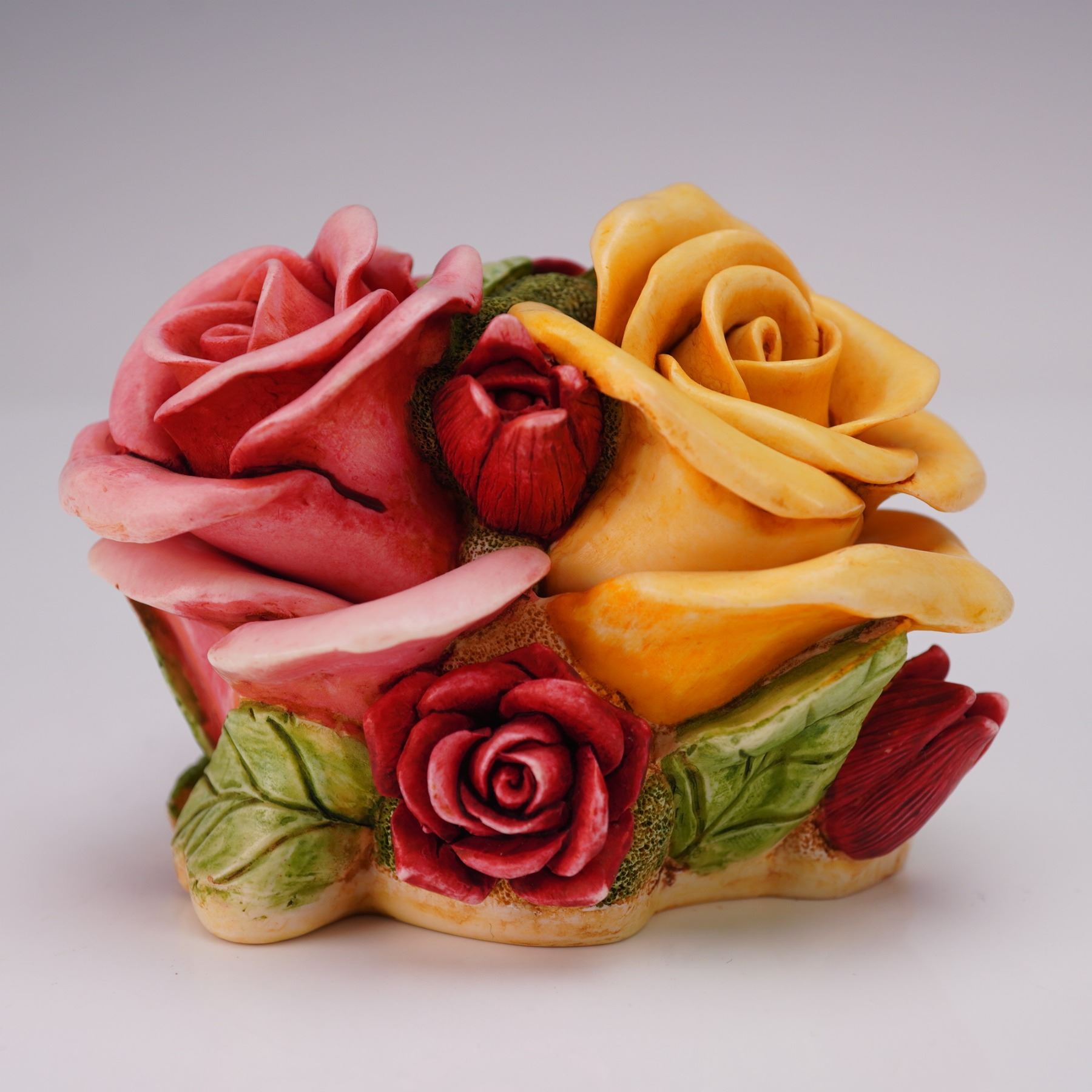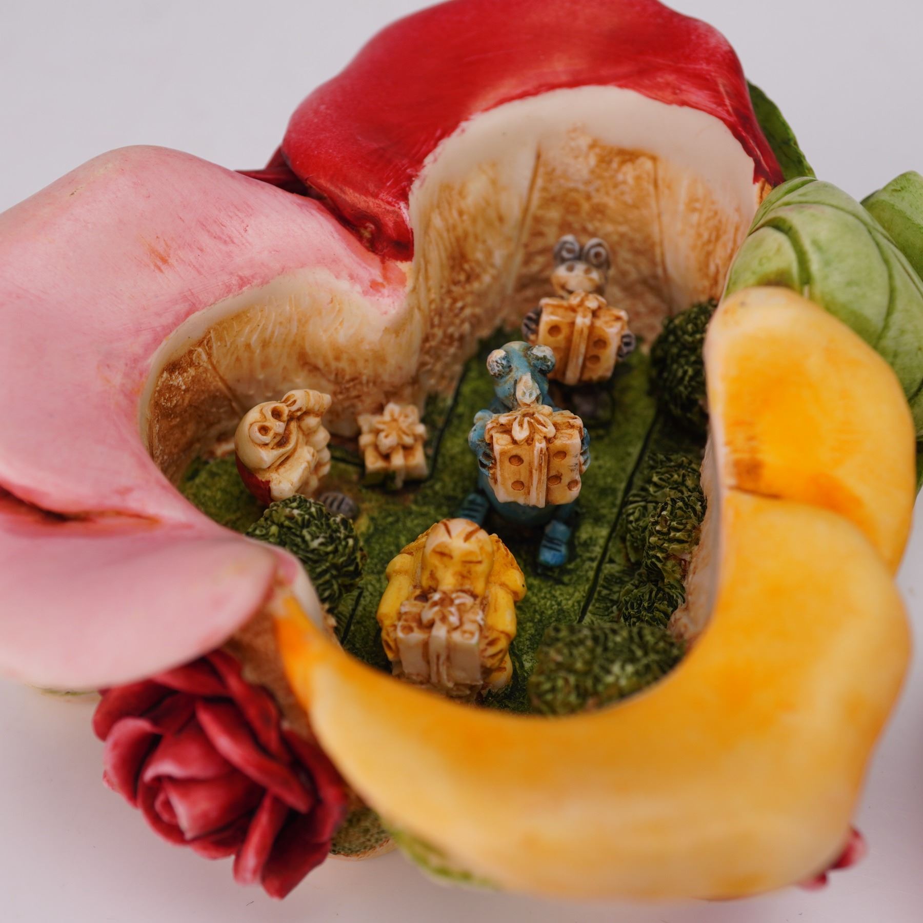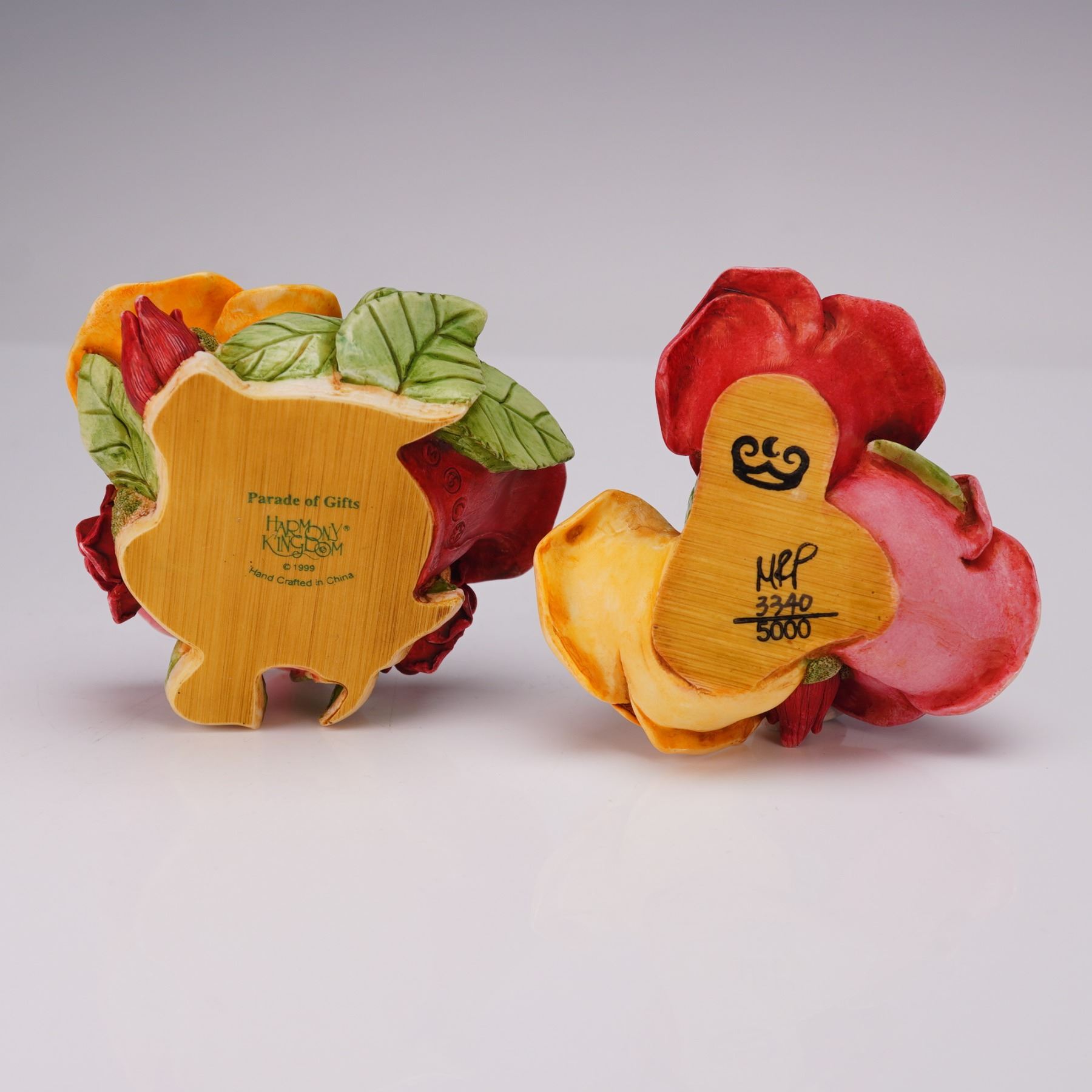 This limited-edition piece features a rose bouquet exterior with detailed red, pink, and yellow blooms and green leaves. The lid lifts to reveal Lord Byron, the ladybug, leading a parade of bug friends carrying gifts. This is noted as the first Parade of Gifts buying group exclusive. Marked Harmony Kingdom on the underside. Model number HGLEC99S.