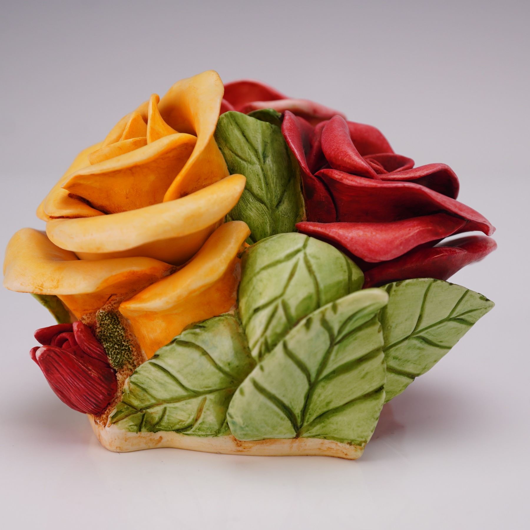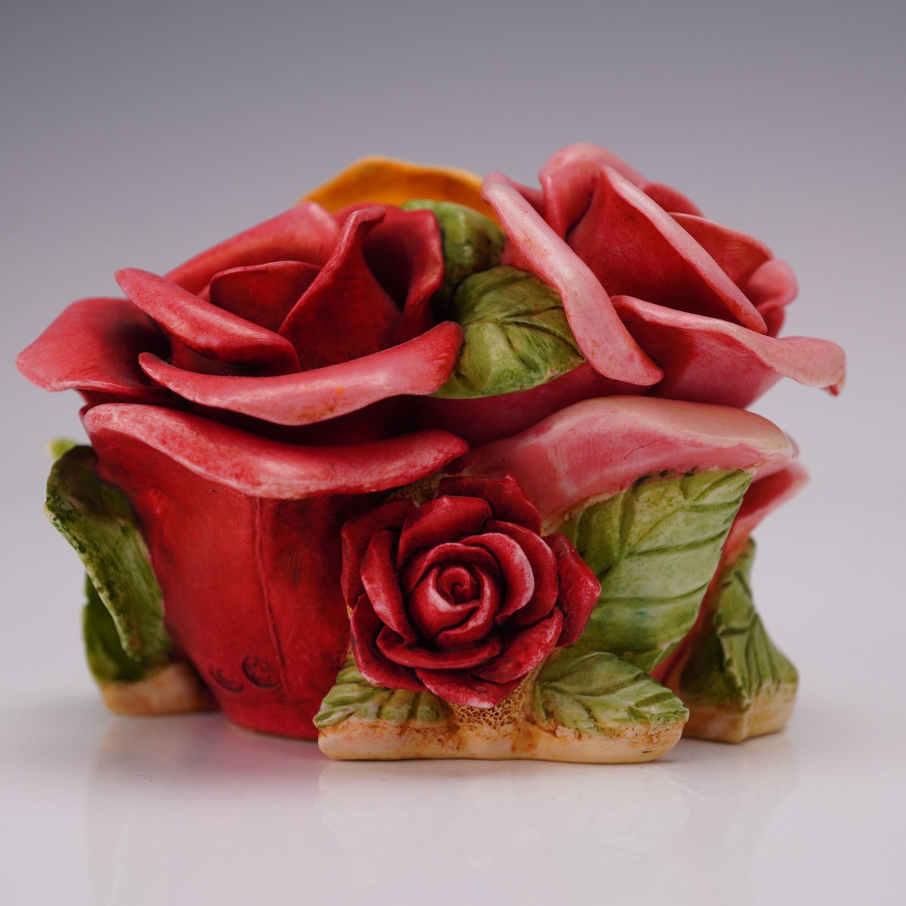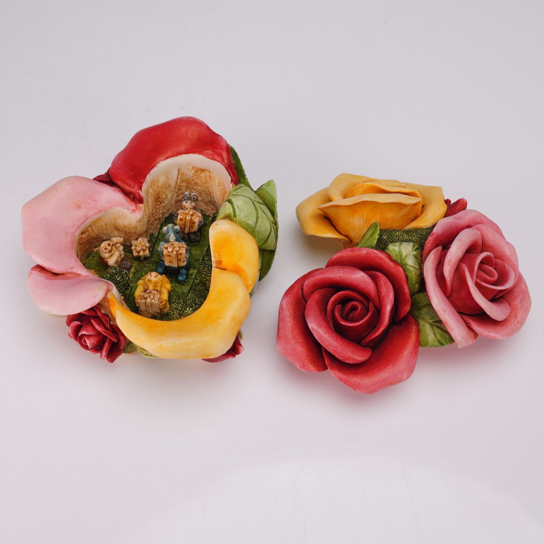 This limited-edition piece features a rose bouquet exterior with detailed red, pink, and yellow blooms and green leaves. The lid lifts to reveal Lord Byron, the ladybug, leading a parade of bug friends carrying gifts. This is noted as the first Parade of Gifts buying group exclusive. Marked Harmony Kingdom on the underside. Model number HGLEC99S.
