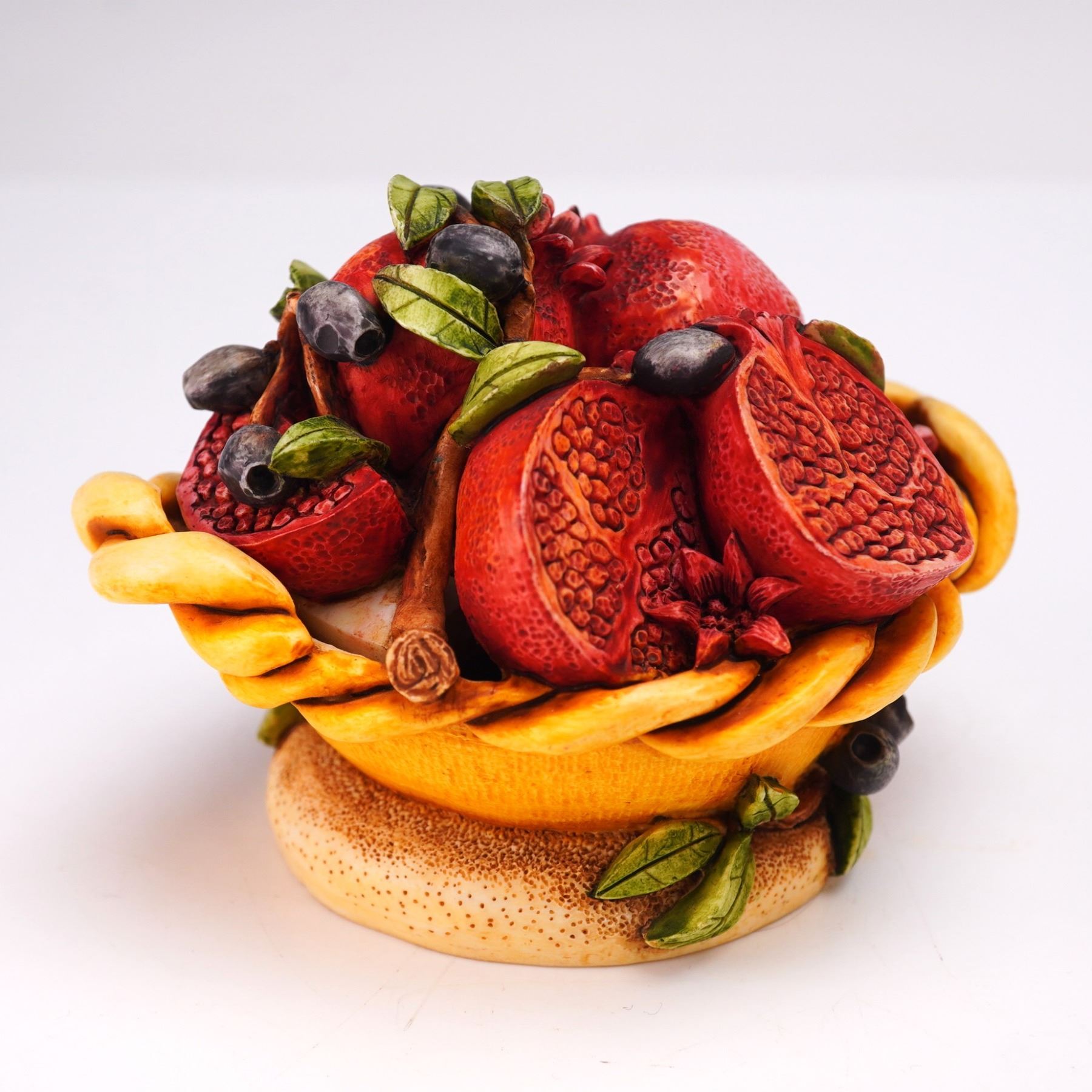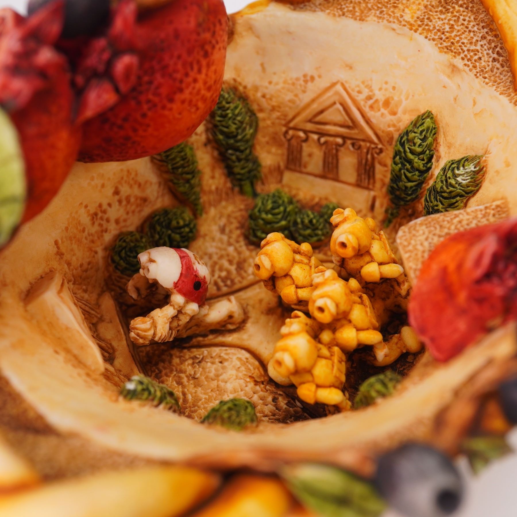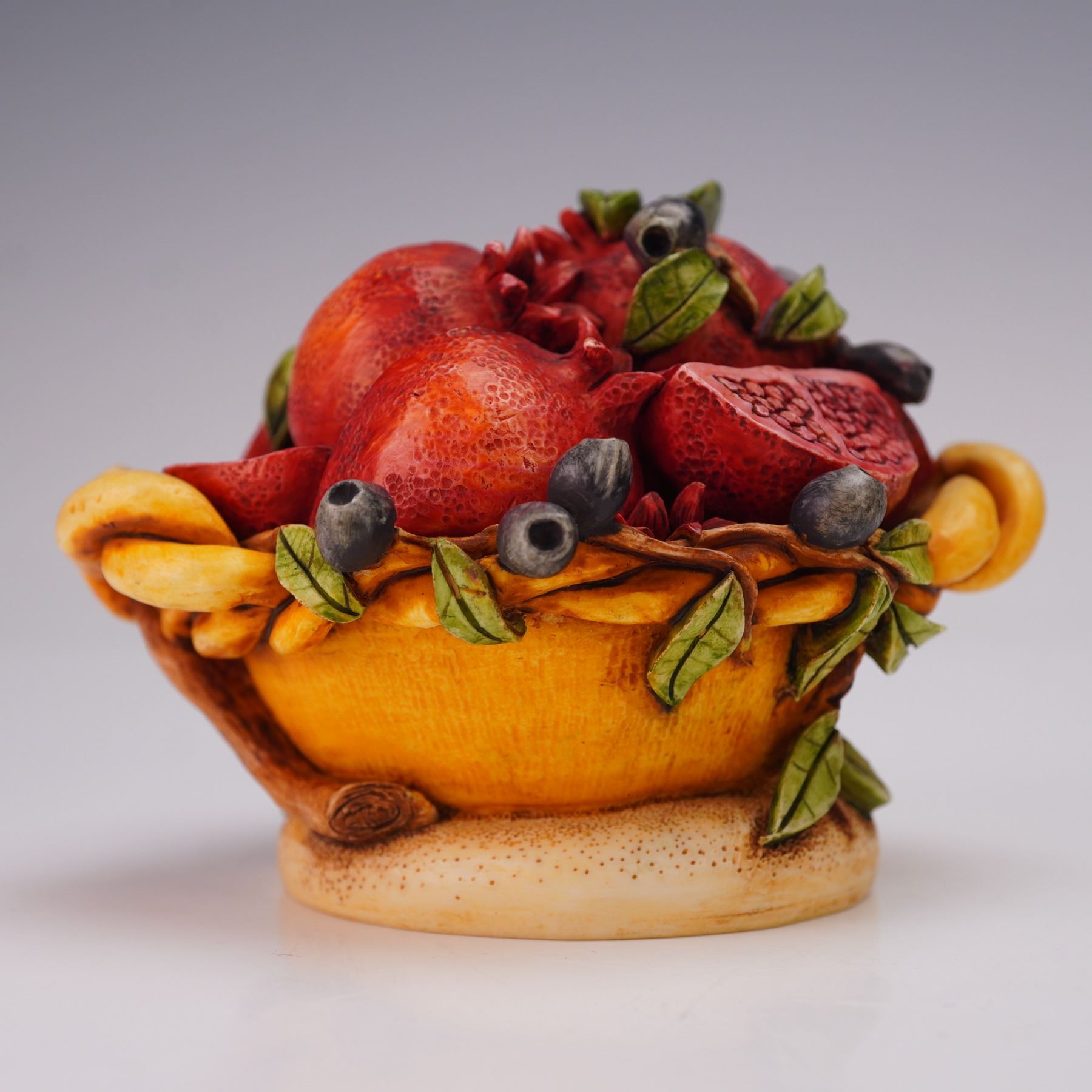 Part of the Lord Byron's Harmony Garden collection. The piece features a basket-shaped container topped with sculpted pomegranates, berries, leaves, and vines, concealing an interior scene depicting Lord Byron journeying to the Pomegranate Hills of Athens, where he is asked to carry the Olympic torch for all bugdom. The underside is marked Harmony Kingdom, and the model number is HG3PO.