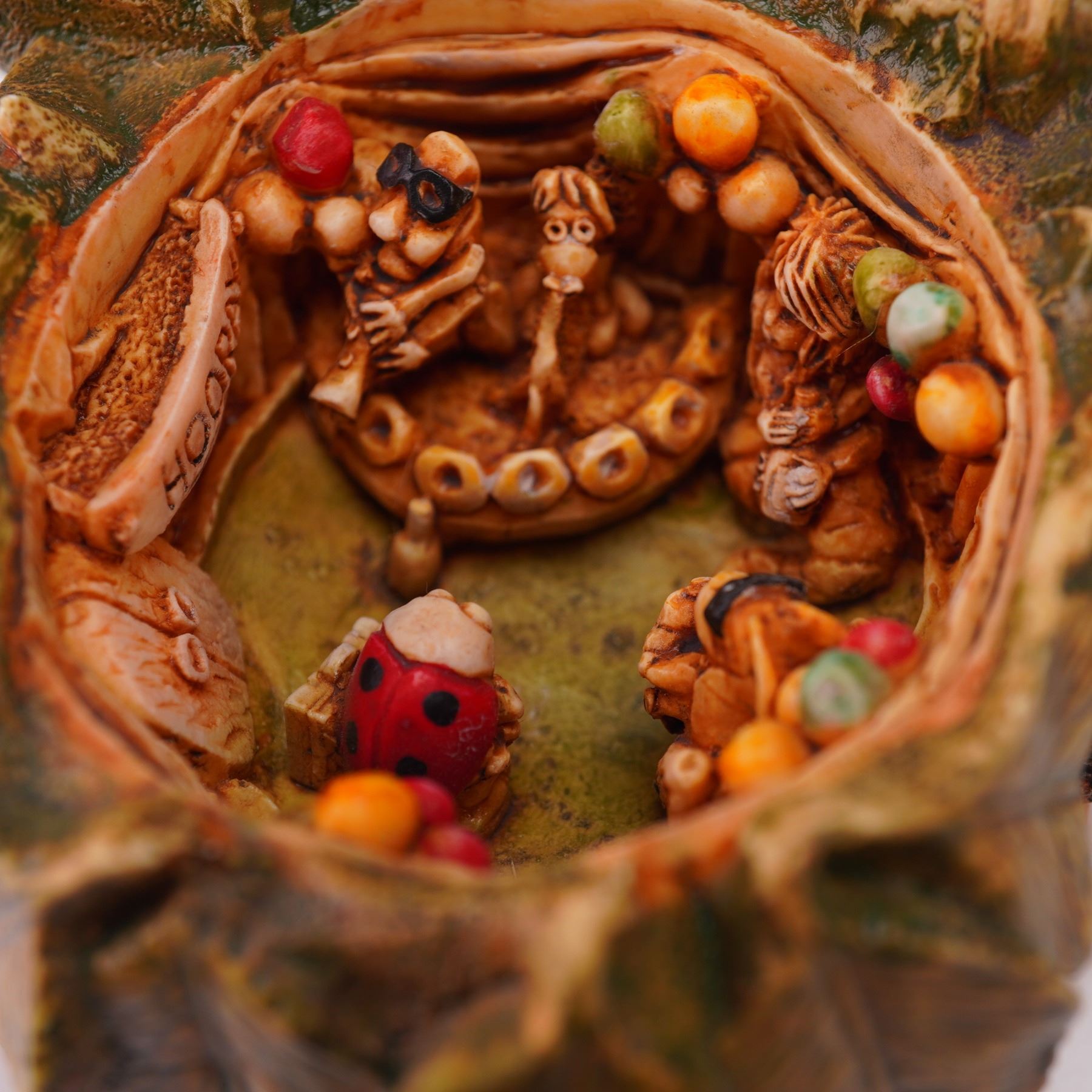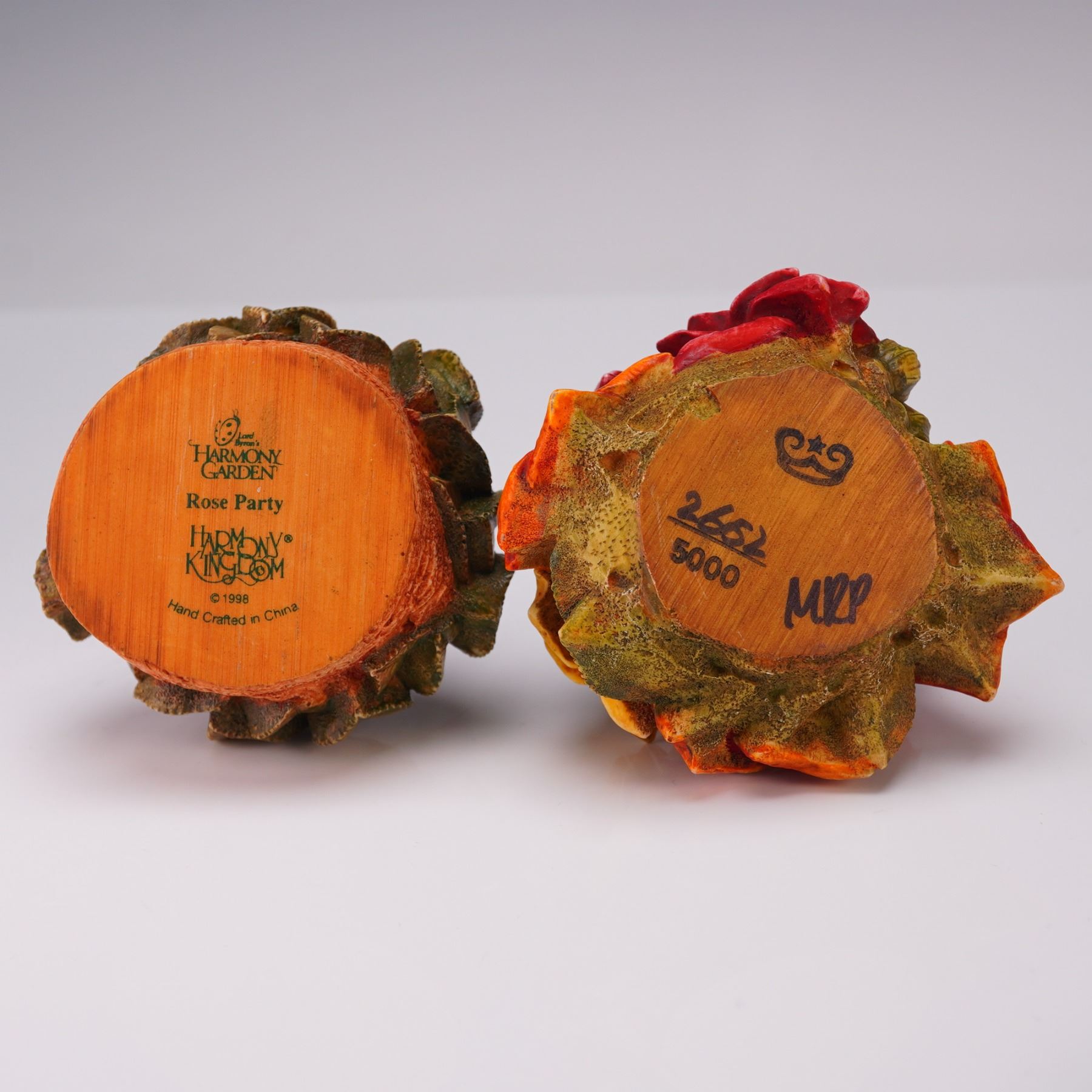 Part of the Lord Byron's Harmony Garden collection. This limited edition piece features a bouquet of roses forming the exterior of the box, while the interior reveals Lord Byron the ladybug with his friends hosting a farewell party. Model number HGLELR2, marked Harmony Kingdom on the underside.