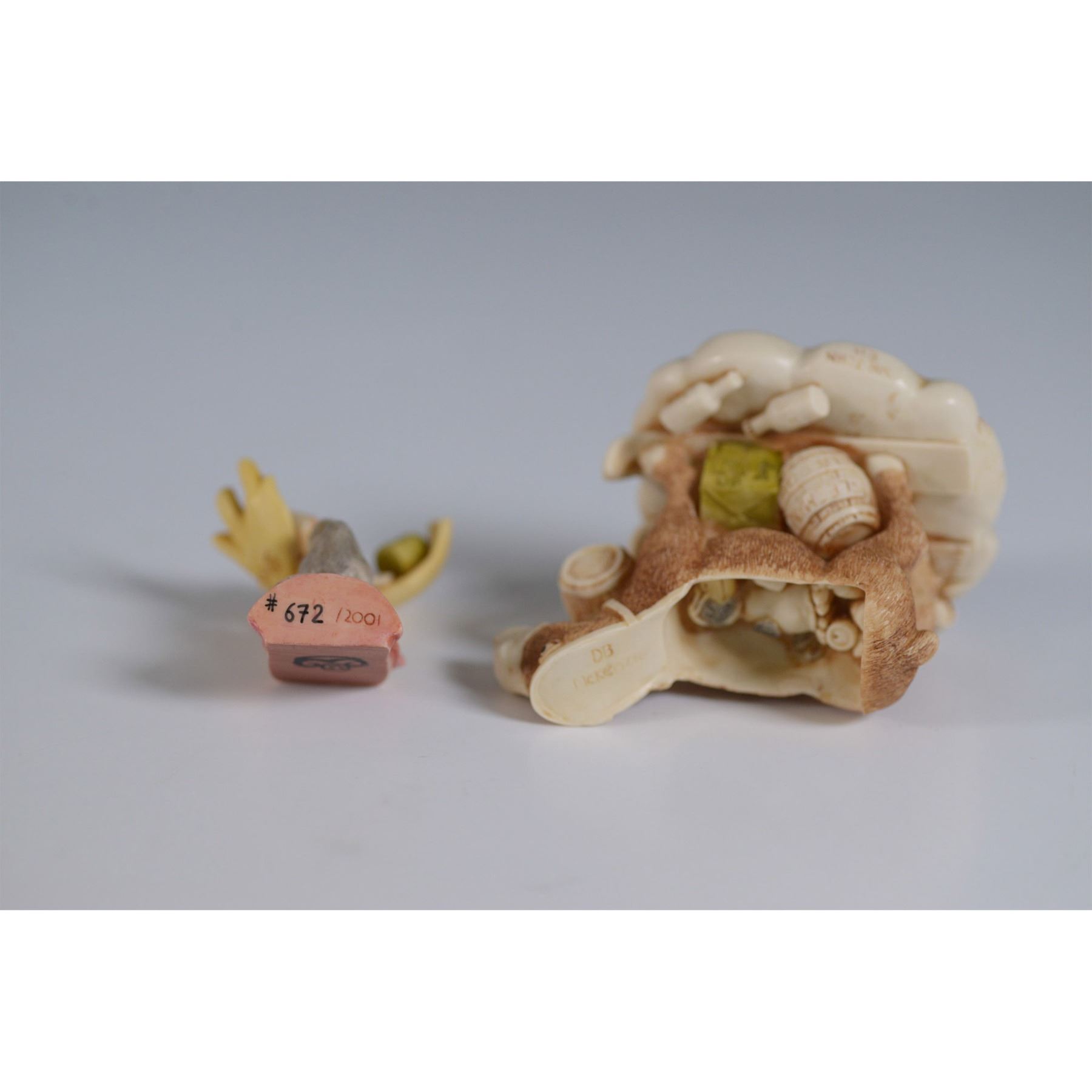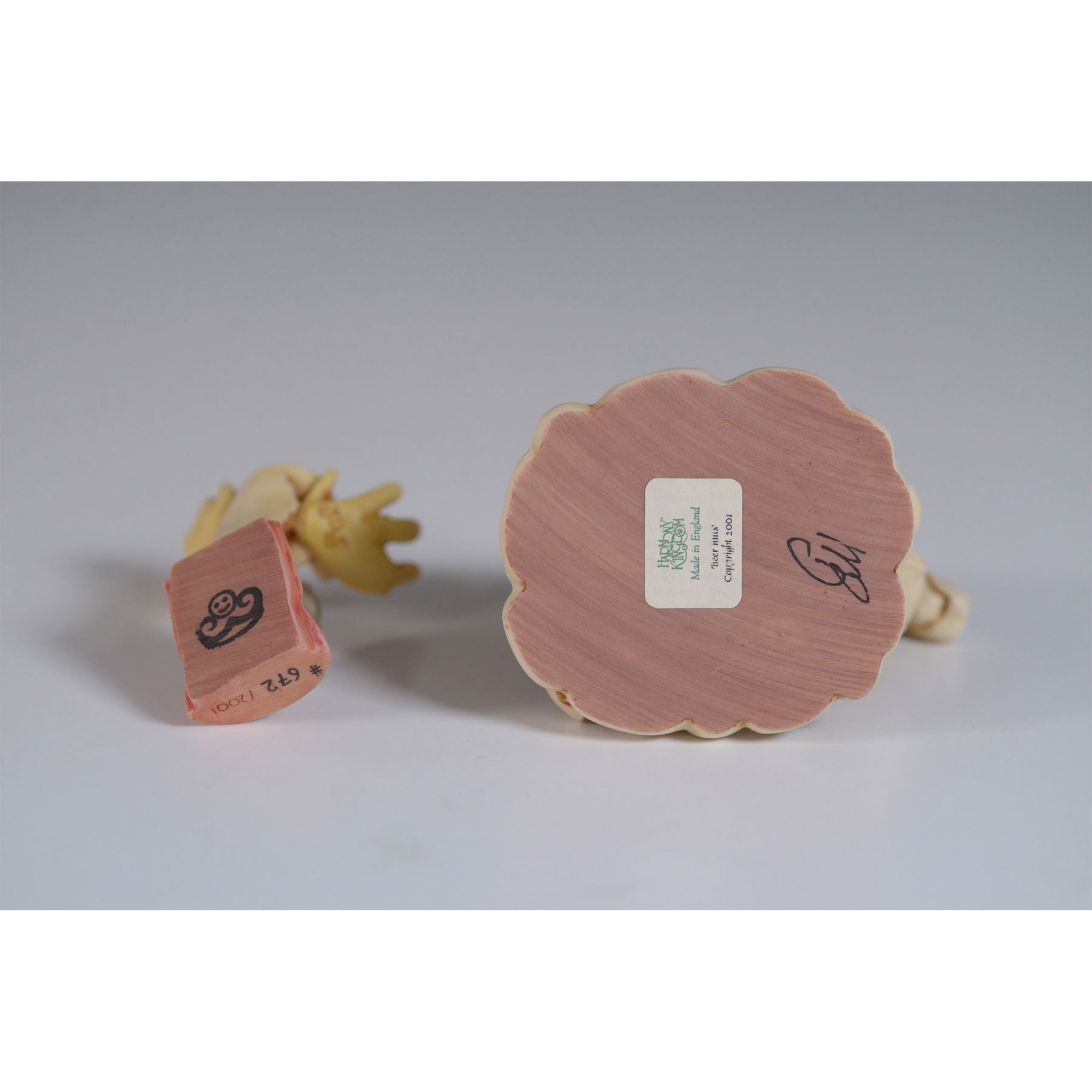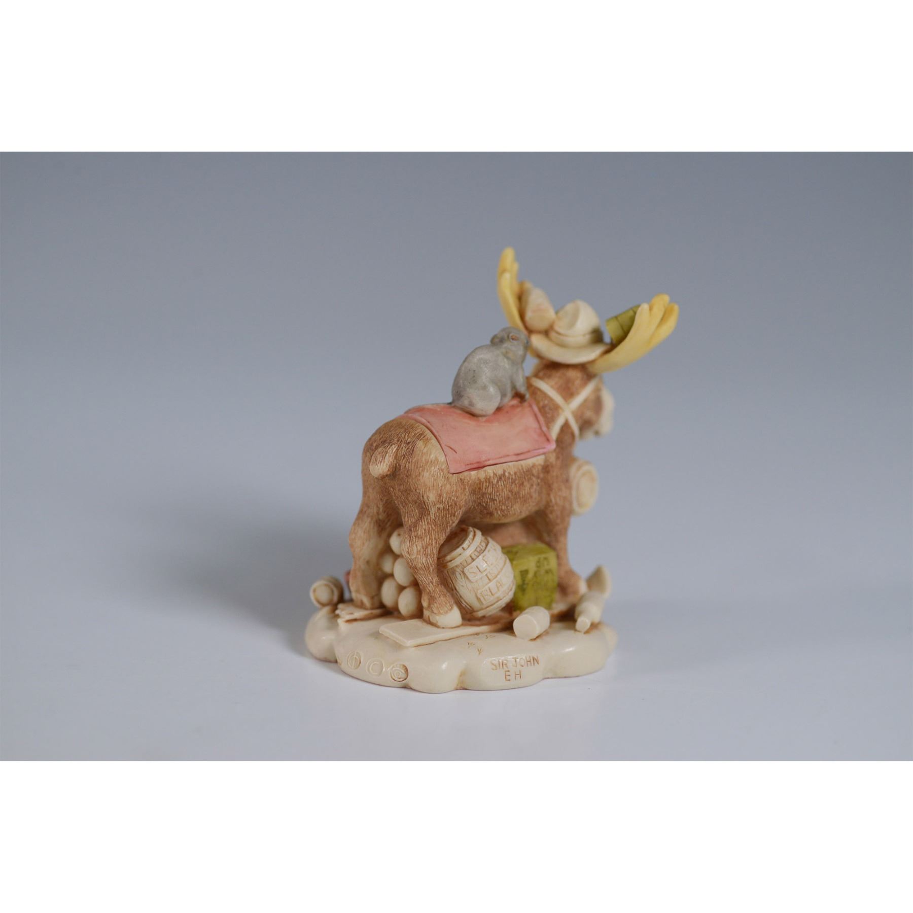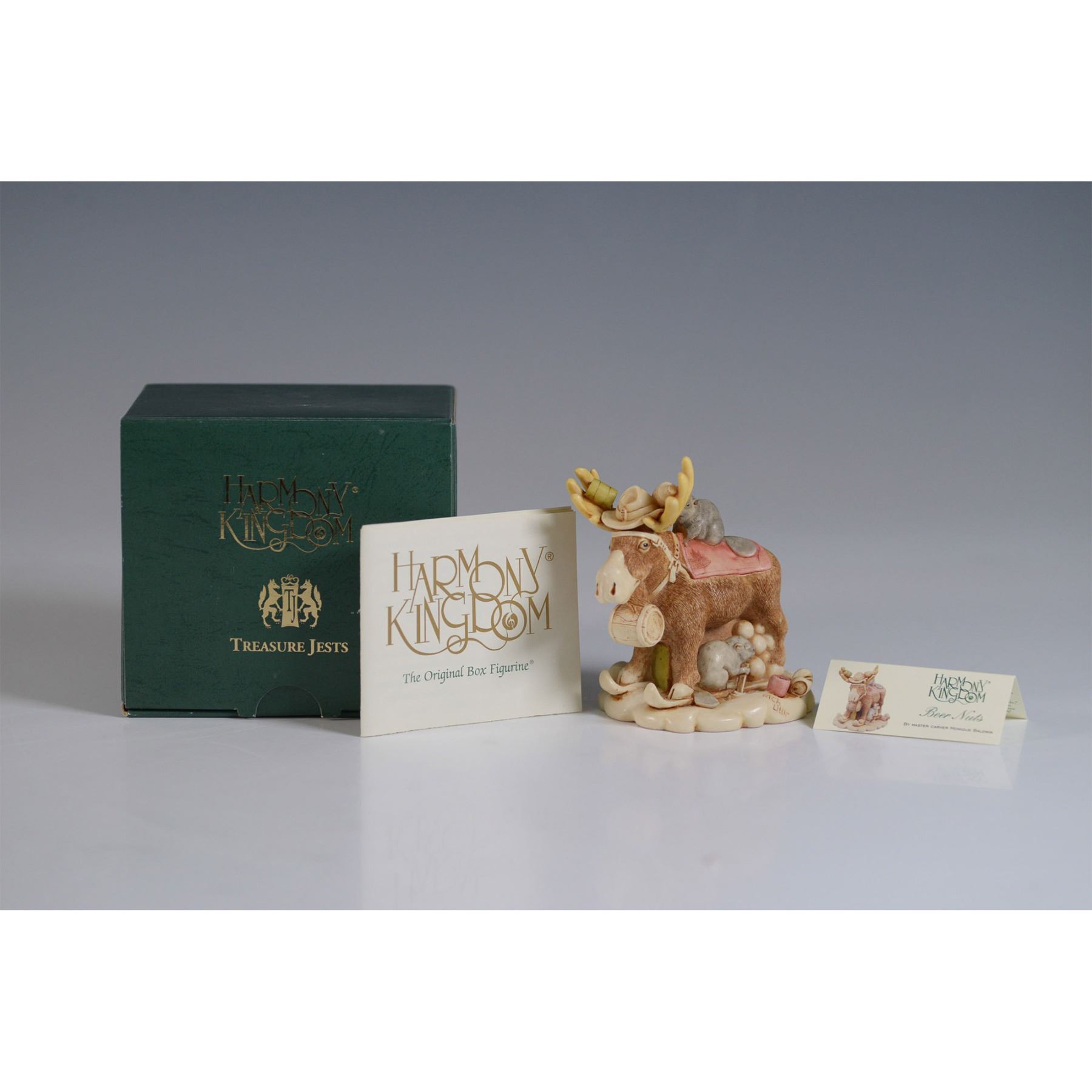 Harmony Kingdom Beer Nuts Treasure Jest figurine box, numbered 672 of 2001. This Canadian-inspired piece humorously depicts a moose carrying a beer barrel, with a cowboy hat perched on its antlers and intricate hidden details inside. Handcrafted in England from resin, it features Harmony Kingdom’s signature hidden elements and fine detailing. Marked on the base with the Harmony Kingdom backstamp and artist’s signature. Includes original box and paperwork.