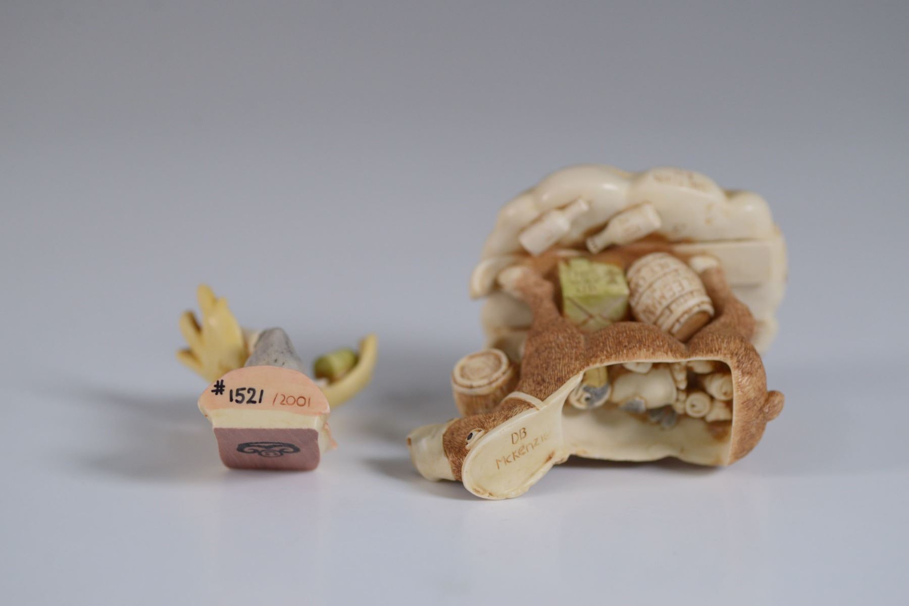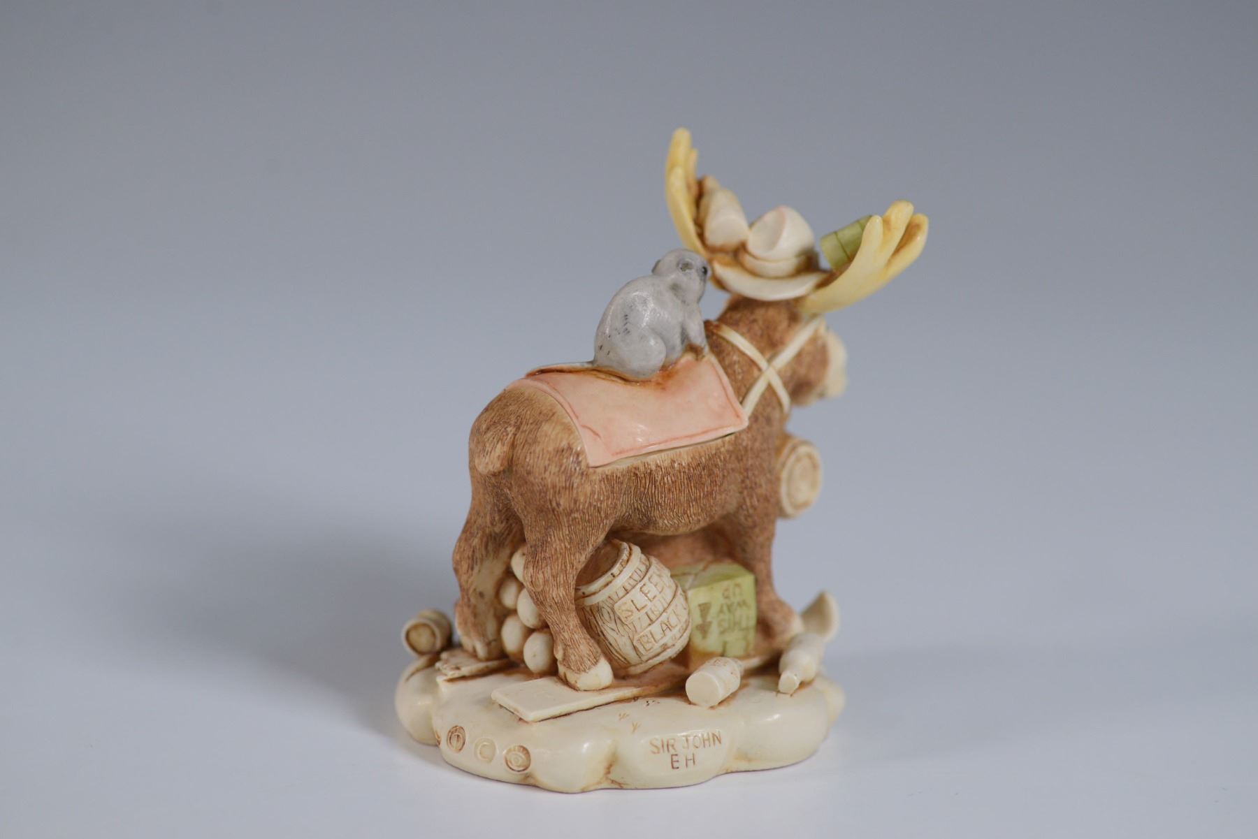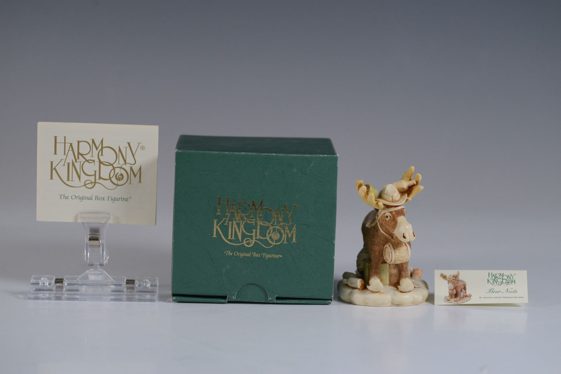 Harmony Kingdom Beer Nuts Treasure Jest figurine box, numbered 1521 of 2001. This Canadian-inspired piece humorously depicts a moose carrying a beer barrel, with a cowboy hat perched on its antlers and intricate hidden details inside. Handcrafted in England from resin, it features Harmony Kingdom's signature hidden elements and fine detailing. Marked on the base with the Harmony Kingdom backstamp and artist's signature. Includes original box and paperwork.