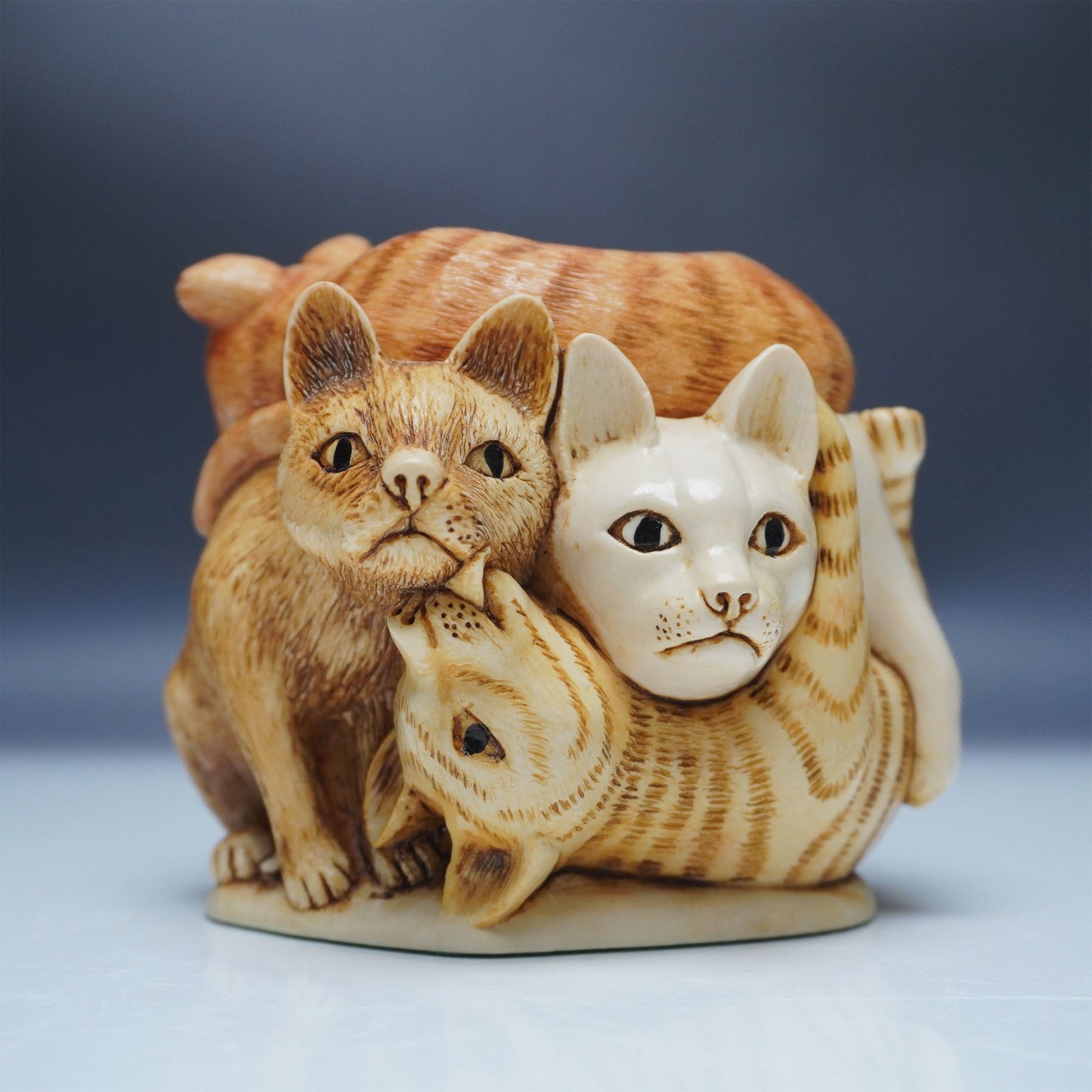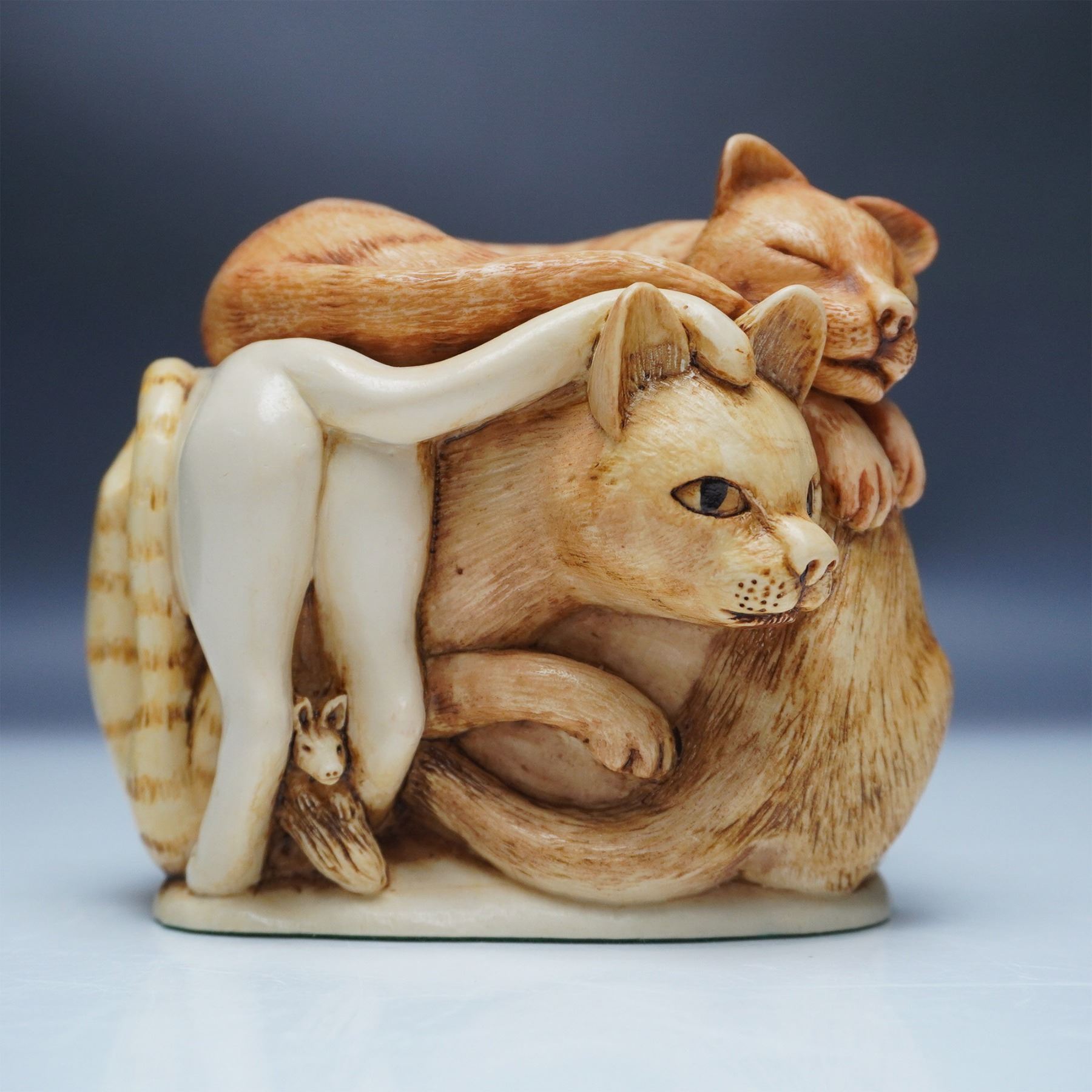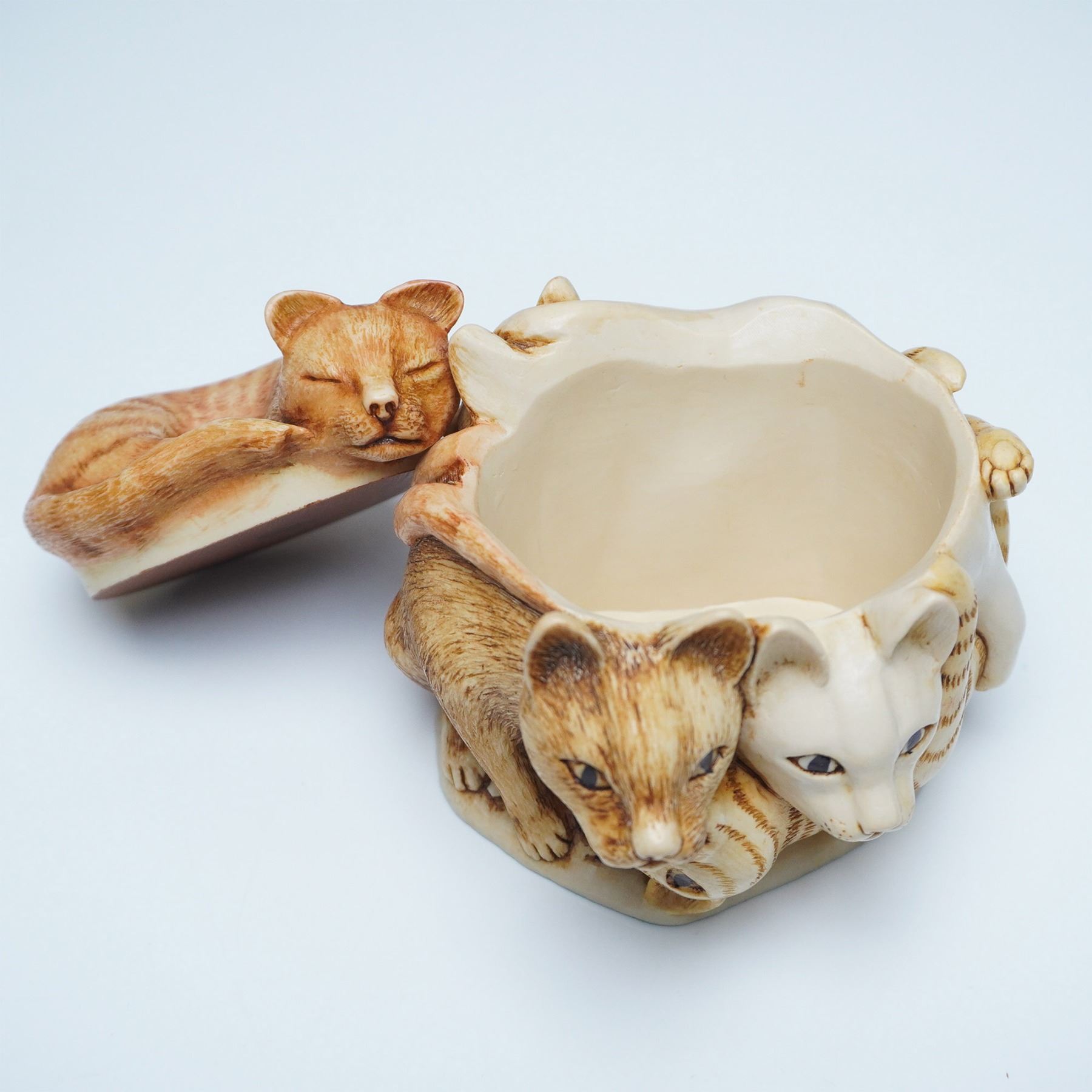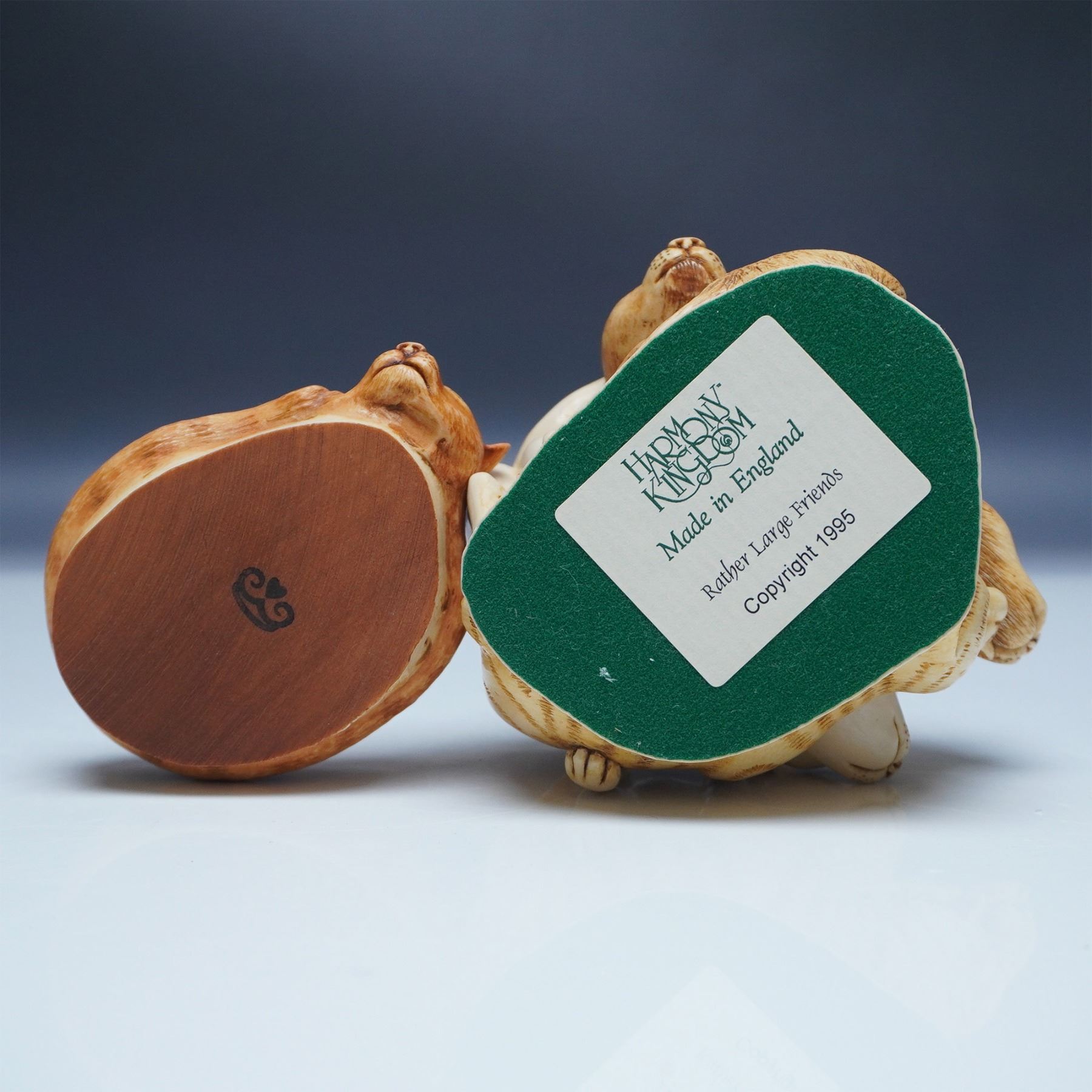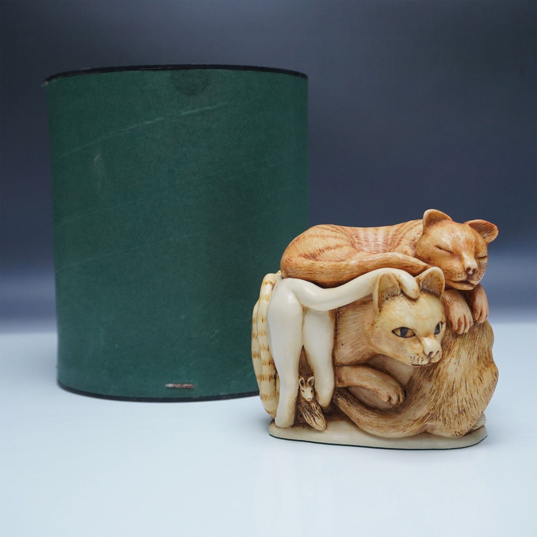 This charming Harmony Kingdom box figurine, Rather Large Friends, was crafted in England in 1995. Measuring 4"H, it showcases an intricate design featuring a group of sculpted cats in various playful and affectionate poses, embodying the brand's signature whimsical artistry. The piece is a hidden compartment box, with a removable lid revealing a hollow interior, adding a collectible and functional element. The finely detailed marble and resin material mimics the look of hand-carved antiques, making it a sought-after addition for collectors. Included is the original green storage box, measuring 6.5"H x 5.5"dia., which complements the piece while preserving its condition.