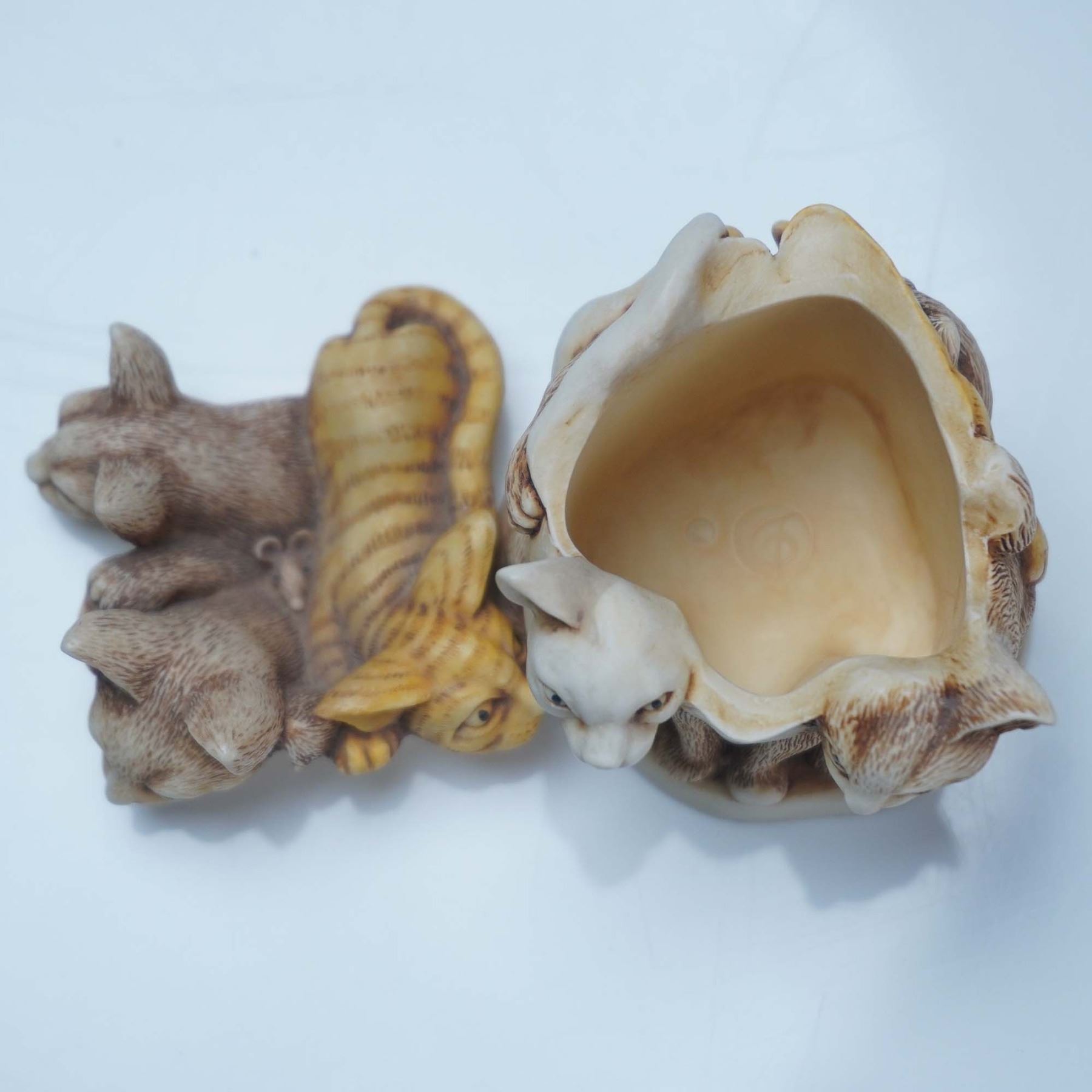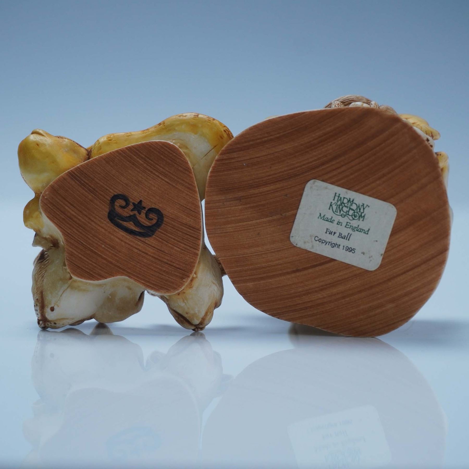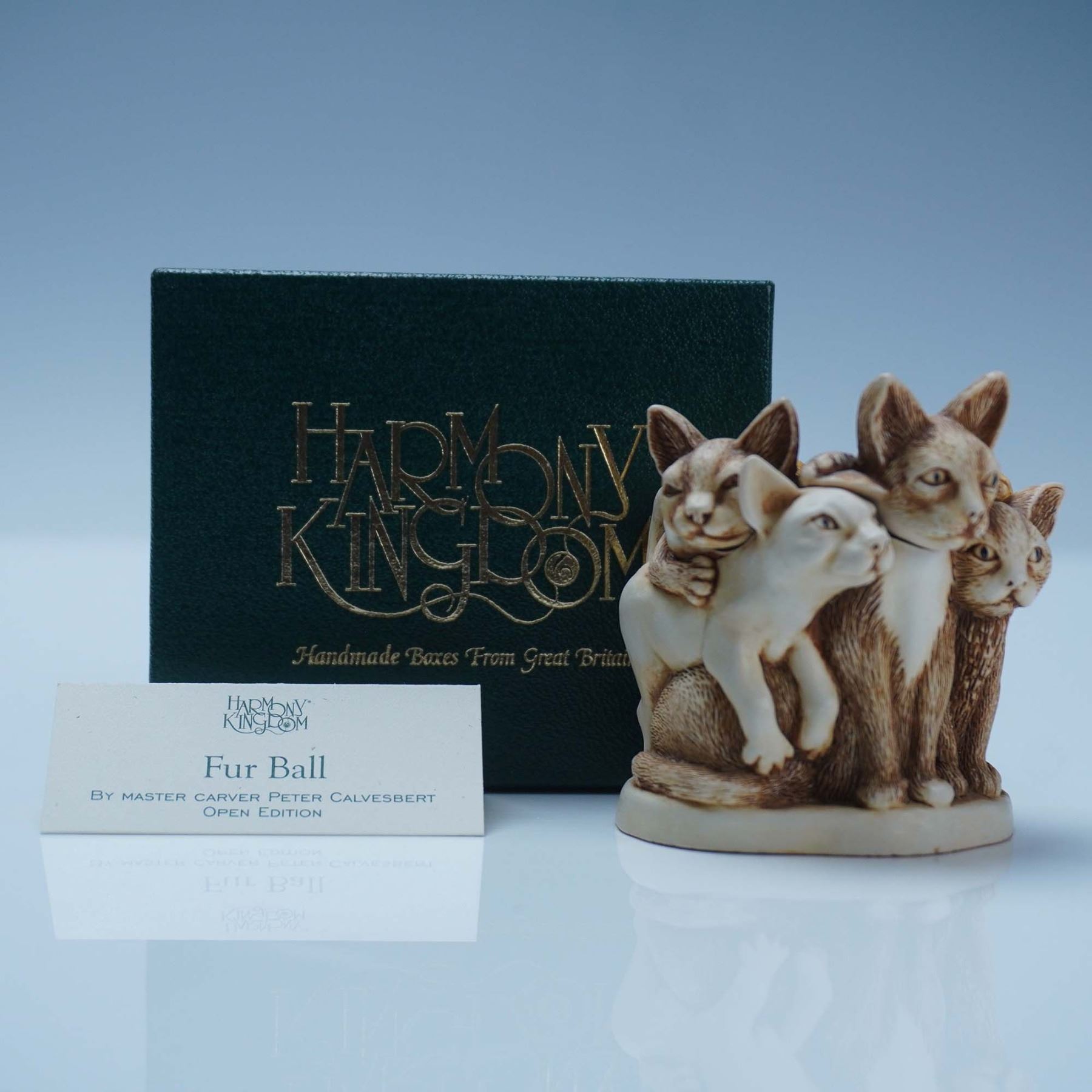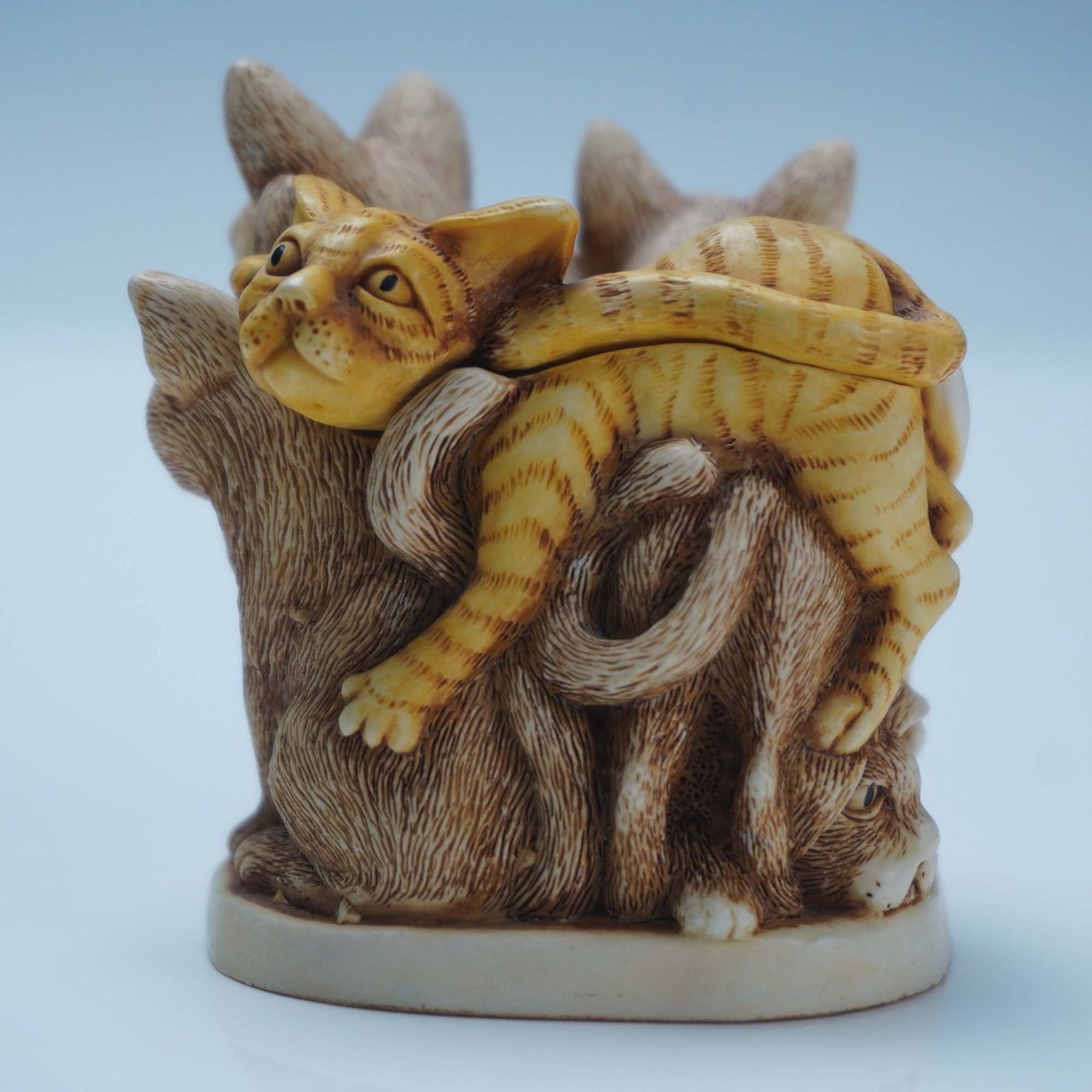 This Harmony Kingdom handmade box titled Fur Ball is an open edition carved by master carver Peter Calvesbert for Harmony Kingdom and playfully depicts four intertwined cats forming the hinged lid and base that neatly opens to reveal a hidden compartment. The detailed sculpting and warm biscuit-glaze patina showcase the whimsy and craftsmanship that Harmony Kingdom is known for, and it includes its original green Harmony Kingdom presentation box. Approximately 2.5"L x 2.5"H for the figural box and its original box measures 3.5"L x 2.5"H.
