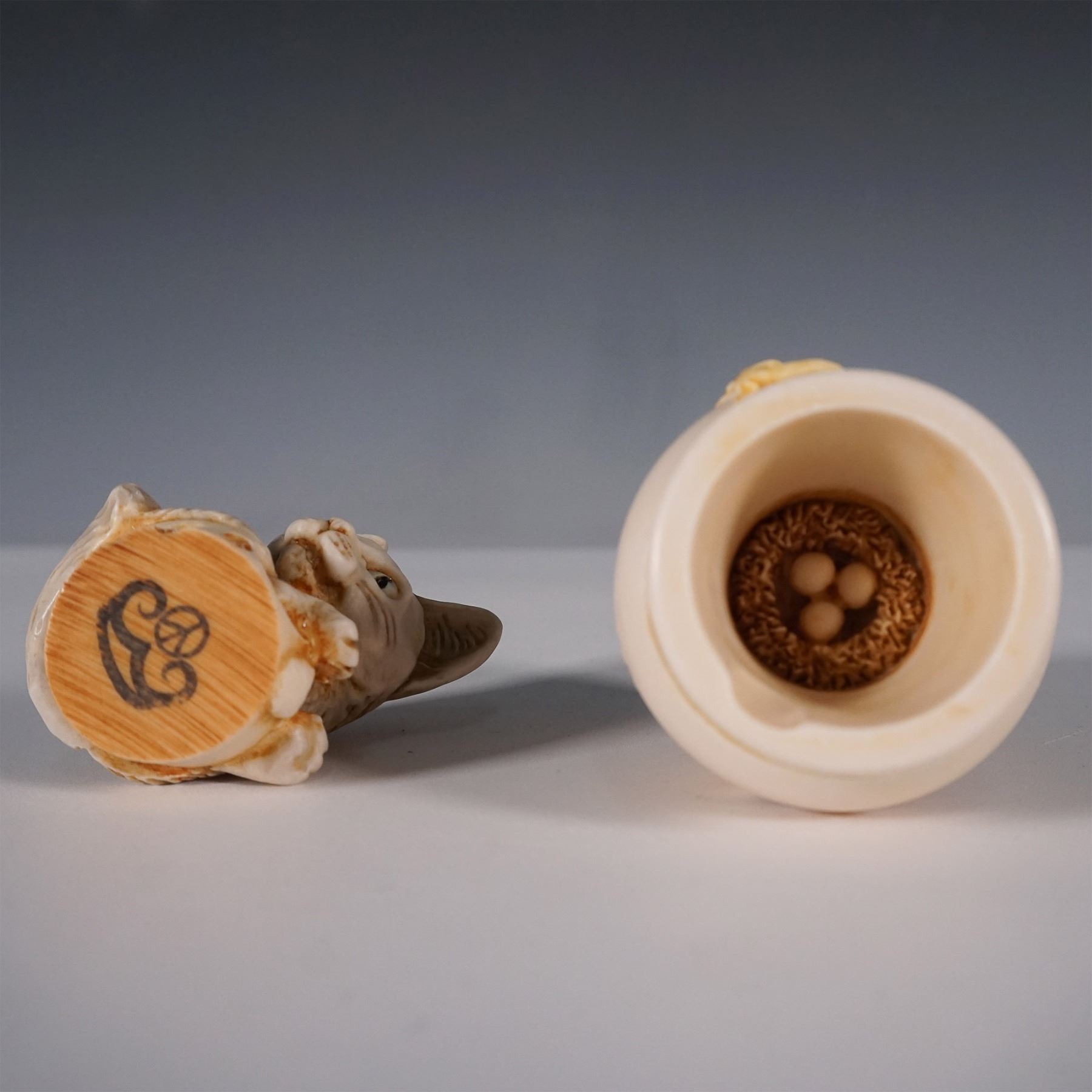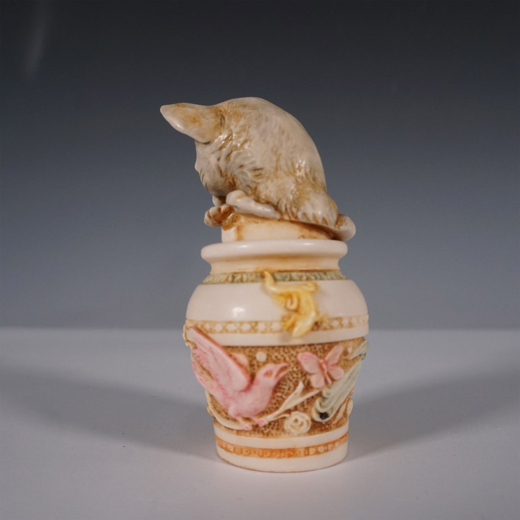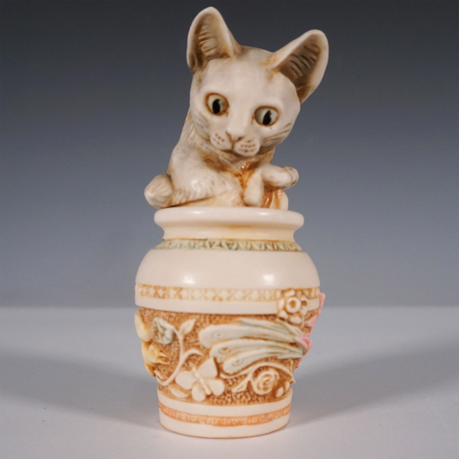 A charming Harmony Kingdom collectible ring box titled "Jardinia," featuring a finely sculpted cat playfully peeking out of an ornate vase. Crafted in England, this intricately detailed piece showcases floral and butterfly relief decorations in soft pastel hues. The hidden interior reveals a delightful surprise, characteristic of Harmony Kingdom's whimsical designs. Measures 3.25"H. Includes original Harmony Kingdom box measuring 4"L x 3"W x 3.75"H, along with the pamphlet.