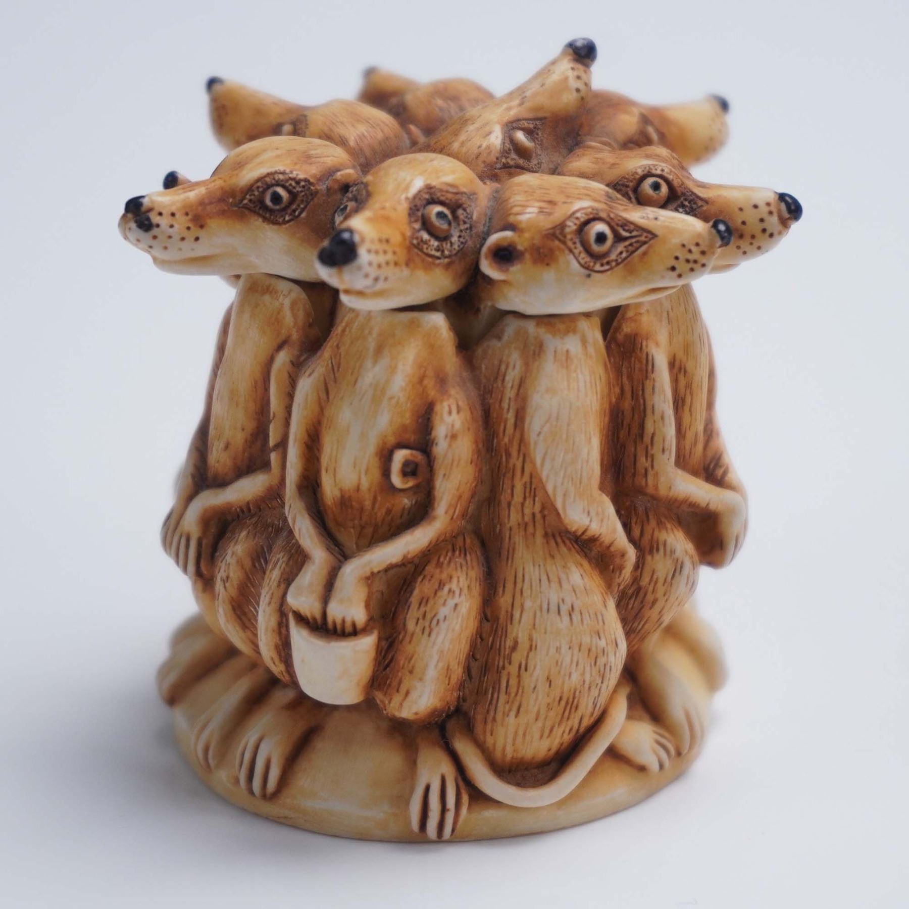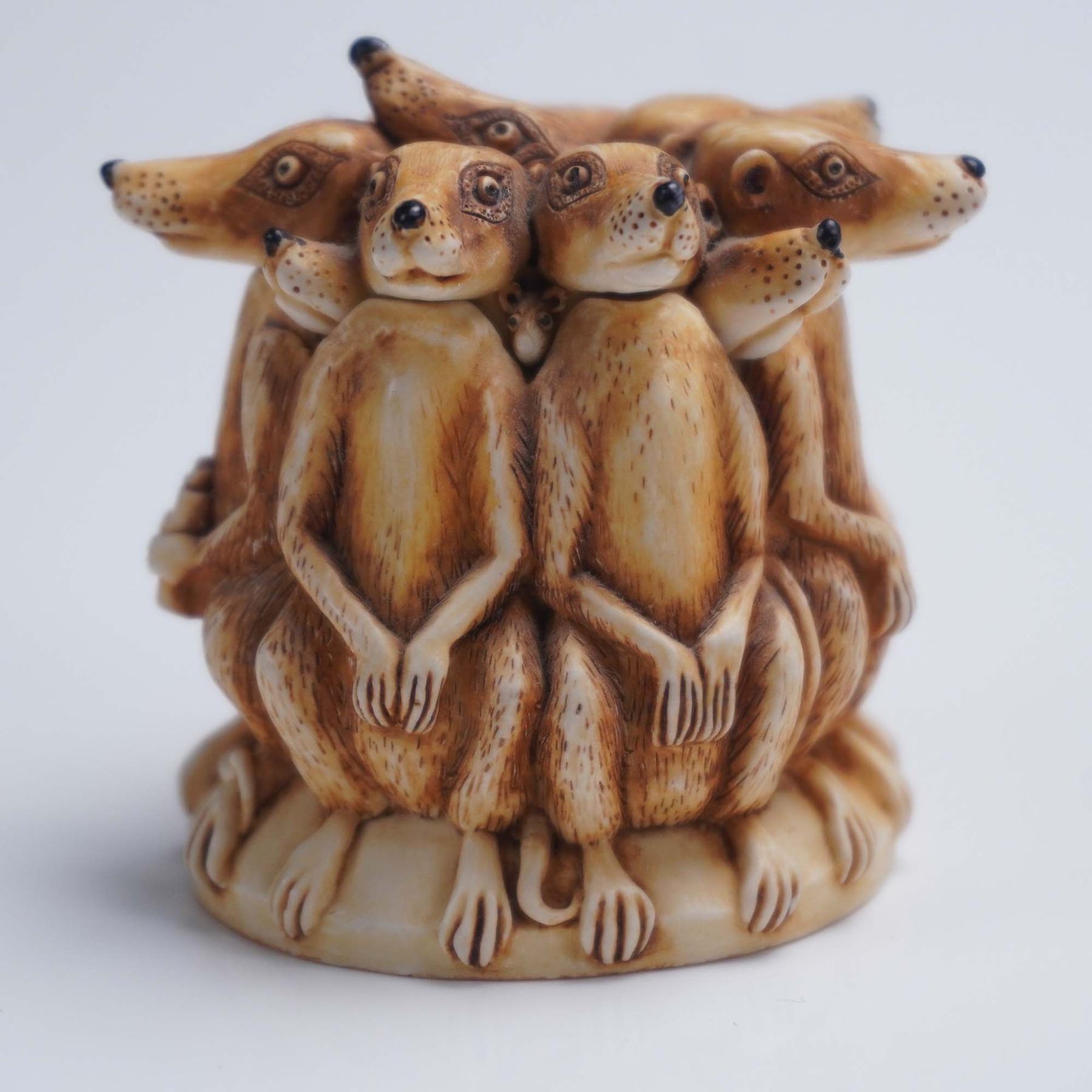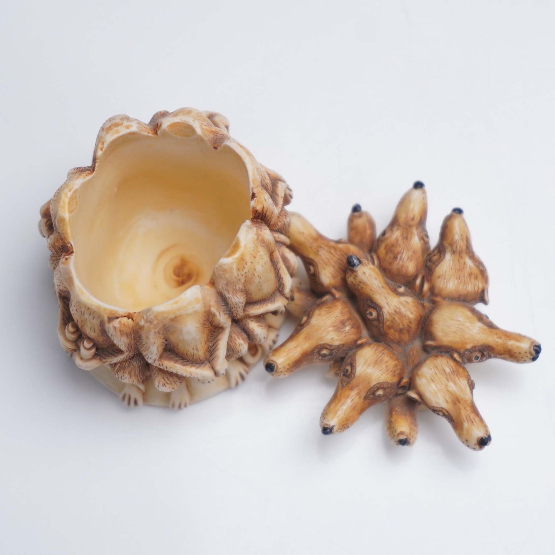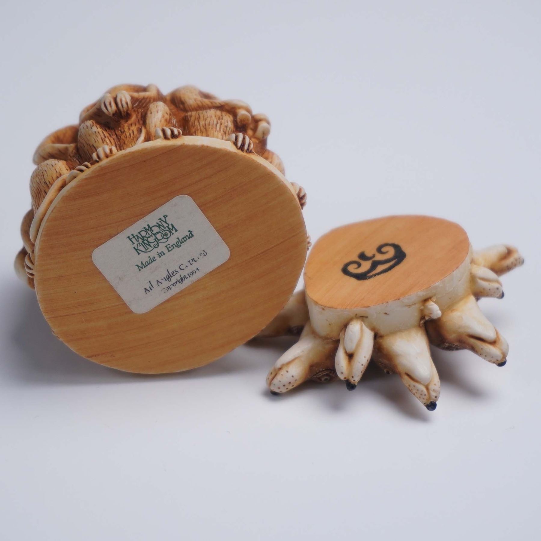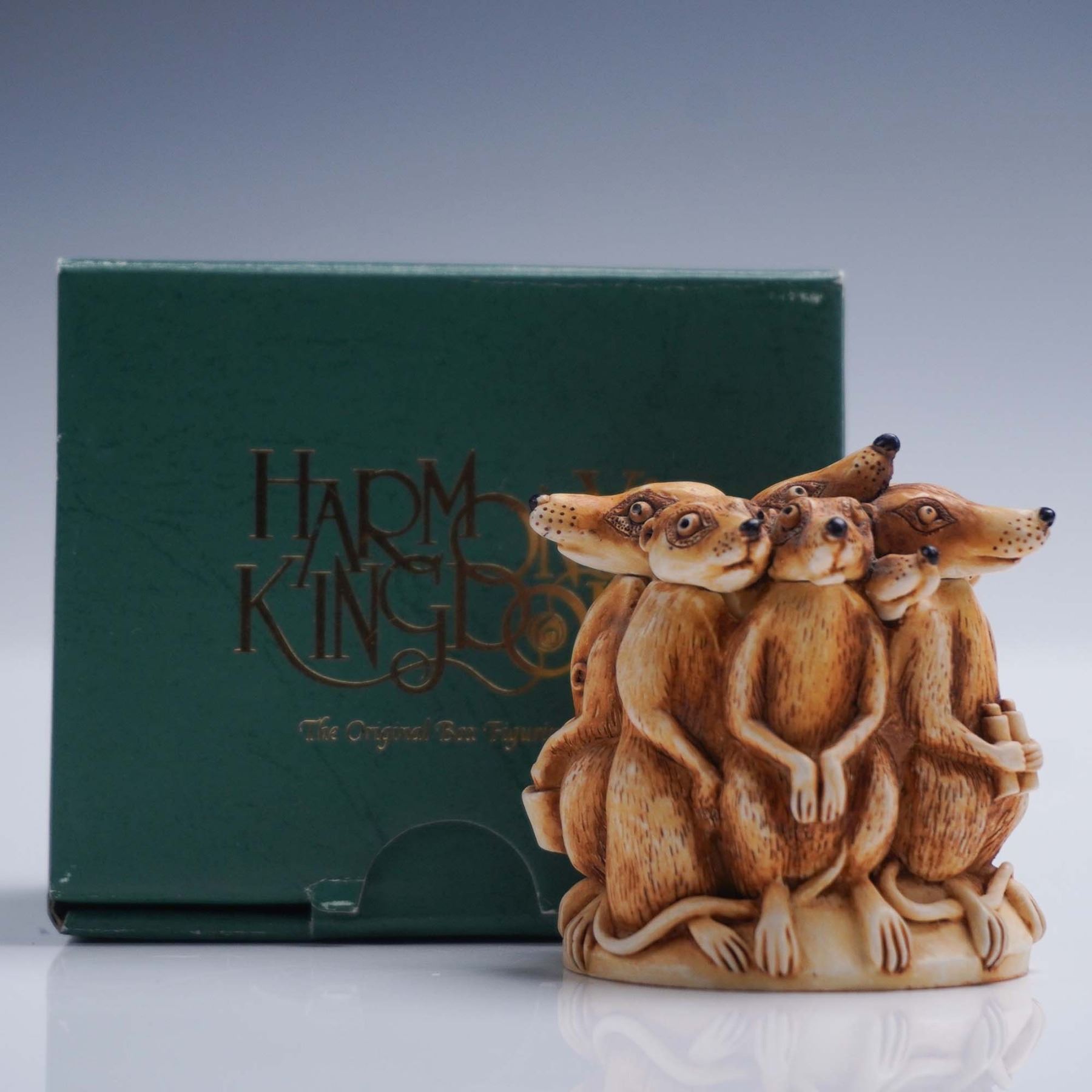 This Harmony Kingdom jewelry box titled All Angles Covered is a clever and intricately sculpted piece featuring a tight circle of meerkats standing back to back, each one alert and equipped for lookout duty. One clutches a pair of binoculars, while all have watchful expressions and long tails wrapped around the base. The lid lifts off to reveal a hidden compartment inside, ideal for storing small keepsakes. The underside of the lid bears the Harmony Kingdom crown hallmark, and the base includes a label identifying the piece as All Angles Covered, made in England. Complete with its original green box, this collectible exemplifies the humor and craftsmanship that define the Harmony Kingdom style. Harmony Kingdom backstamp. This item has its original box. Box measures: 3.5"L x 3"W x 2.5"H.