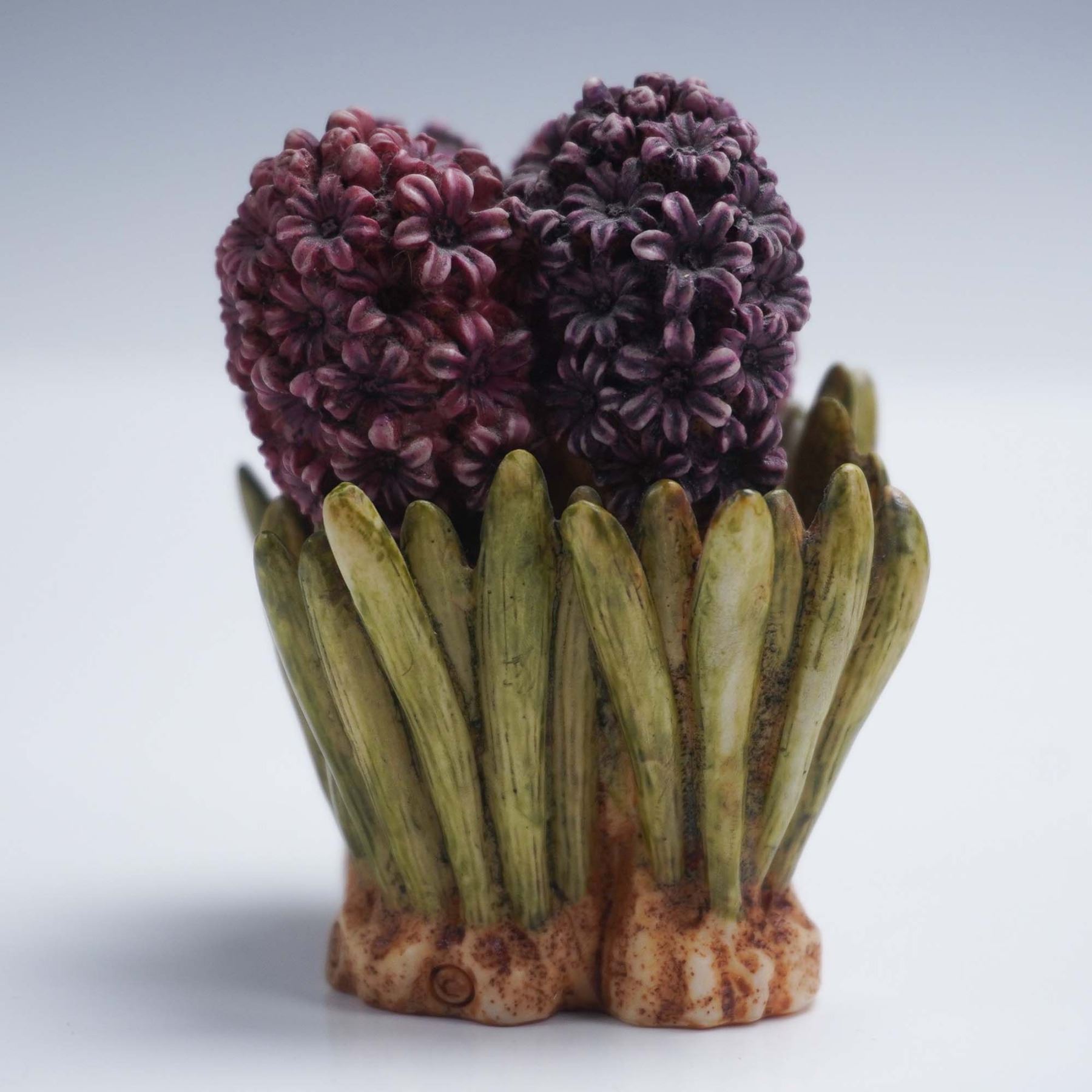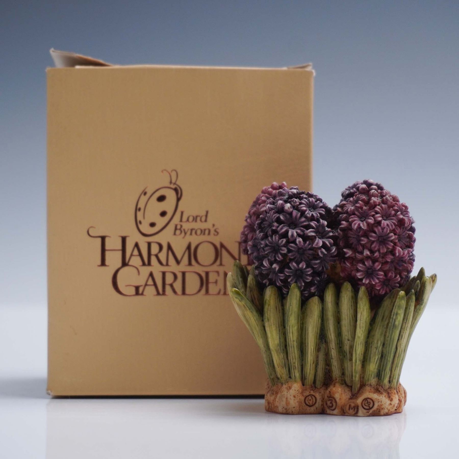 This Harmony Kingdom jewelry box titled Hyacinth is a vibrant piece from Lord Byrons Harmony Garden series. The design features a cluster of rich purple and burgundy hyacinth blooms emerging from a base of long green leaves, sculpted with remarkable texture and hand painted detail. The removable floral top reveals a hidden compartment where a playful miniature vignette shows a ladybug lifting weights in a tiny gym setting. The underside of the lid bears the Harmony Kingdom crown hallmark, while the base is marked Hyacinth and dated 1997. Includes the original Harmony Garden box, making this a complete and charming collectible. Harmony Kingdom backstamp. This item has its original box. Box measures: 3.25"L x 3"W x 4.25"H.