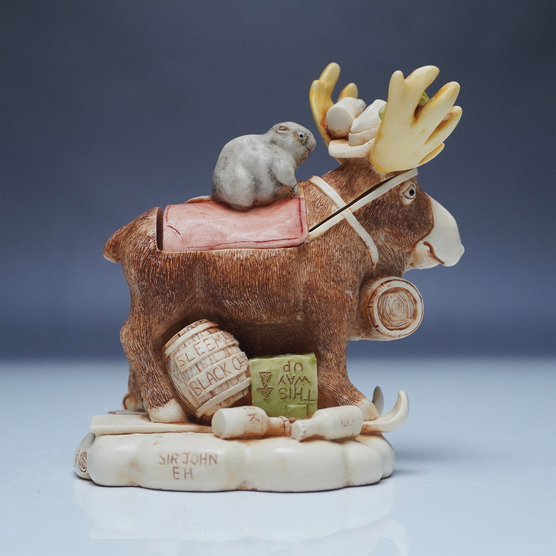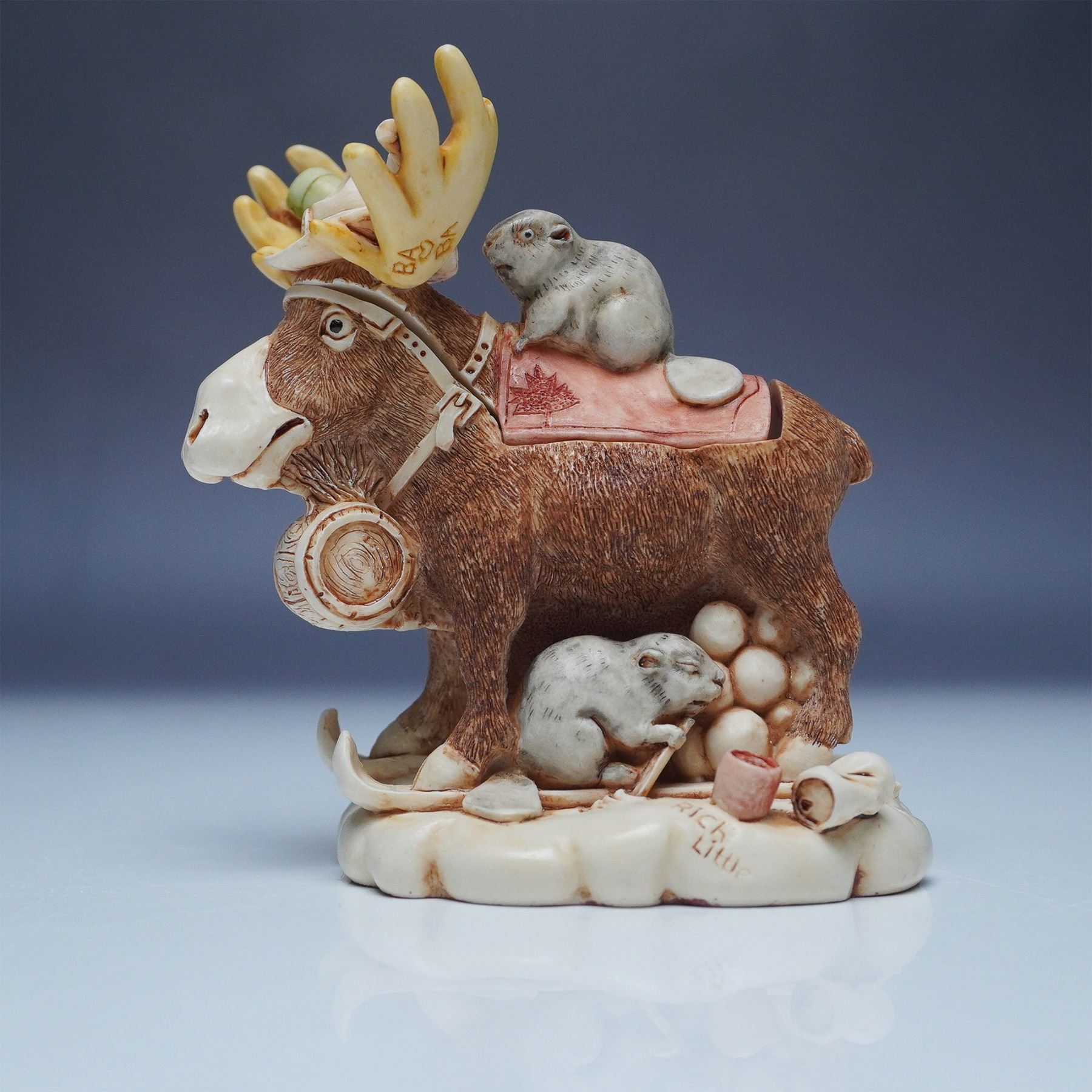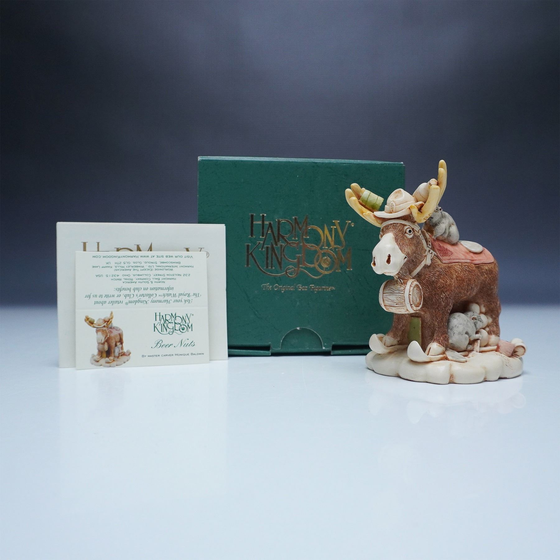 This is a limited edition Harmony Kingdom box figurine titled Beer Nuts, crafted in England and copyrighted in 2001. This whimsical piece features a moose adorned with camping gear, accompanied by playful critters, showcasing Harmony Kingdom's signature attention to detail and charm. The figurine opens to reveal a hidden compartment, a hallmark of the brand's collectible box figurines. This limited edition piece includes its original box and certificate, enhancing its value to collectors.