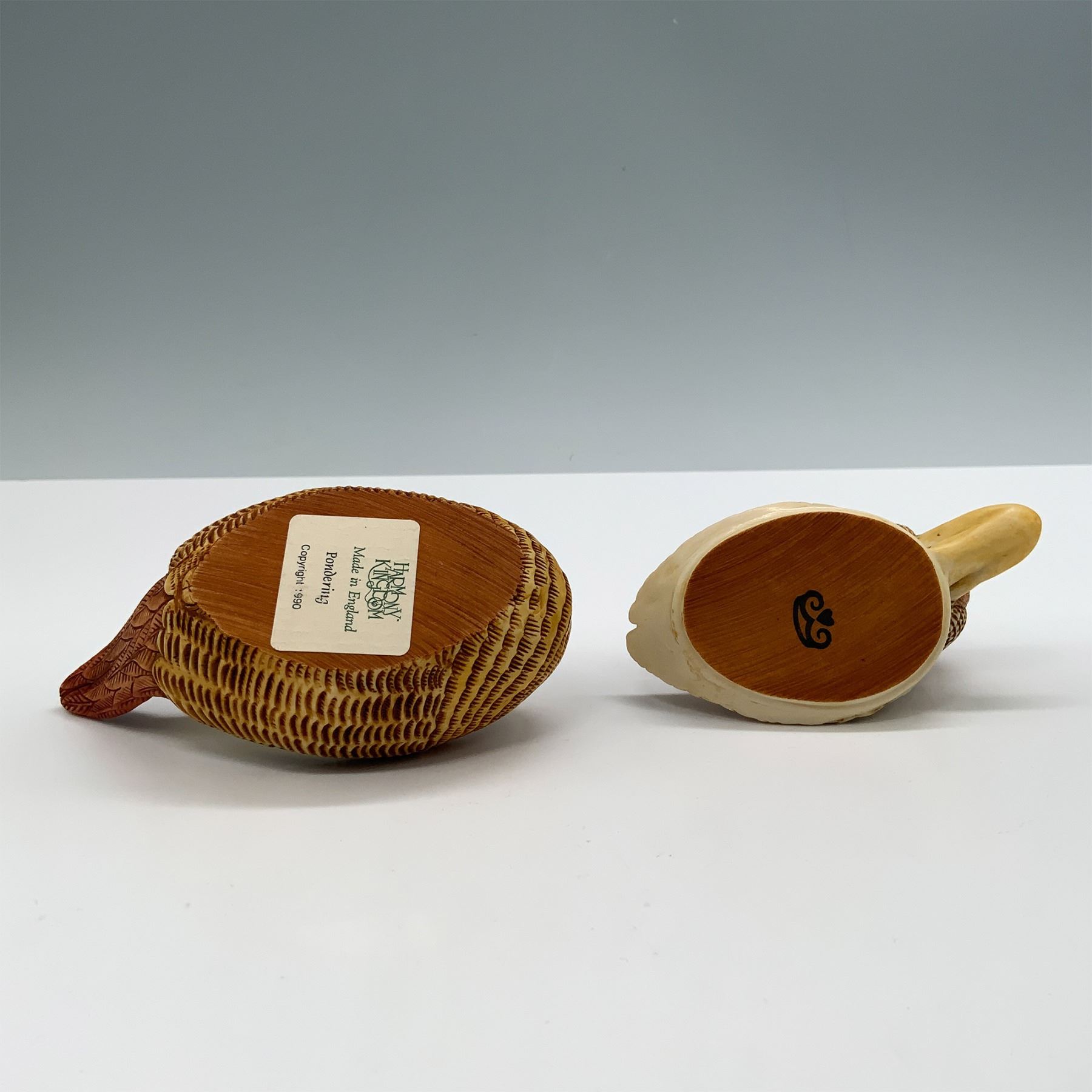 A finely detailed Harmony Kingdom treasure box titled "Pondering," crafted in the form of a mallard duck. Produced in England in 1990, this collectible features intricate hand-painted feather details and a removable head that reveals a hidden compartment. Marked with the Harmony Kingdom insignia on the underside and accompanied by a label indicating its origin. This piece exemplifies the whimsical artistry for which Harmony Kingdom is renowned.