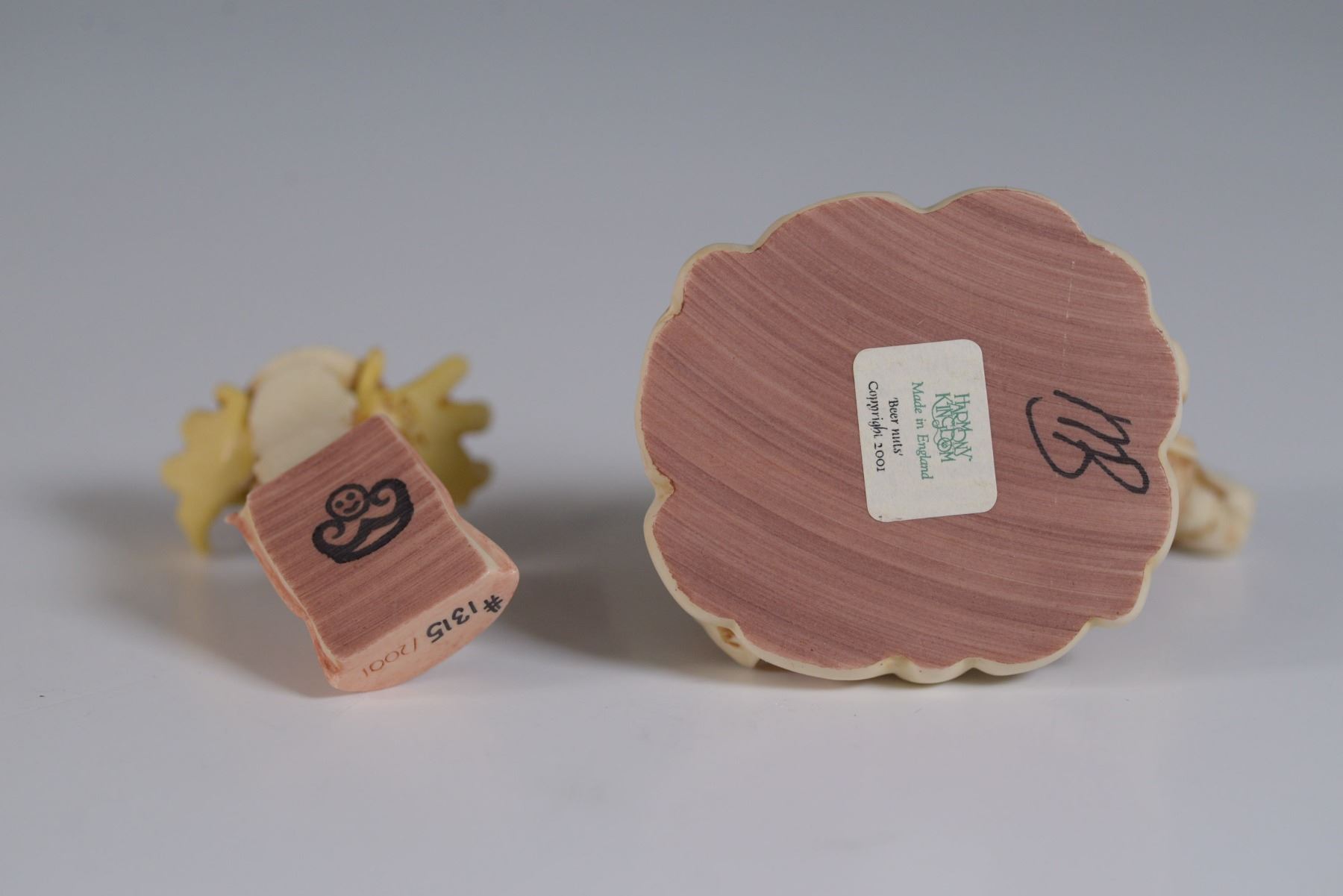 This charming Harmony Kingdom "Beer Nuts" figurine features a moose adorned with a hat and carrying barrels, a whimsical addition to any collection. Designed by master carver Monica Baldwin, this piece is a limited edition, numbered #1103 of 2001. The figurine is made of resin and stands 3.25"H, with the box measuring 3.5"H. It comes with its original box and certificate of authenticity. The backstamp includes the signature of the artist, Monica Baldwin, ensuring its authenticity.