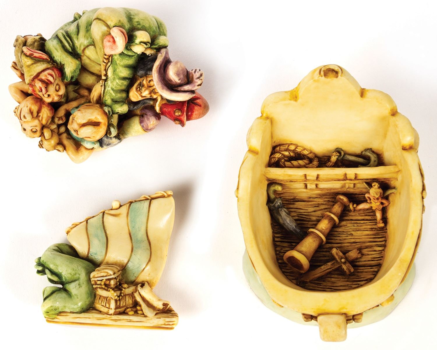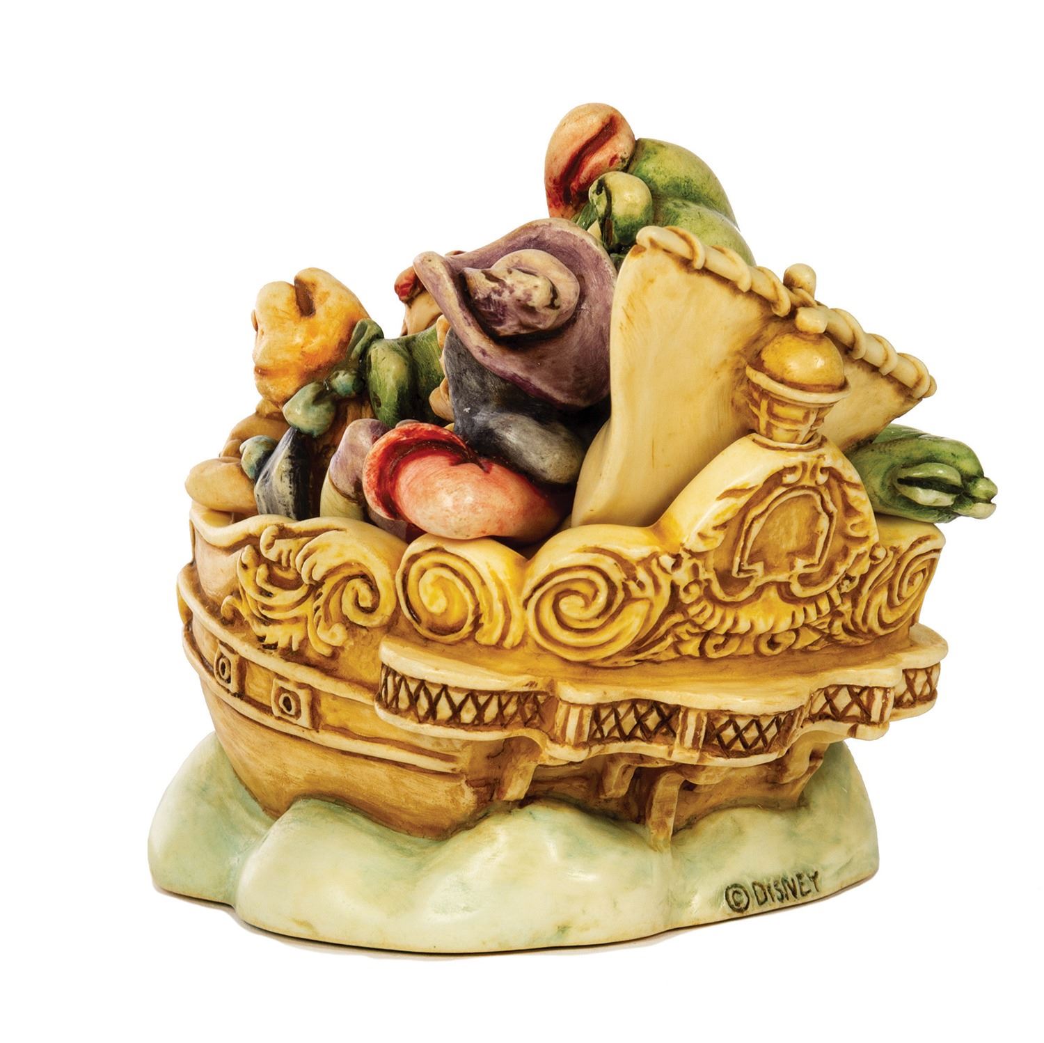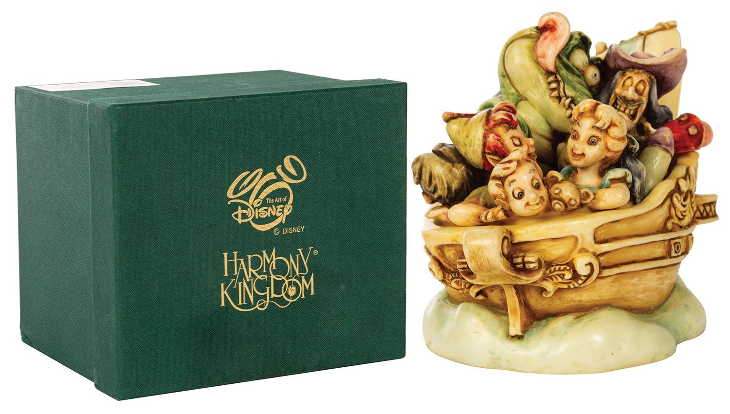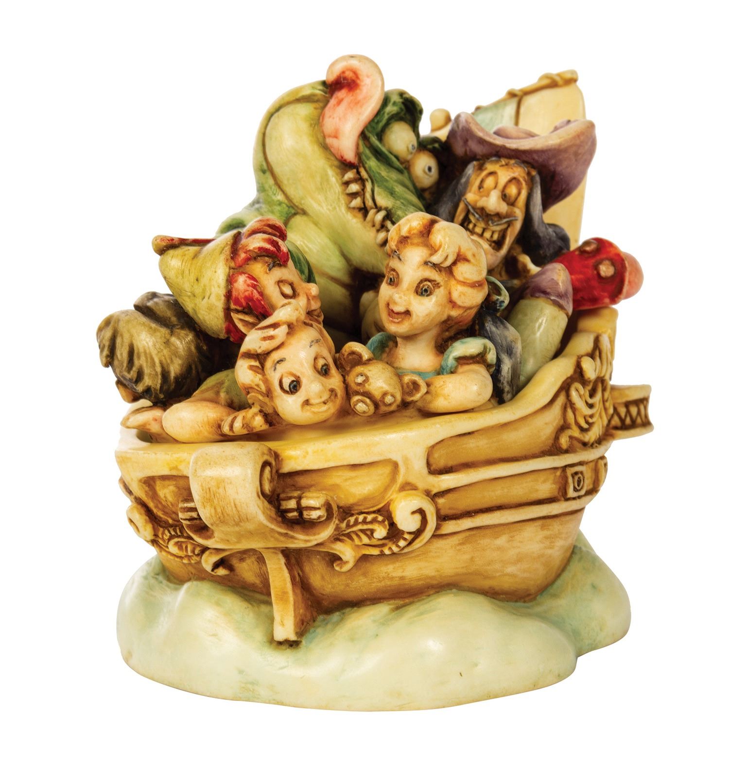 (Disneyland, 2001) A trinket box inspired by the animated film Peter Pan titled, "Off to Neverland." The two-part lid depicts Captain Hook, Tic-Toc, John, Wendy, Michael, and Peter, and opens to reveal Tinker Bell inside the Jolly Roger. The sculpture is cast in crushed marble. Measuring 5"x3" and 4" tall, the trinket box is in very fine condition and comes in its original box from The Art of Disney.