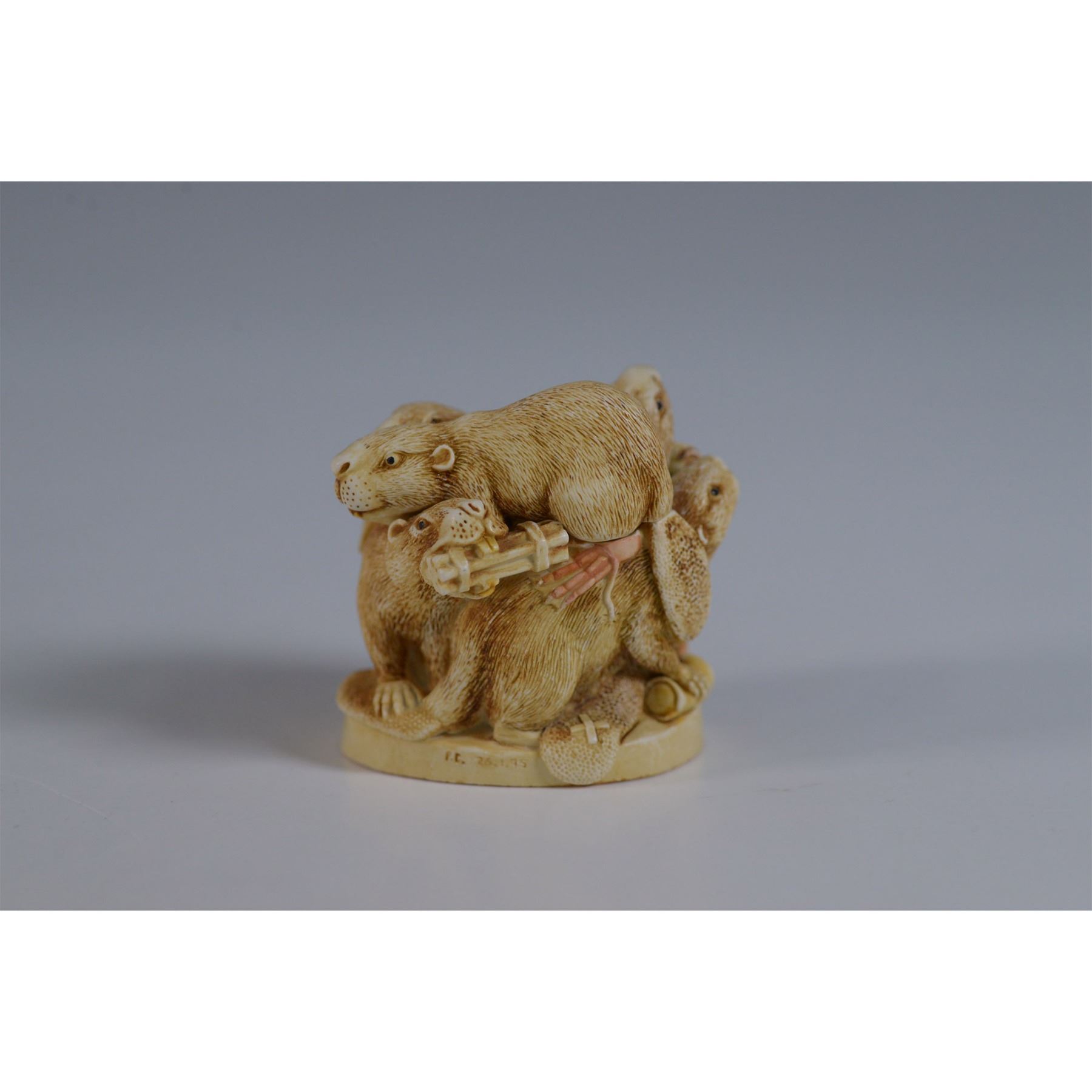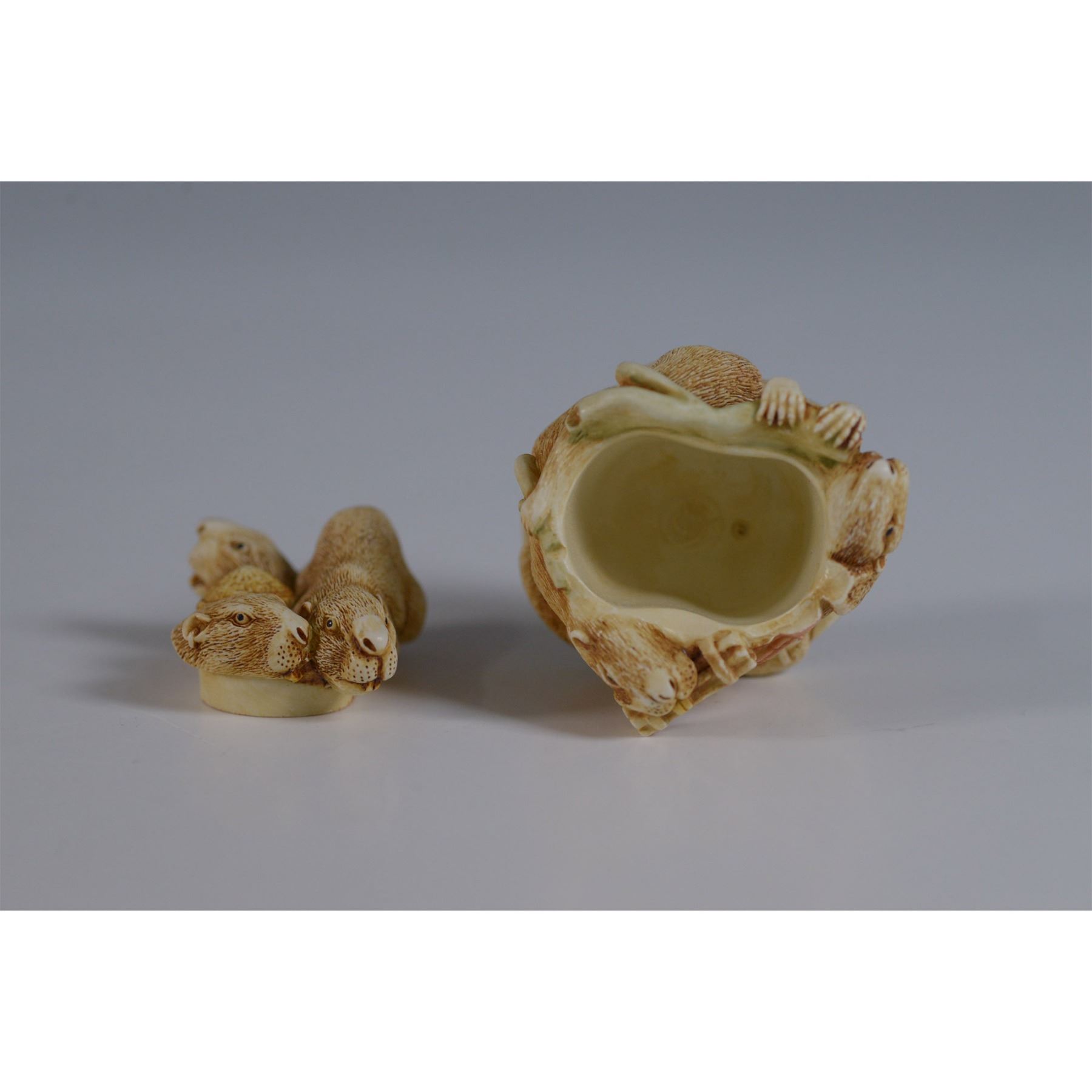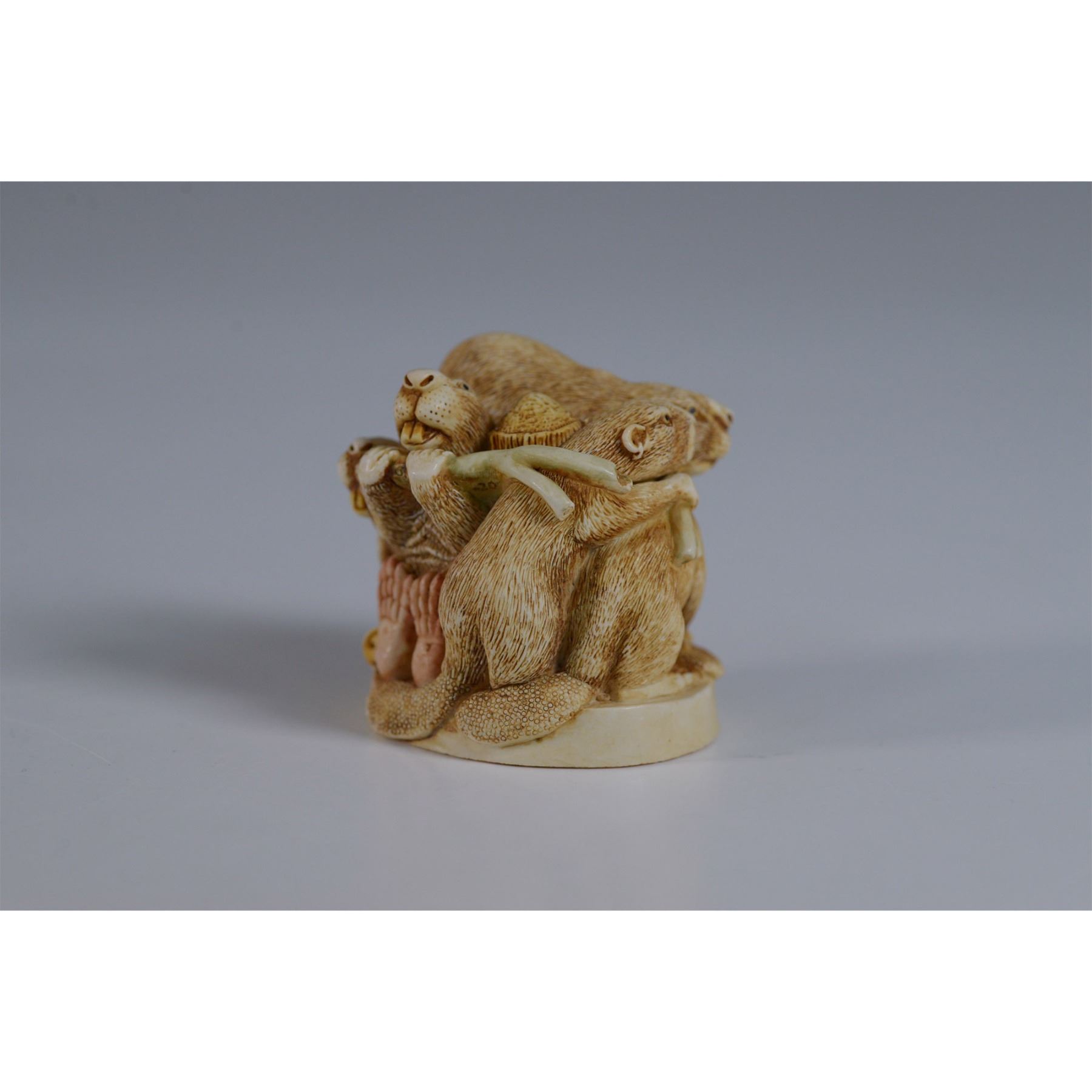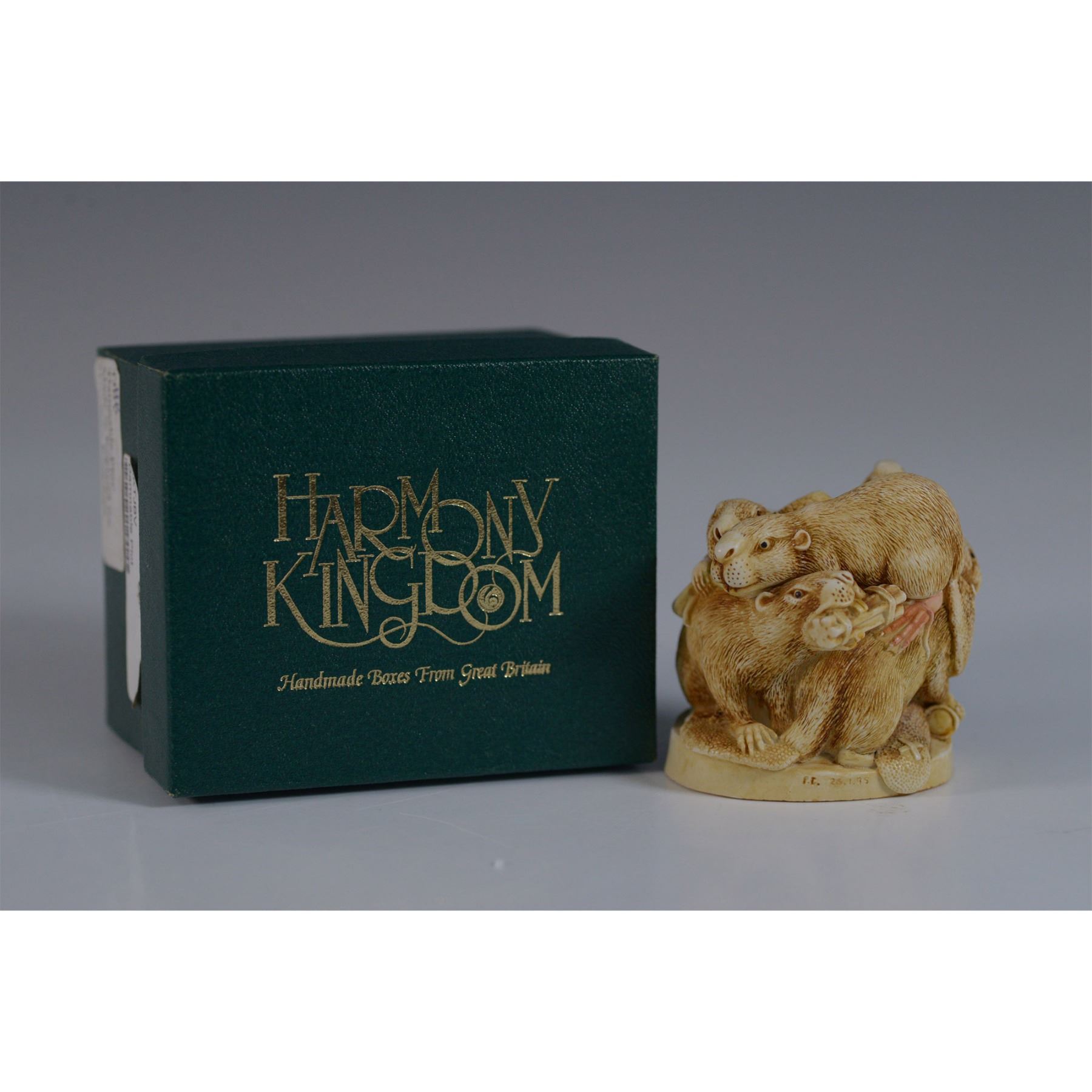 This intricately crafted Harmony Kingdom Treasure Box, titled Damnable Plot, showcases a group of detailed beavers in a humorous and engaging design. Made in England, this collectible box figurine is handcrafted from crushed marble and resin, featuring a removable lid that reveals a hidden compartment. The piece exhibits exquisite texture and fine coloration, characteristic of Harmony Kingdom's whimsical style. The backstamp and artist's signature authenticate its origin. Includes the original Harmony Kingdom box, measuring 3.5"L x 3"W x 2.5"H. The figurine itself stands at 2.25"H.