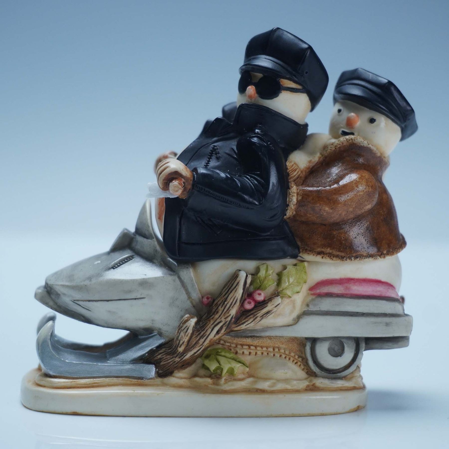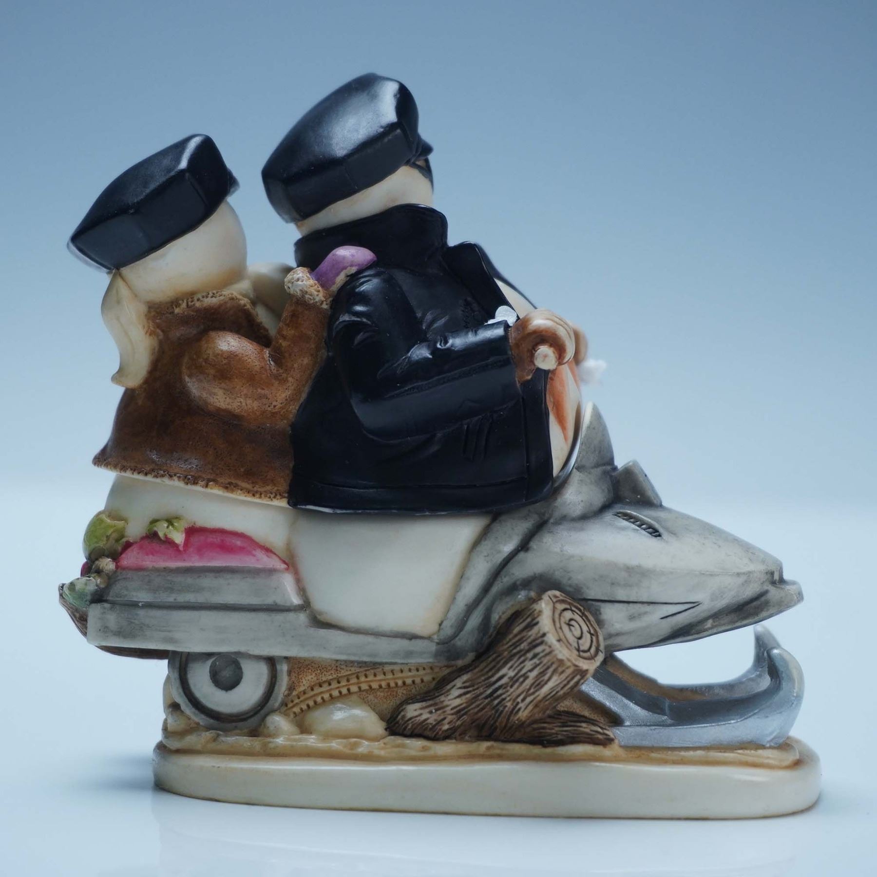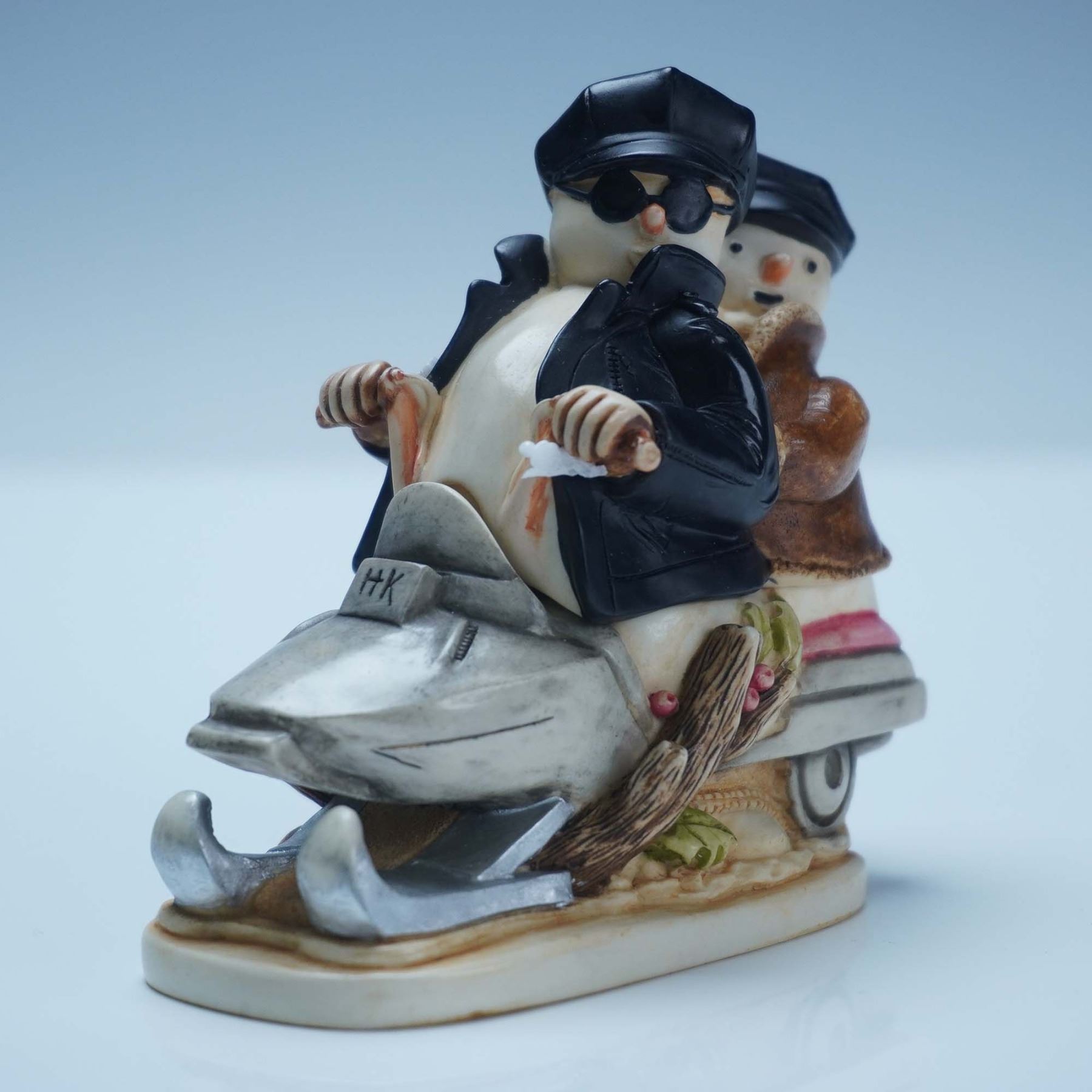 Crafted from a blend of crushed marble and resin. The figural box depicts a snowman couple dressed in winter motorcycle attire riding a snowmobile. The front rider wears a black leather-like jacket and sunglasses, while the passenger sports a brown jacket and matching cap. The registration plate on the front of the snowmobile is marked "HK." When the lid is lifted, the interior reveals a sculpted penguin figure lying inside the compartment. The base and interior of the box include carved symbols and artist markings. TJSESN00.