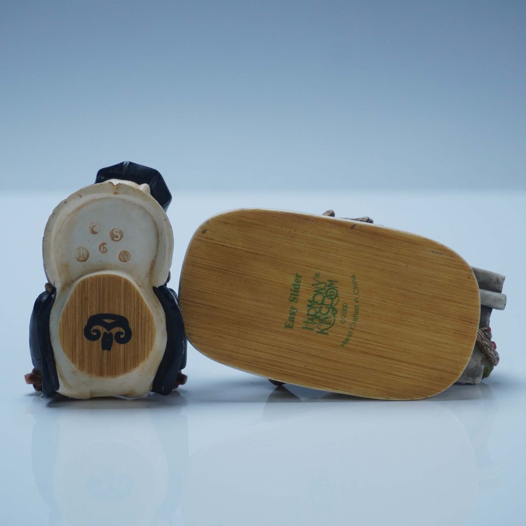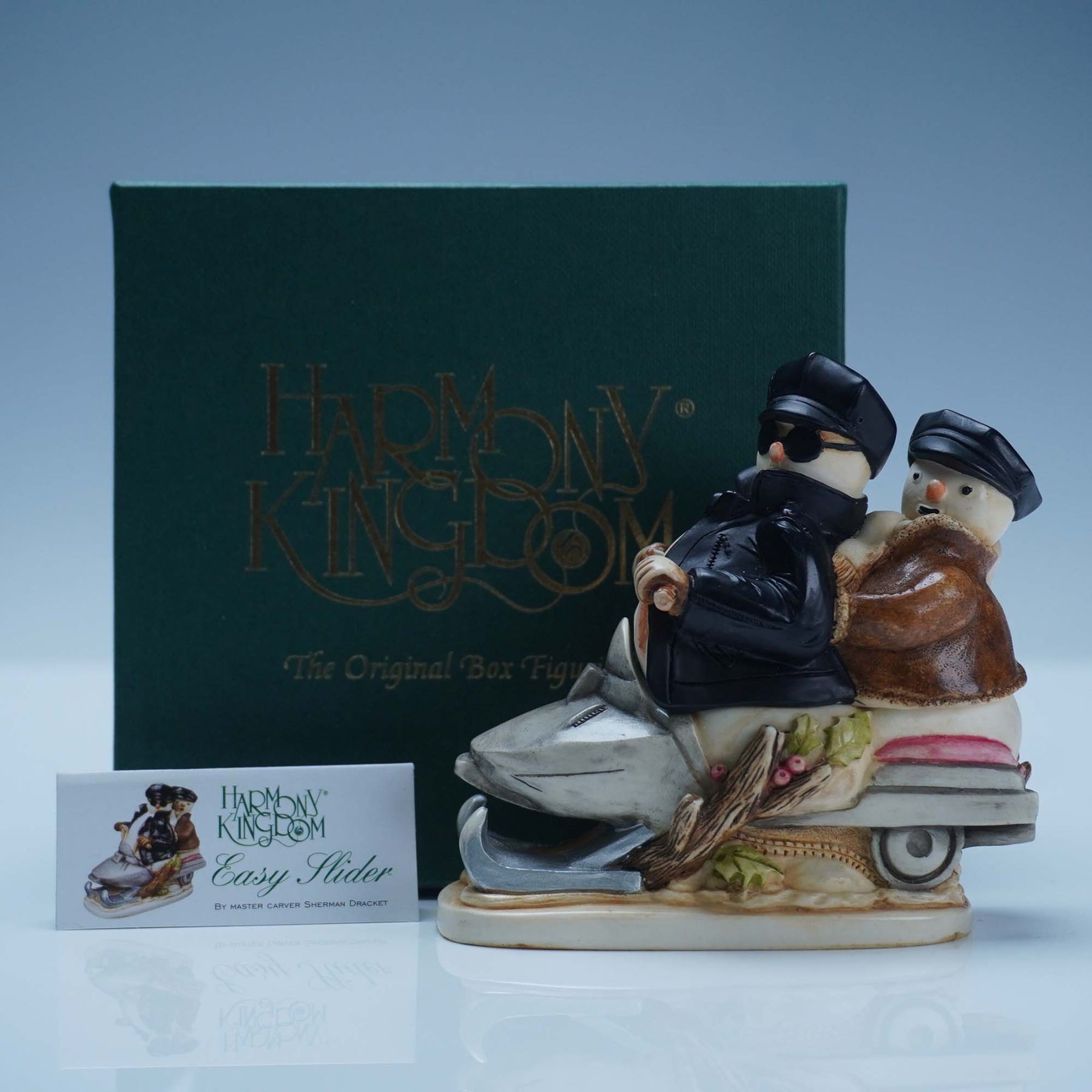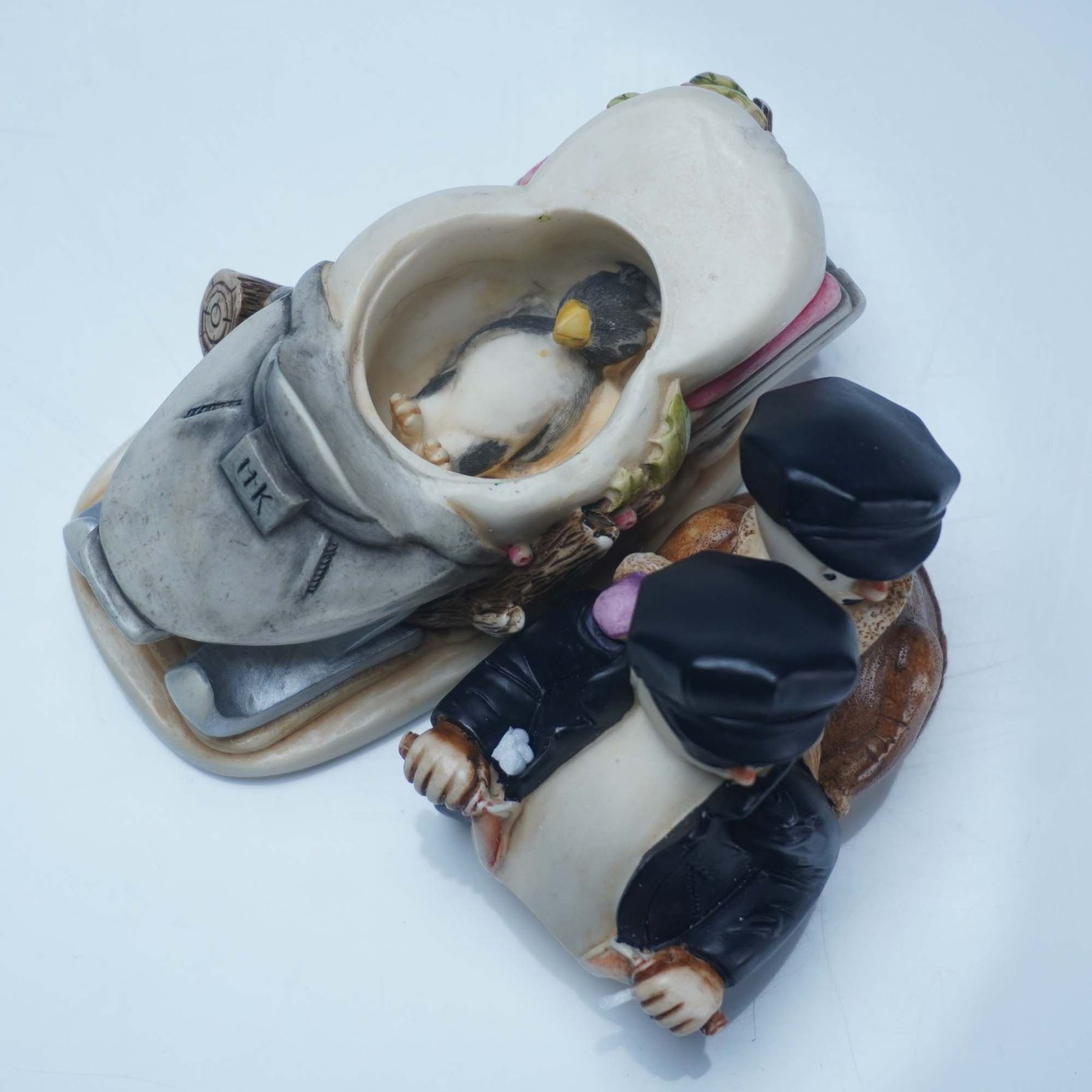 Crafted from a blend of crushed marble and resin. The figural box depicts a snowman couple dressed in winter motorcycle attire riding a snowmobile. The front rider wears a black leather-like jacket and sunglasses, while the passenger sports a brown jacket and matching cap. The registration plate on the front of the snowmobile is marked "HK." When the lid is lifted, the interior reveals a sculpted penguin figure lying inside the compartment. The base and interior of the box include carved symbols and artist markings. TJSESN00.