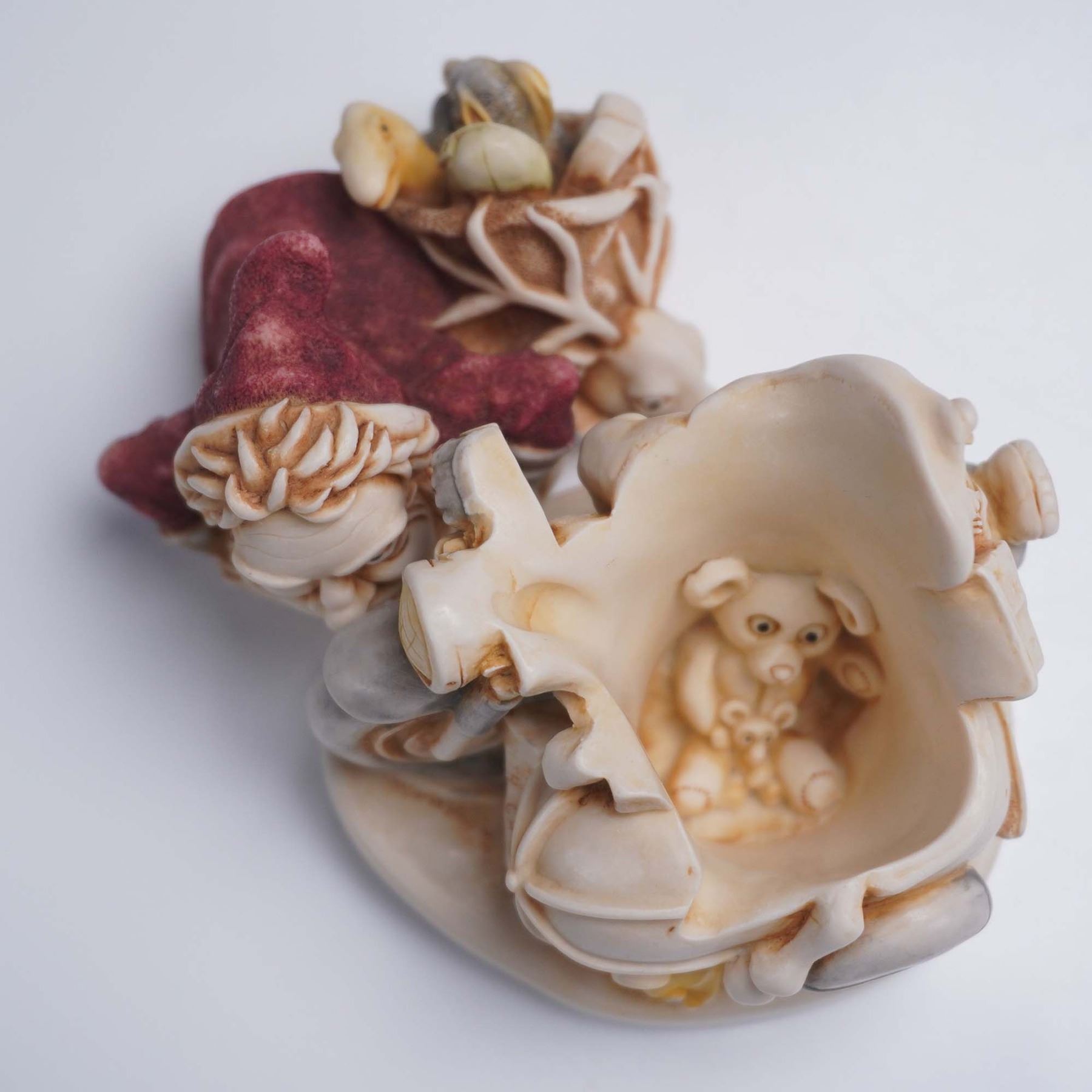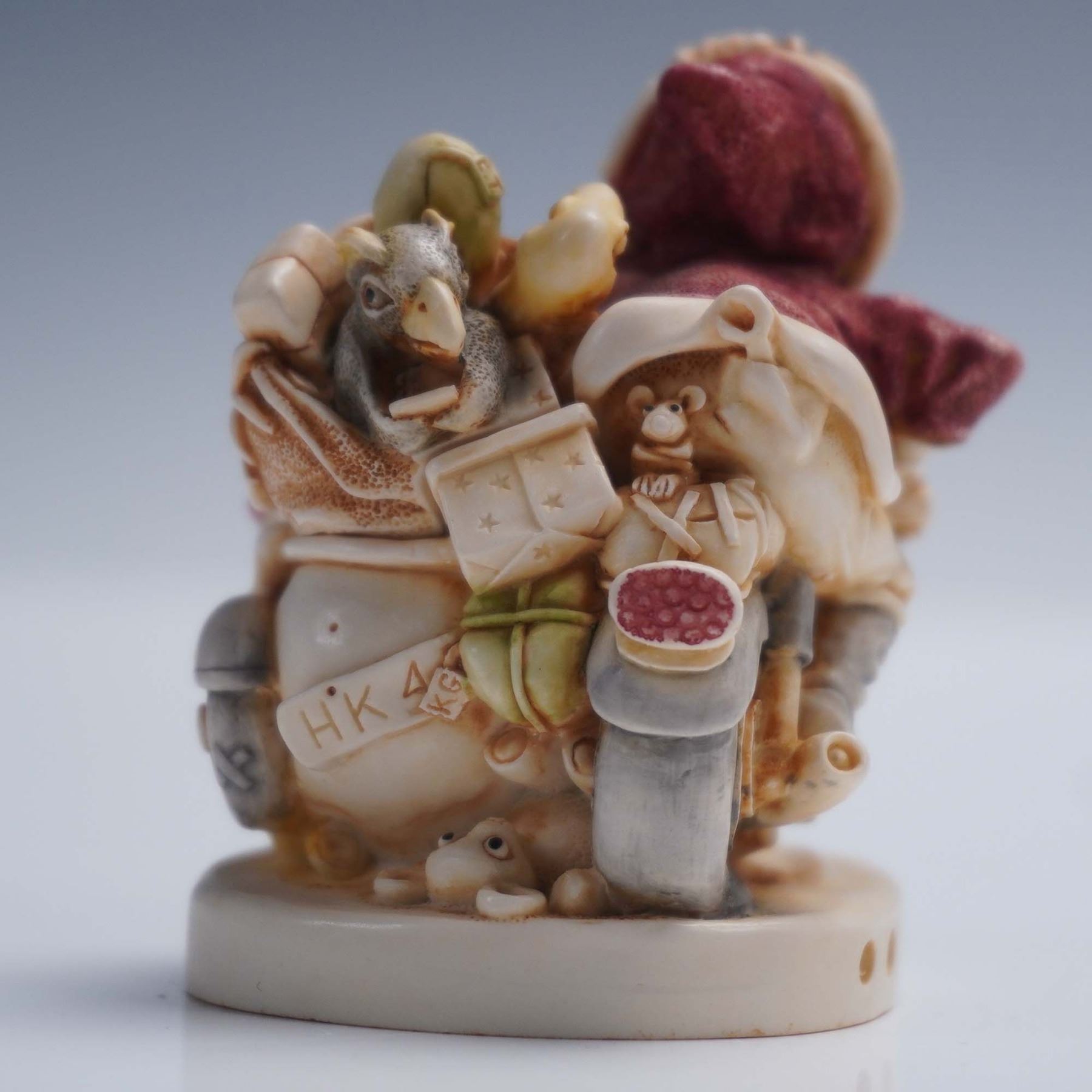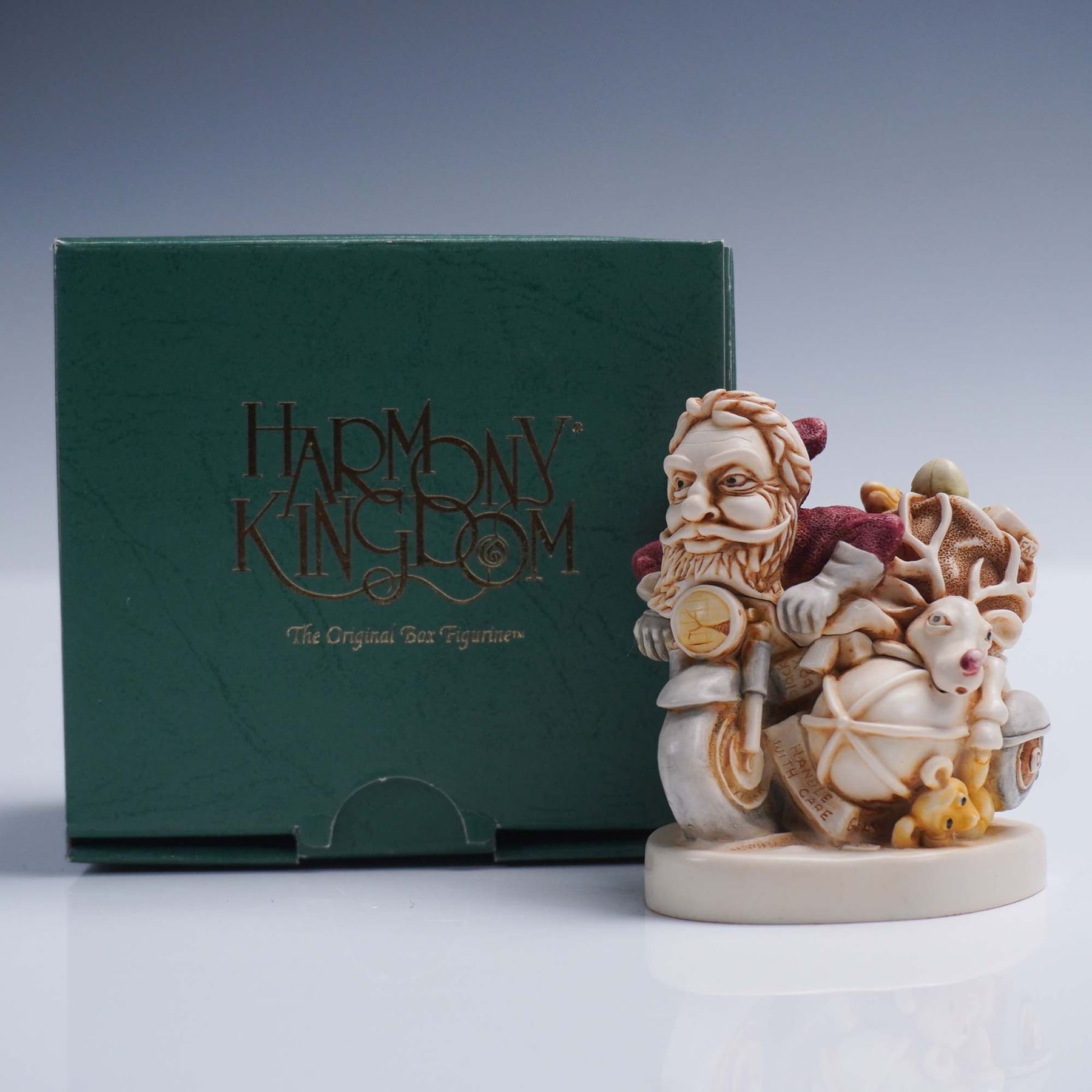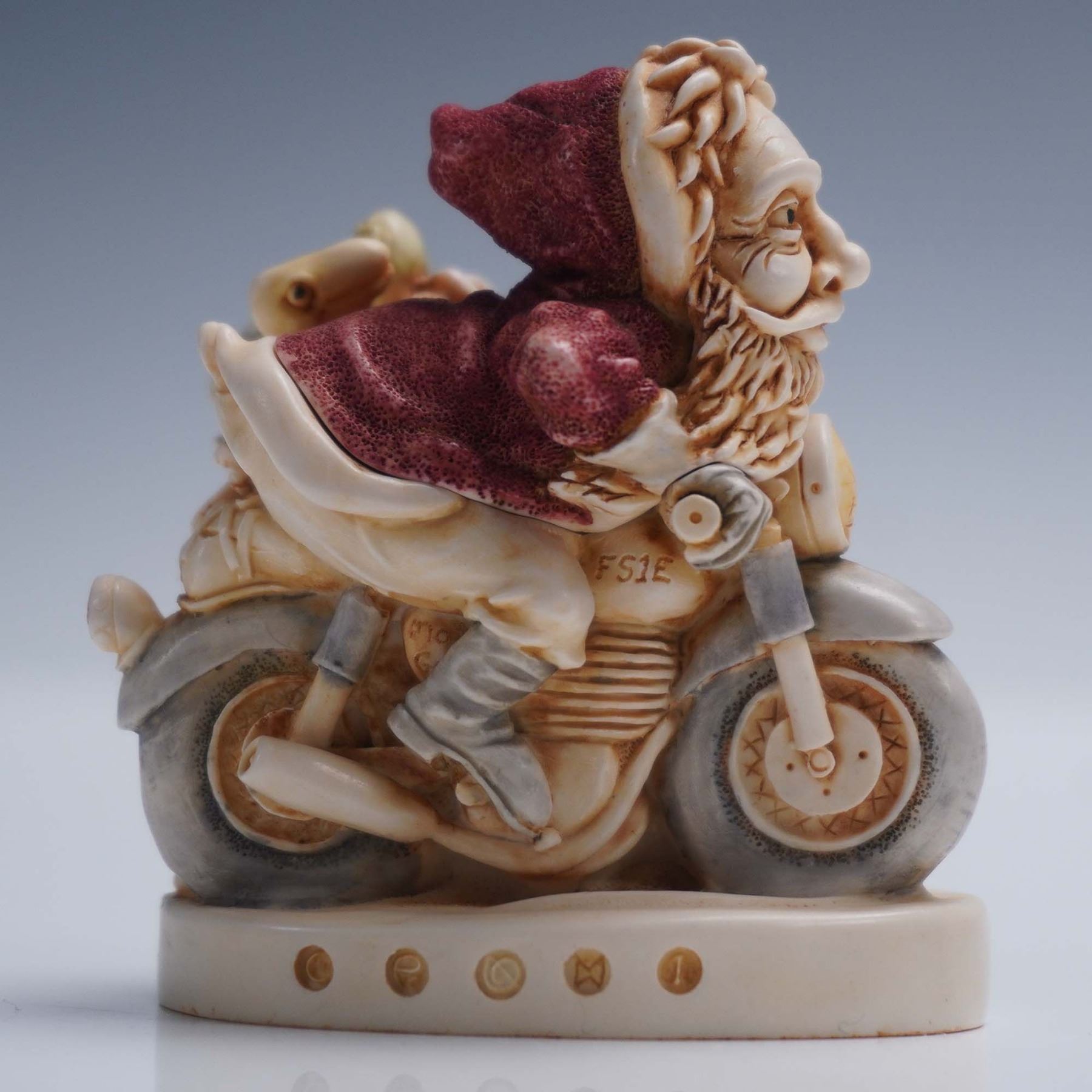 This whimsical Harmony Kingdom box figurine titled King of the Road features Santa Claus on a motorcycle loaded with gifts animals and festive details. Sculpted in resin, the piece includes intricate elements such as a reindeer teddy bear partridge and packed luggage each rendered with delightful humor and charm. Hidden within the box is a small interior compartment characteristic of Harmony Kingdoms box figurines. The base features a Harmony Kingdom manufacturing sticker marked Made in England while the interior lid bears the Harmony Kingdom. This collectible comes with its original green Harmony Kingdom box emphasizing its authenticity and collectibility. Harmony Kingdom marked. This item has its original box. Box measures: 4"L x 3.75"W x 3.25"H.
