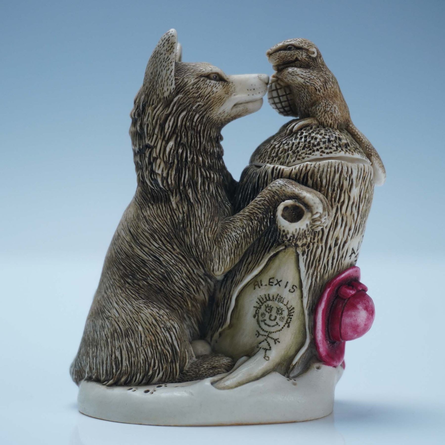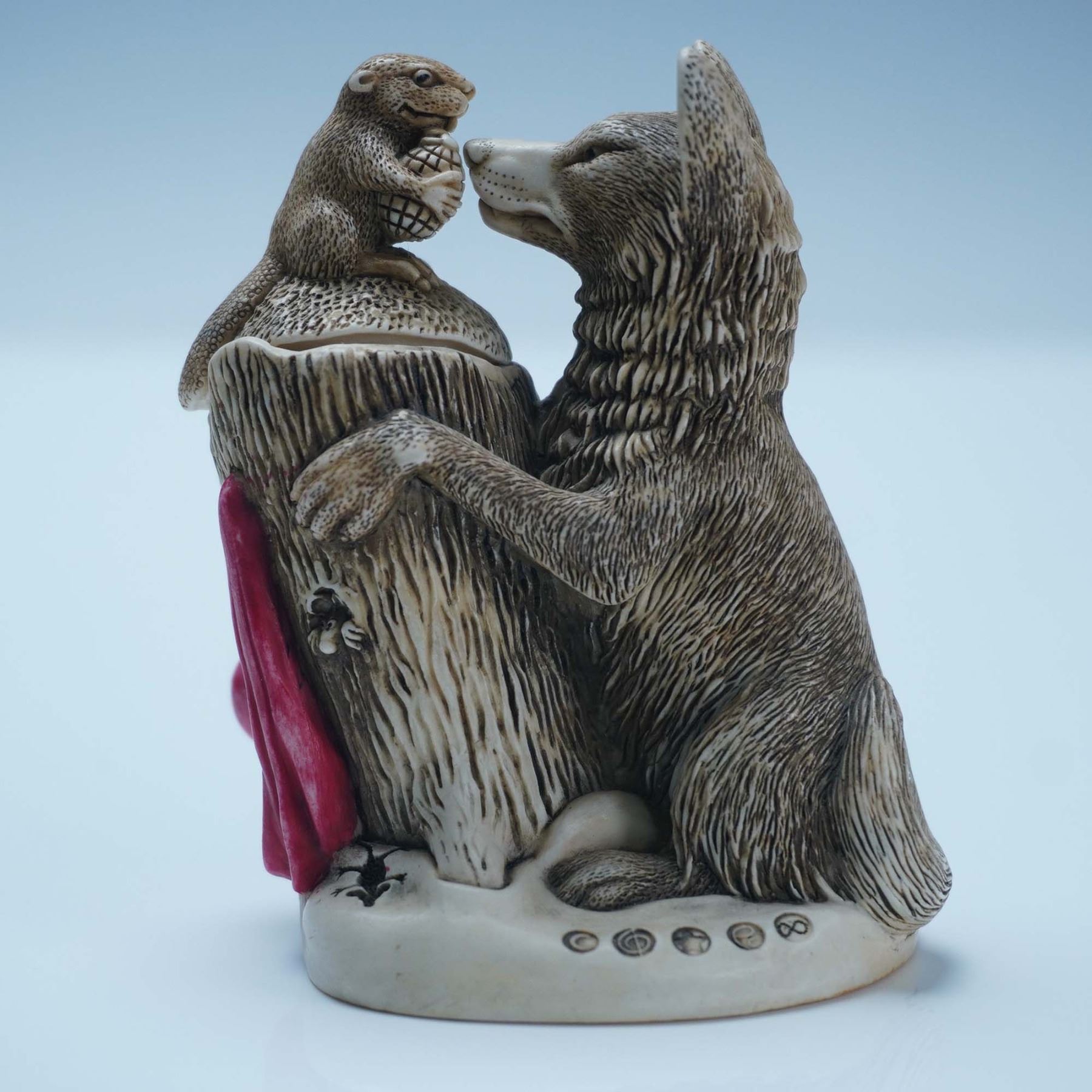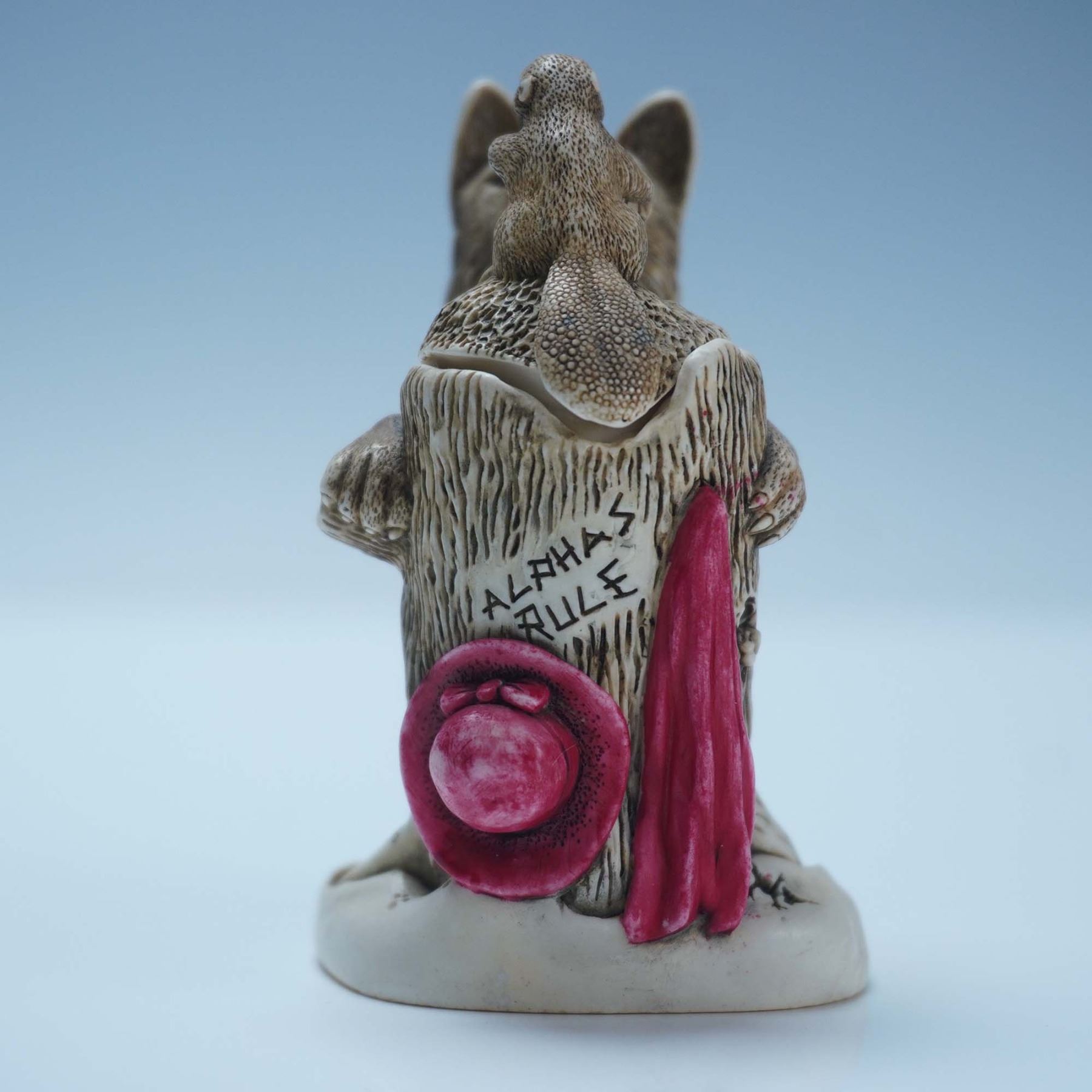 This figural box features a wolf and a beaver engaged in a symbolic interaction, with the wolf's paw resting against a tree stump as it faces beaver perched above. The beaver holds a hand-grenade between its paws. The piece incorporates fine sculptural detailing and markings such as a red hat and scarf hanging from the back of the tree and the carved inscription "ALPHAS RULE." Interior of the box contains hidden sculpted baby beavers. The piece is composed of a blend of crushed marble and resin. Harmony Kingdom stamped. TJWO2.