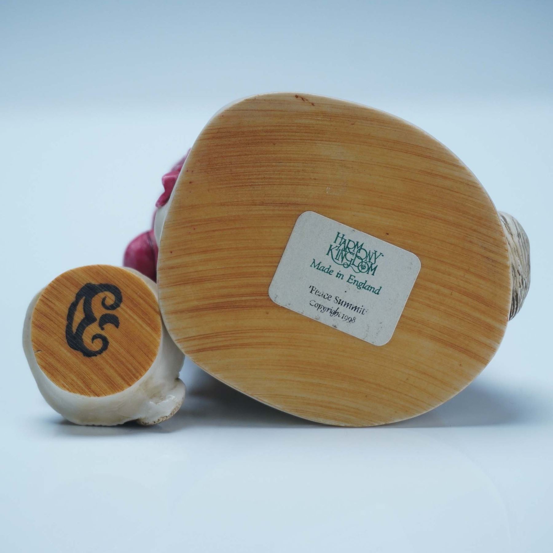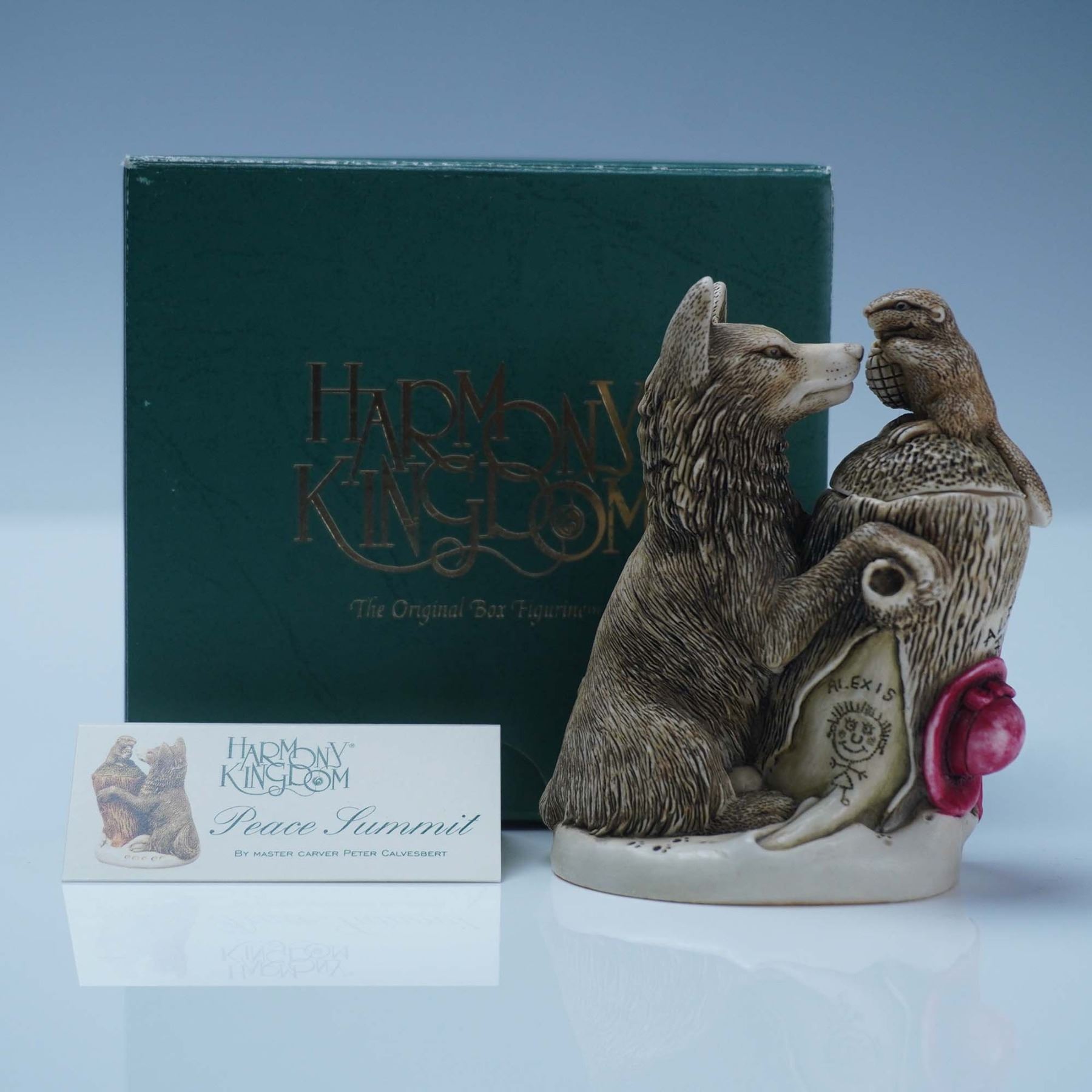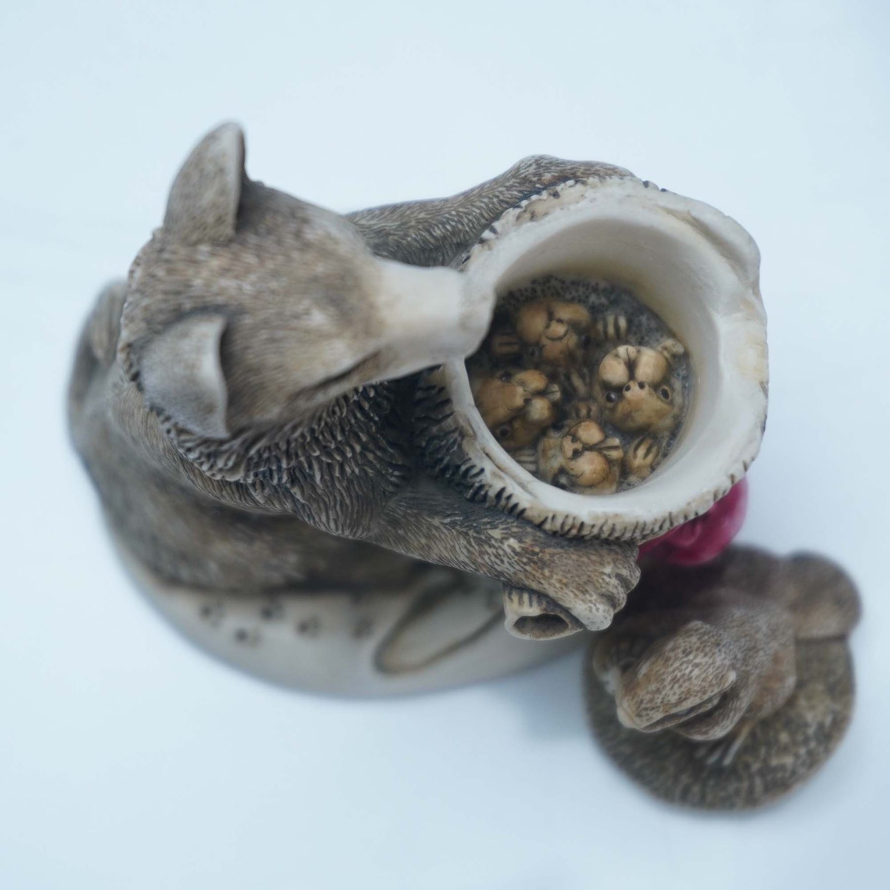 This figural box features a wolf and a beaver engaged in a symbolic interaction, with the wolf's paw resting against a tree stump as it faces beaver perched above. The beaver holds a hand-grenade between its paws. The piece incorporates fine sculptural detailing and markings such as a red hat and scarf hanging from the back of the tree and the carved inscription "ALPHAS RULE." Interior of the box contains hidden sculpted baby beavers. The piece is composed of a blend of crushed marble and resin. Harmony Kingdom stamped. TJWO2.