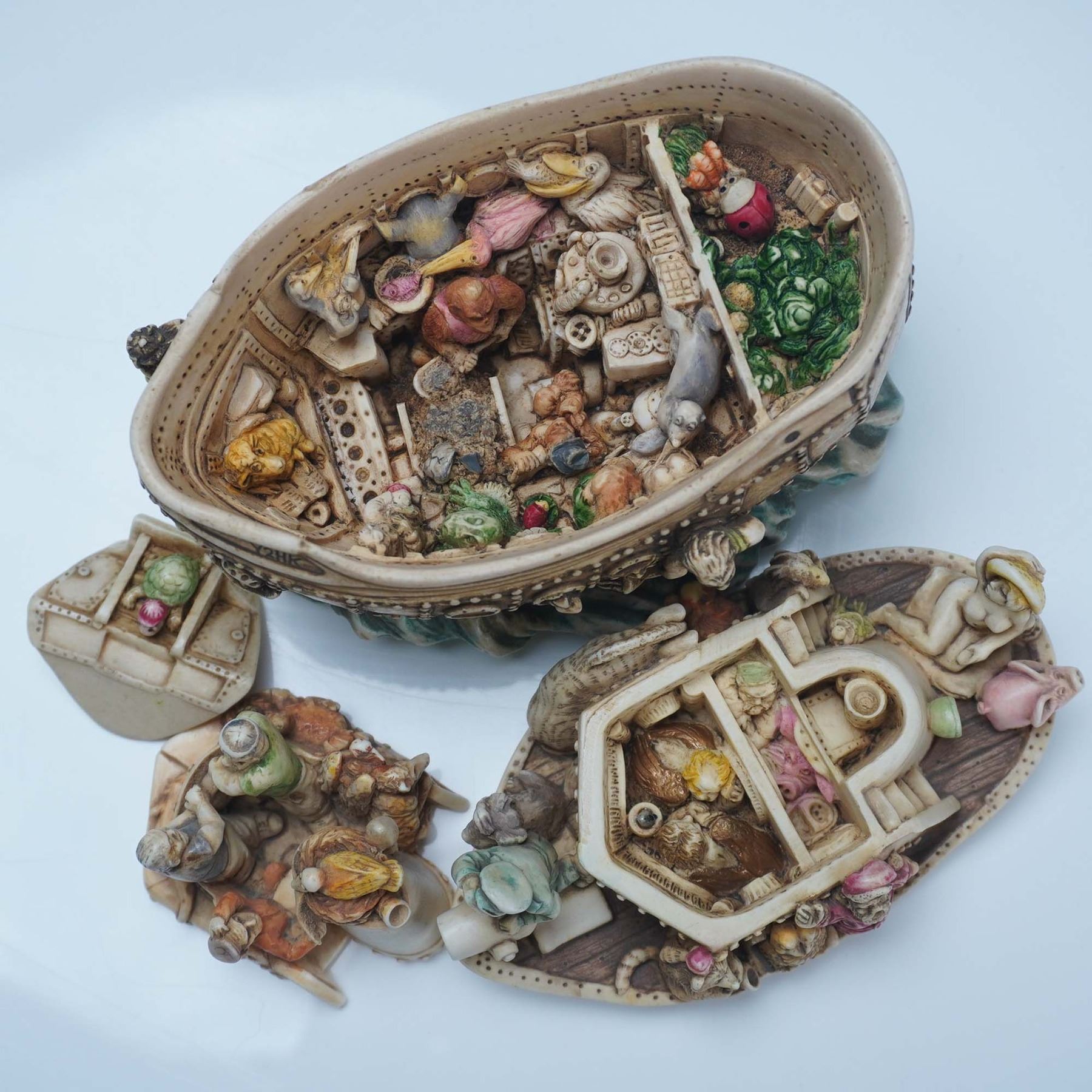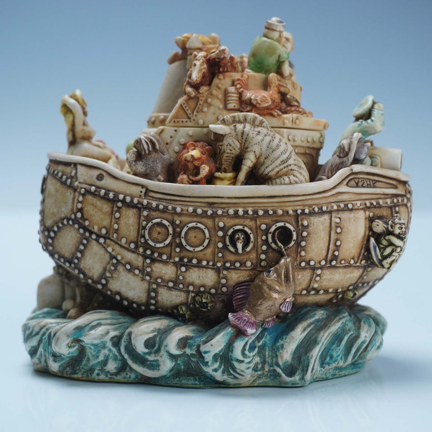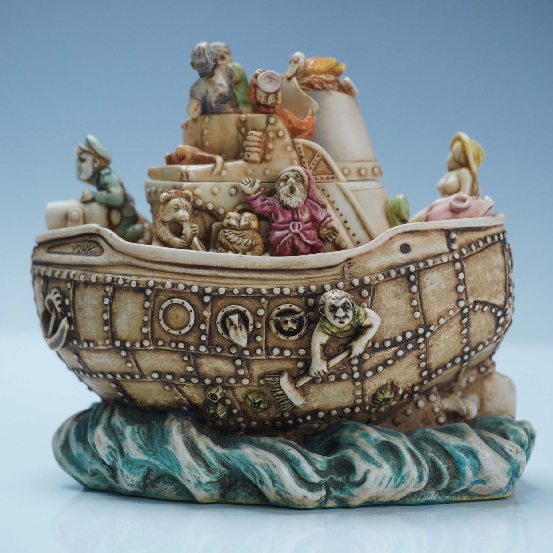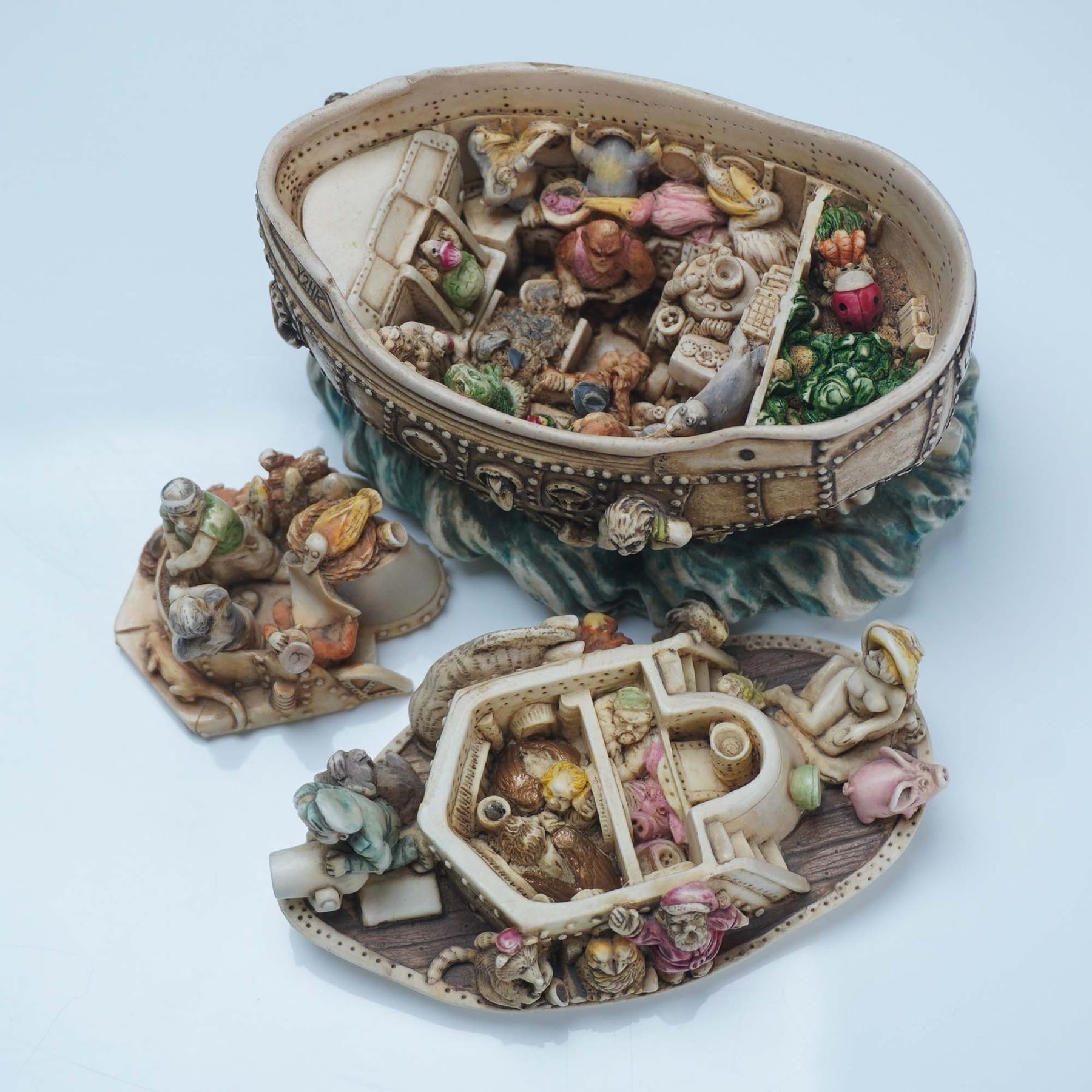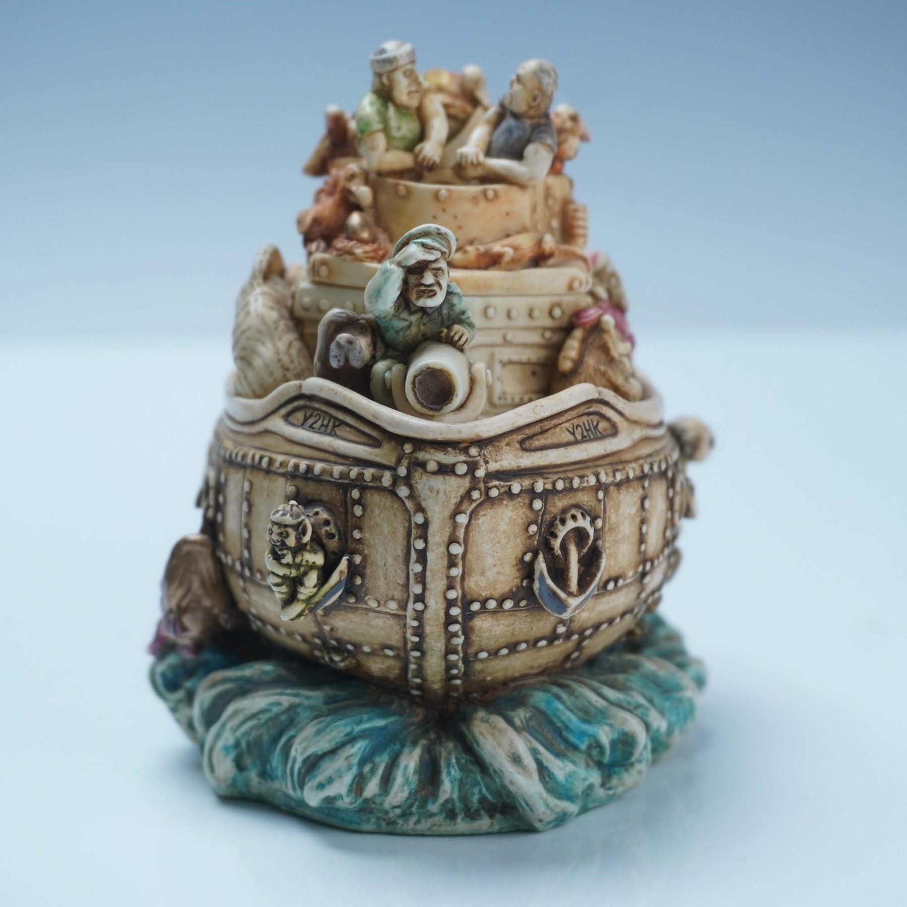 Crafted from a blend of crushed marble and resin. This complex figural box is styled as a large ship with layered interior compartments, each filled with an array of miniature figures and animals, depicting a satirical voyage at the turn of the millennium. Marked "LIBERIA" on the back of the vessel, the hull is decorated with riveted panels, portholes, and small sculptural details. The interior compartments feature characters, animals, and symbolic objects divided across removable layers. The underside includes Harmony Kingdom markings and felt backing. The interior carvings display various miniature figures in lifelike poses and settings. Includes the original green Harmony Kingdom box and accompanying booklet. TJSEY2K.