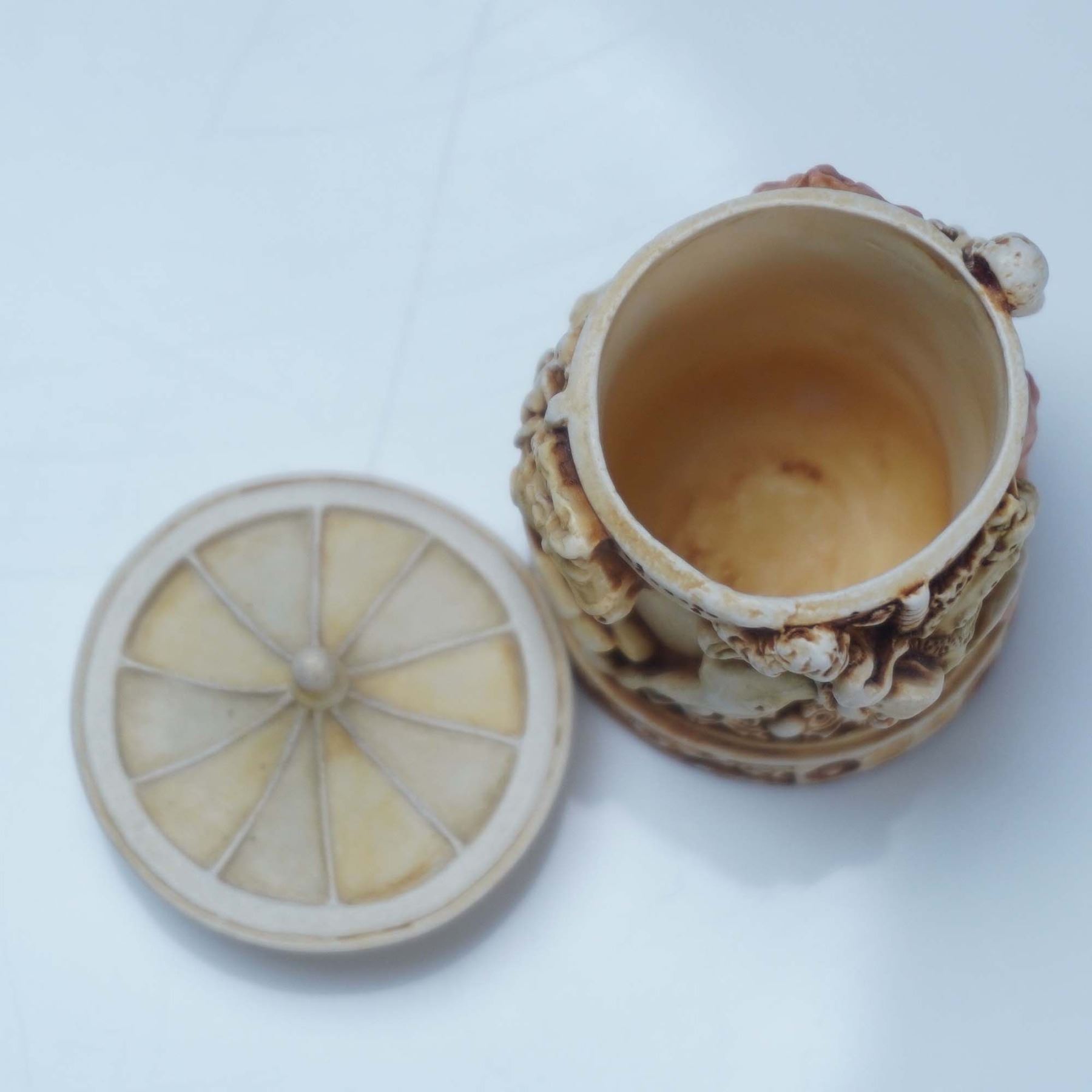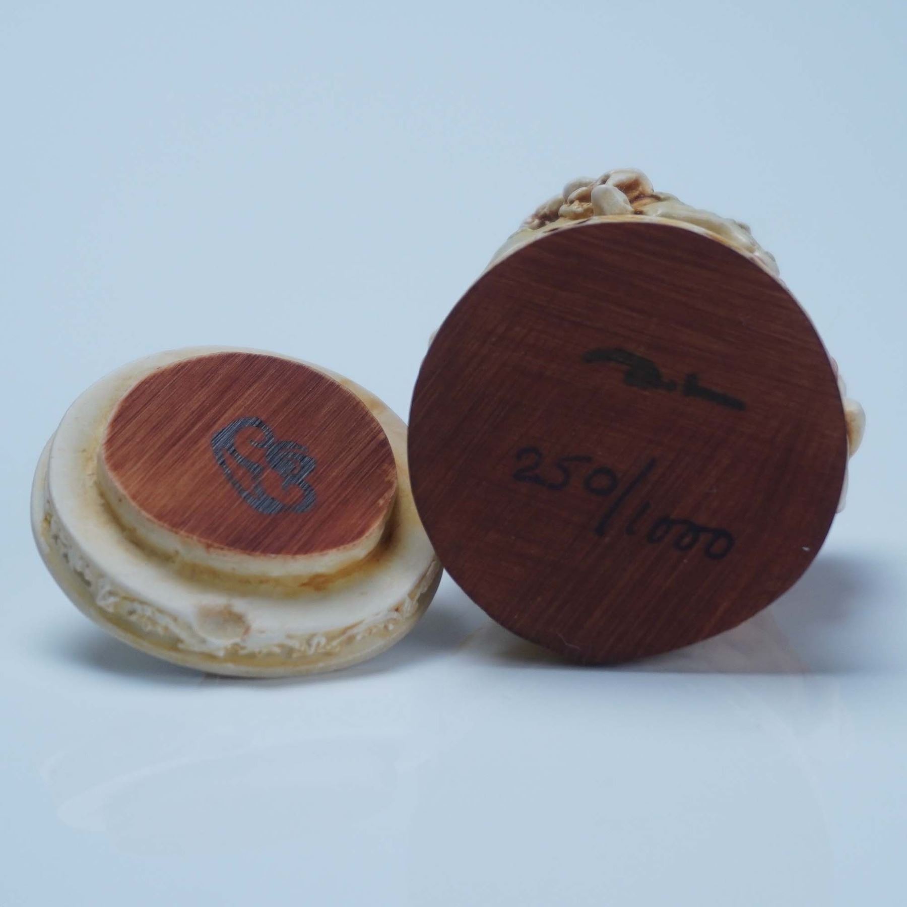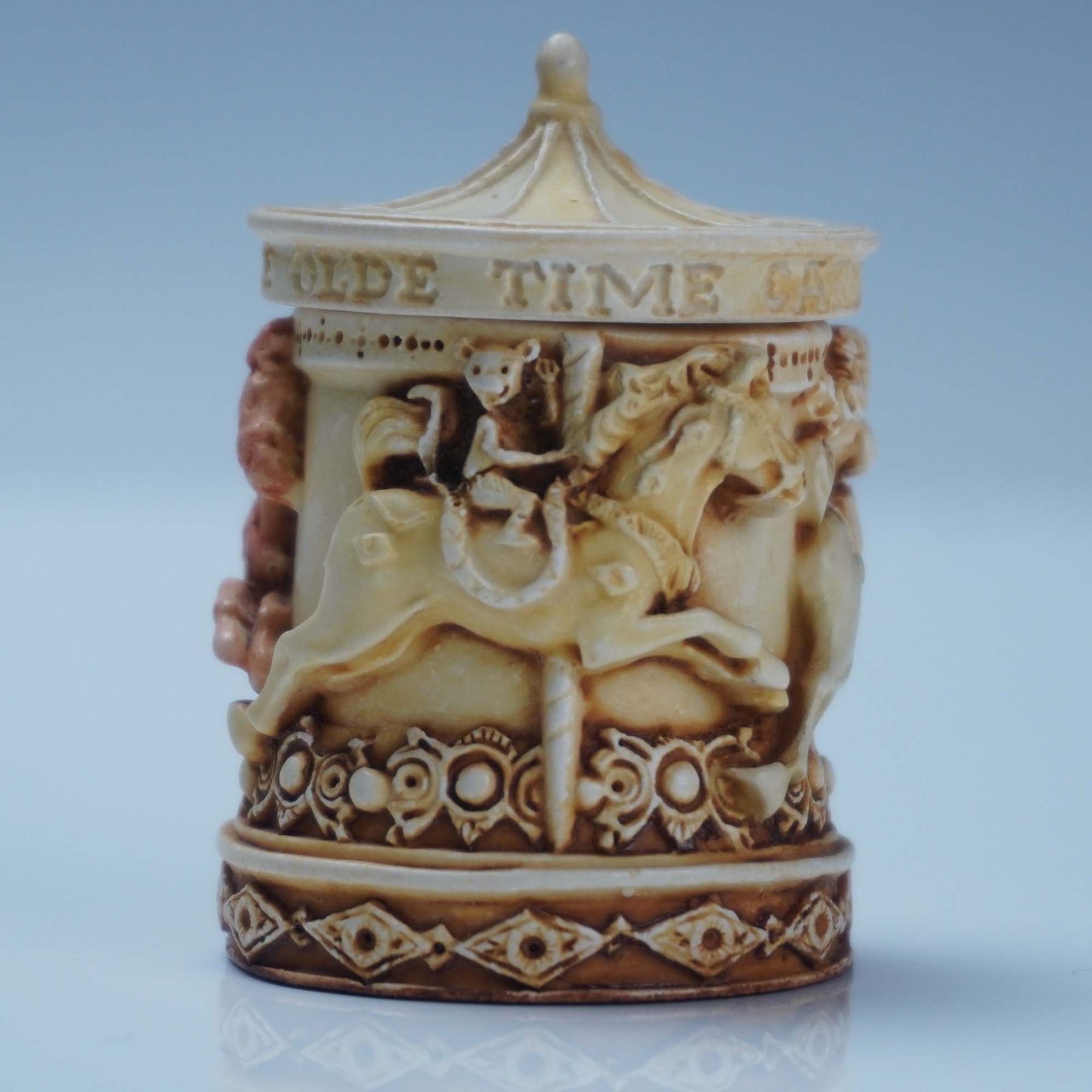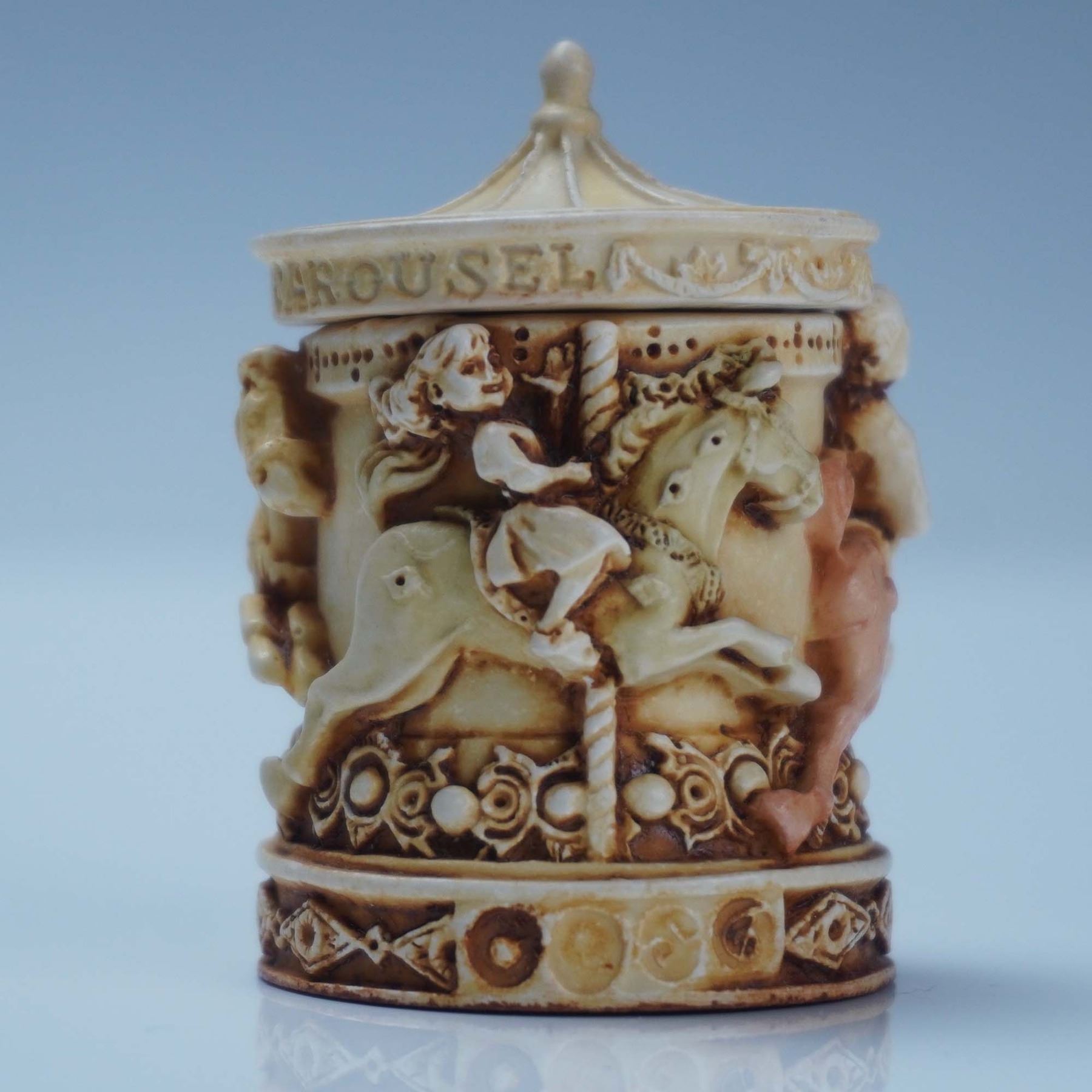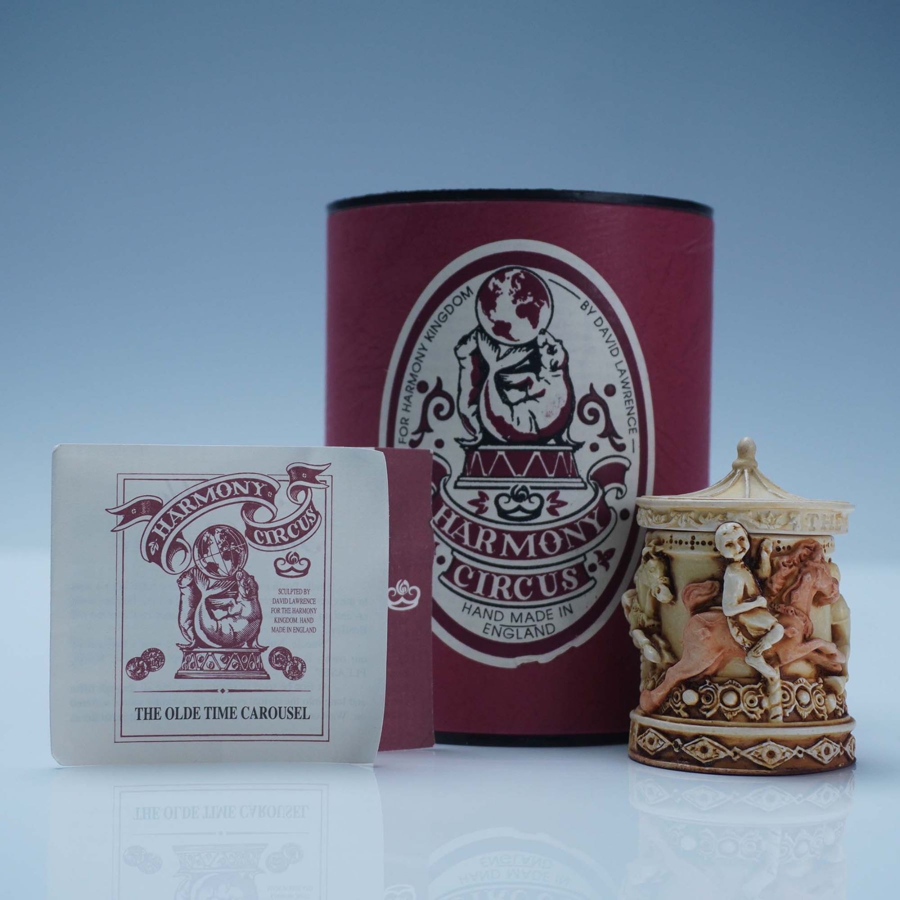 This intricately detailed Harmony Kingdom figurine, The Olde Time Carousel, captures the nostalgia and charm of a classic carousel scene. Sculpted by David Lawrence, this piece is part of the Harmony Circus collection, known for its finely crafted designs and hidden secrets. The exterior showcases children joyfully riding ornate carousel horses, while the interior reveals a hidden compartment, typical of the collectible Treasure Jest series. Handmade in England from crushed marble and resin, this piece stands approximately 2.25"H, and comes with its original cylindrical carton measuring 4.25"H x 3.25"Dia.