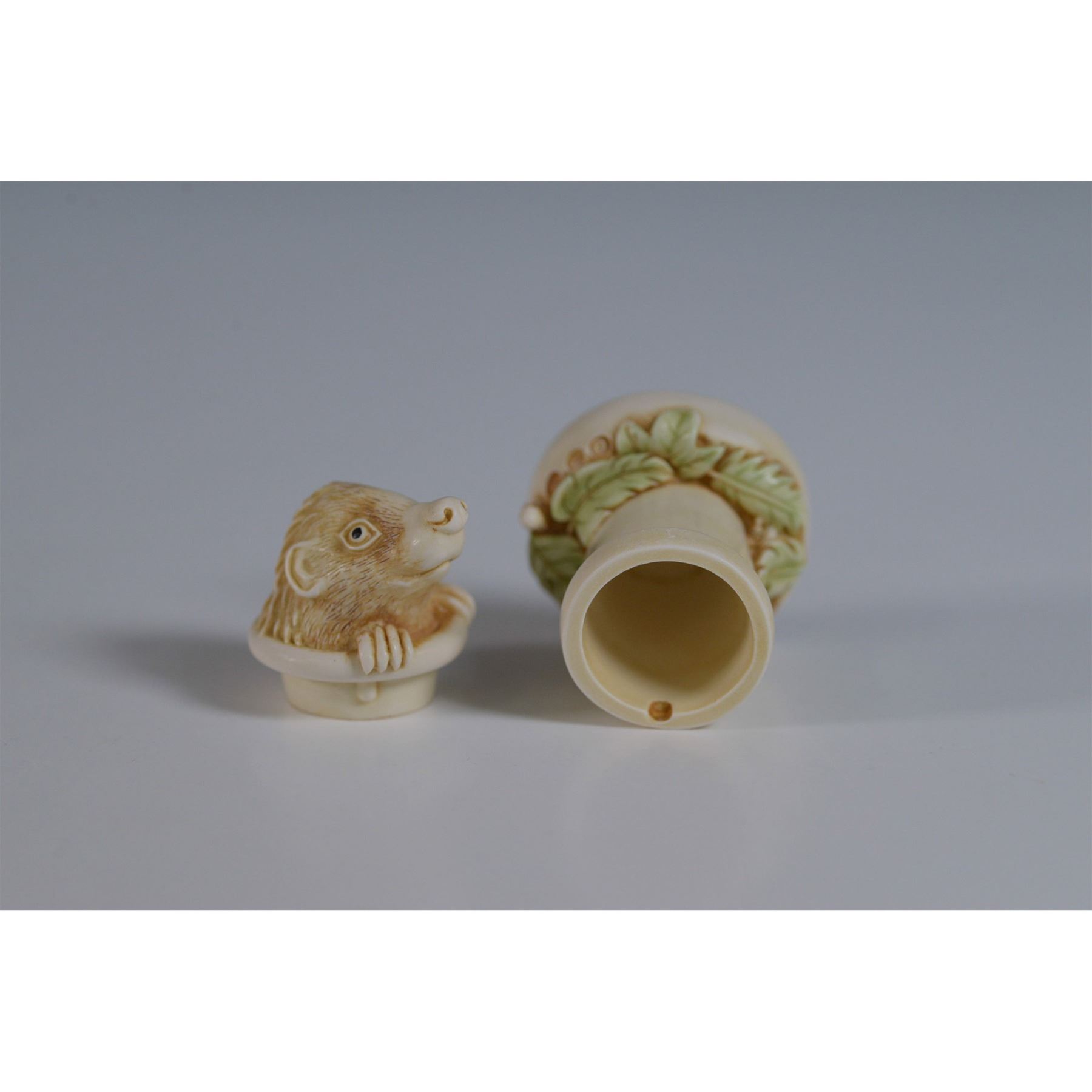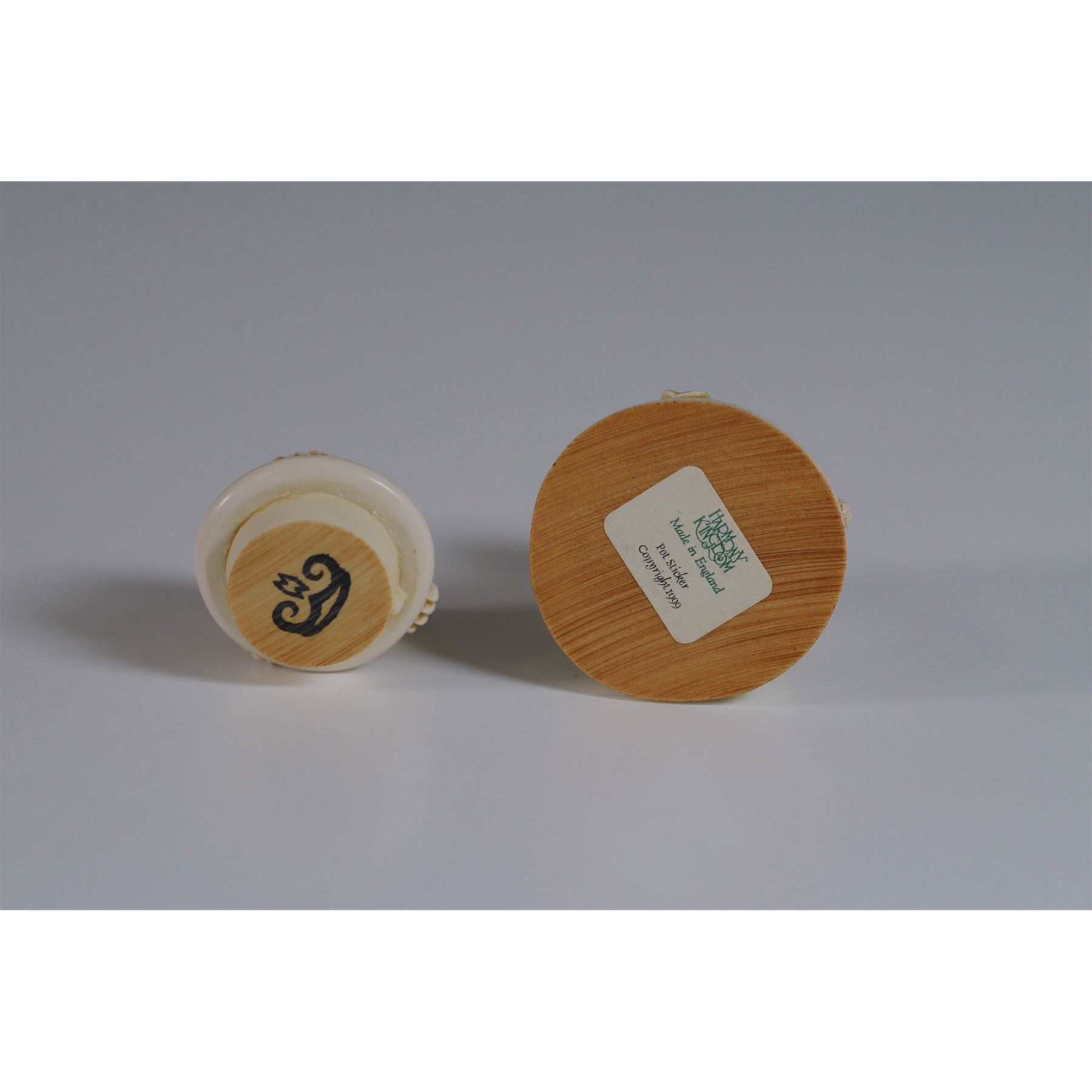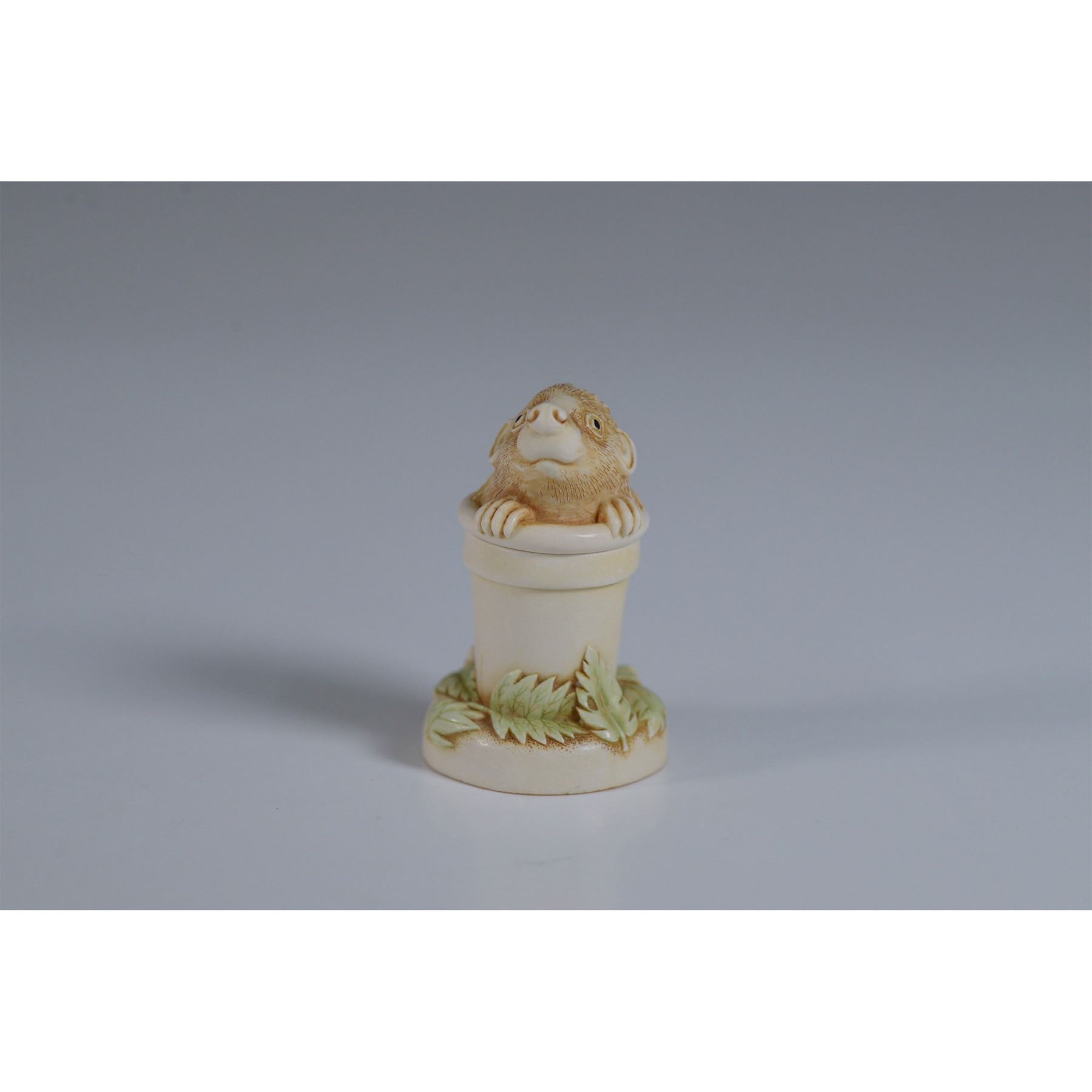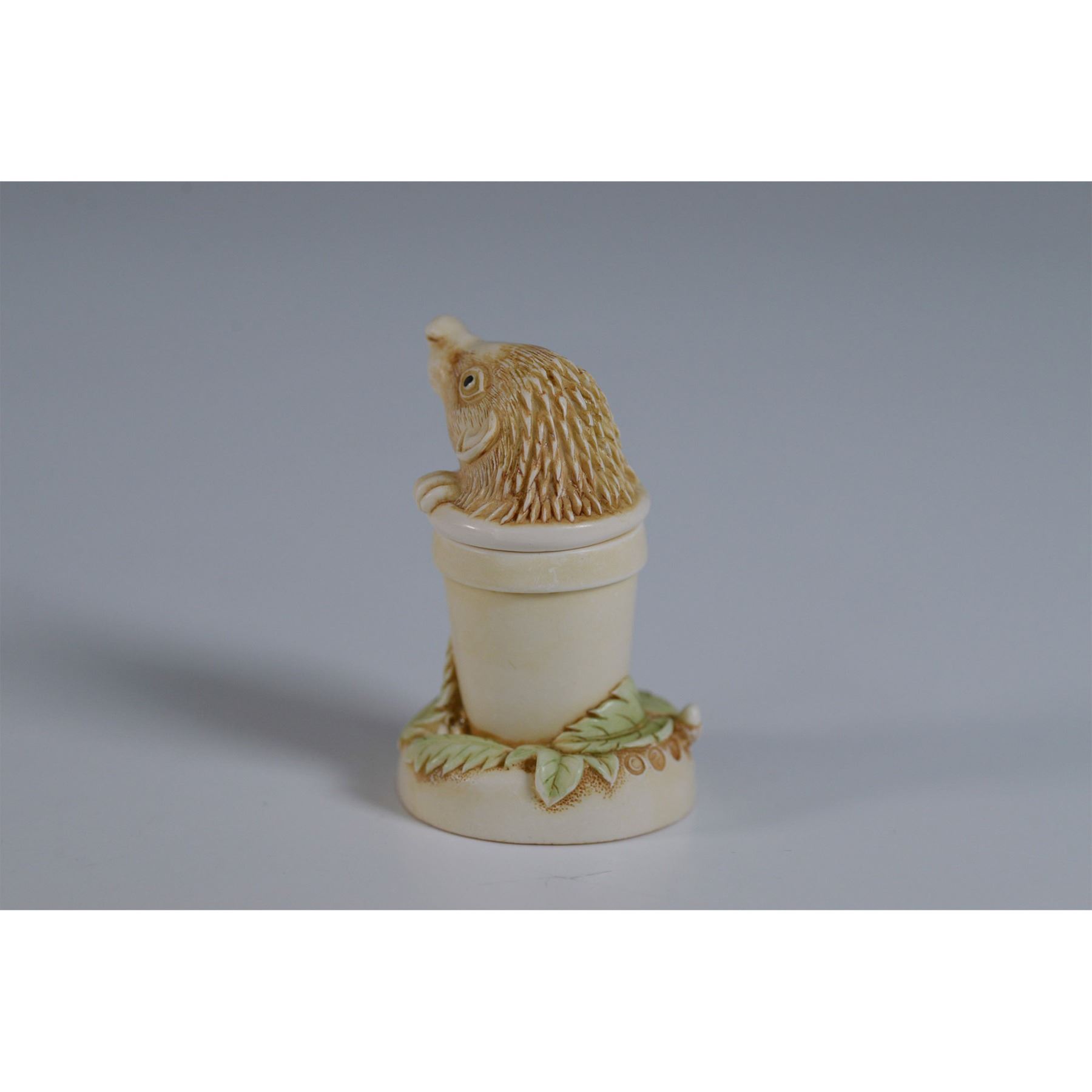 This charming figurine from Harmony Kingdom's Treasure Jest collection, titled Pot Sticker, features a whimsical hedgehog peeking out from a flower pot, surrounded by delicately sculpted leaves. Created by master carver Peter Calvesbert and made in England, this piece showcases the detailed craftsmanship and playful design characteristic of Harmony Kingdom. The figurine comes with its original box and identification card, enhancing its appeal to collectors.