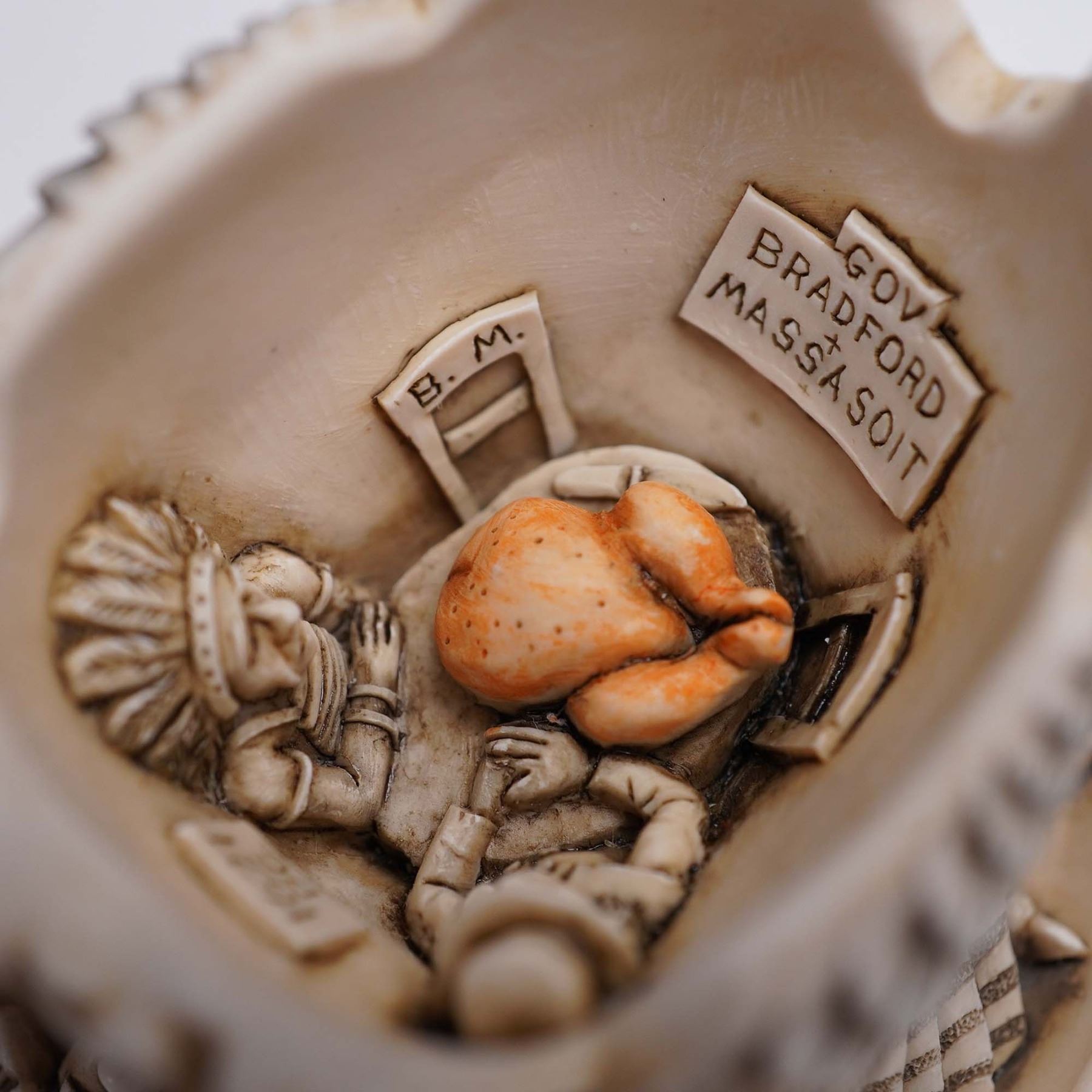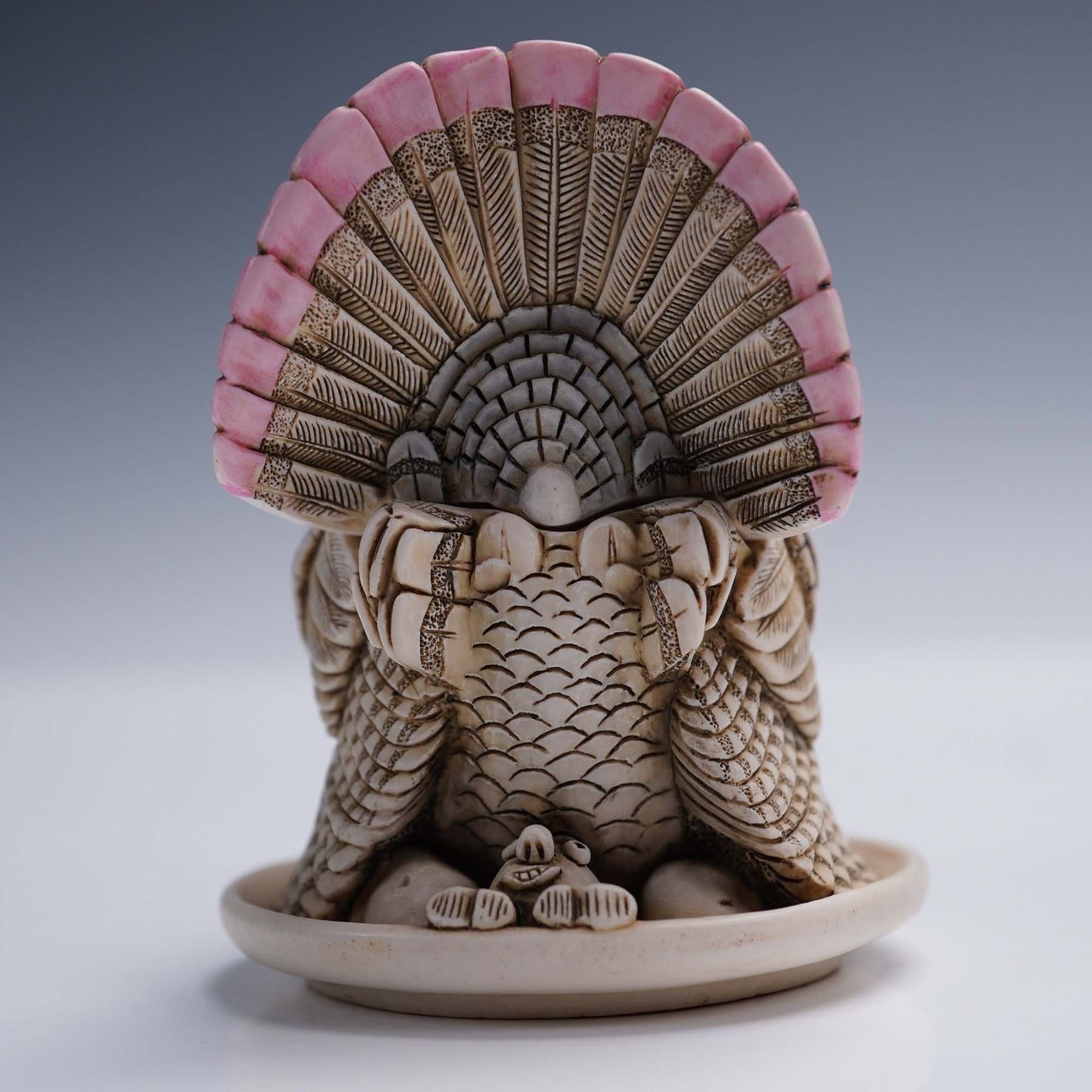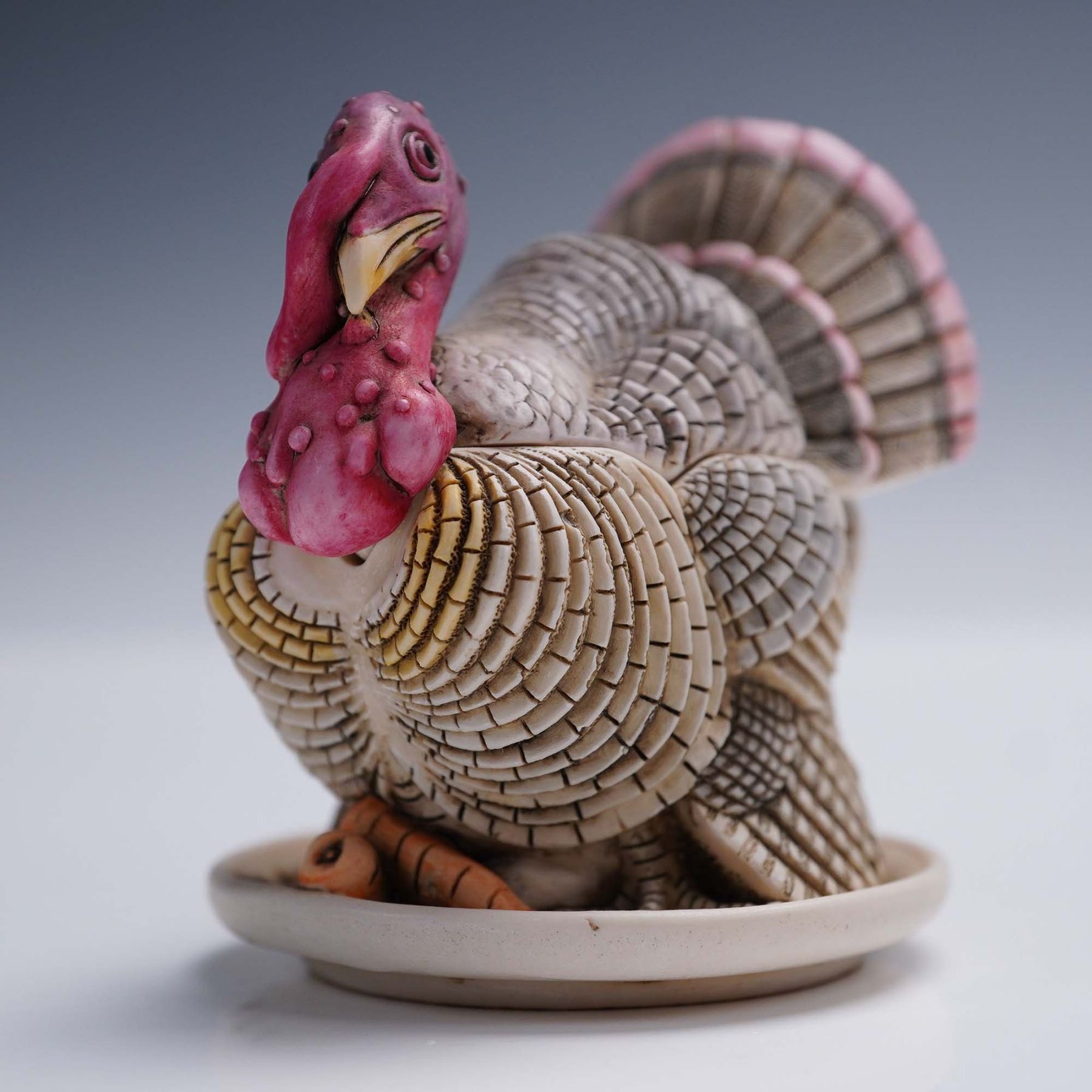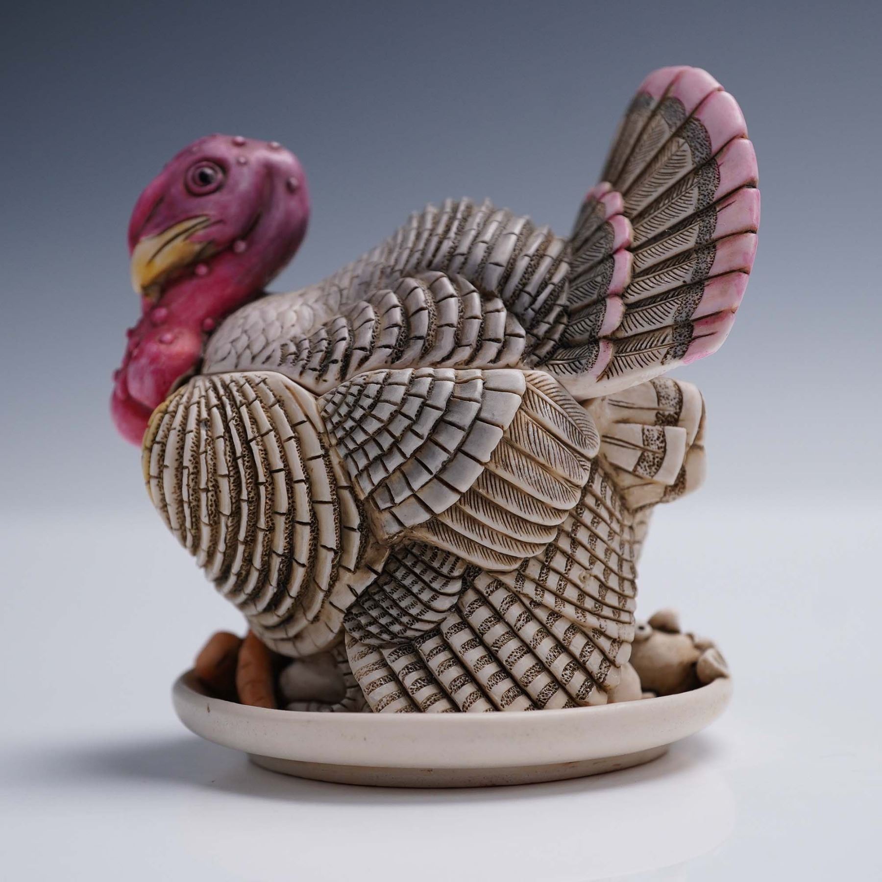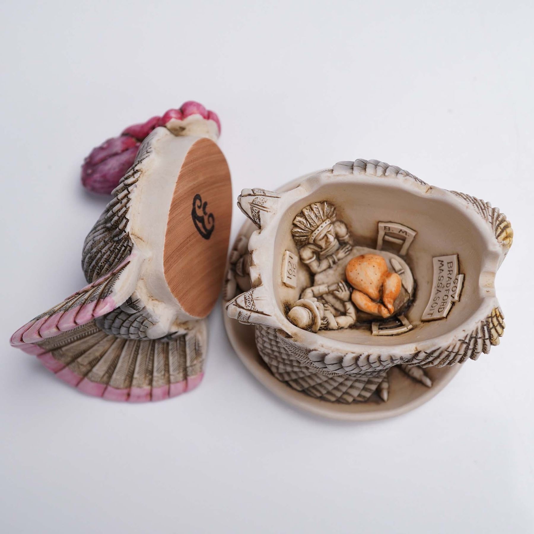 A delightful Harmony Kingdom Treasure Jests box figurine titled "Gobblefest," showcasing a proud turkey with intricately detailed feathers and lifelike texture, crafted from crushed marble and resin. This piece opens to reveal a hidden interior scene featuring a miniature Thanksgiving gathering, complete with a roast turkey and historic figures, capturing the playful spirit of the holiday. Approximately 3"H, it comes in the original green Harmony Kingdom box, measuring 4"L x 3"H.