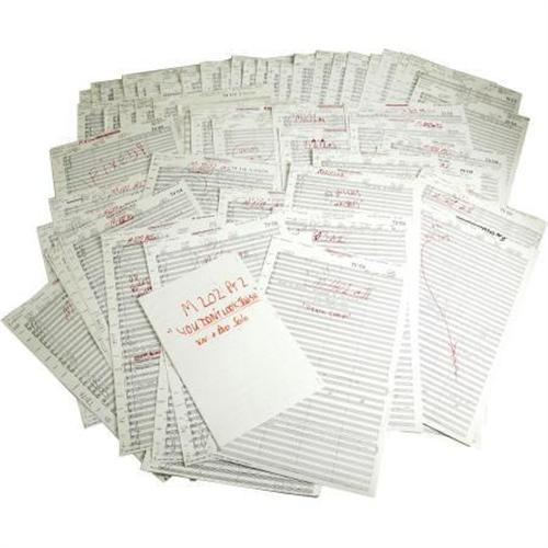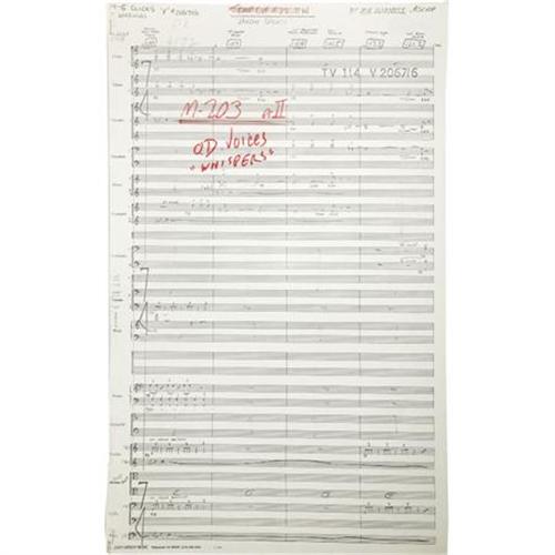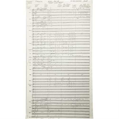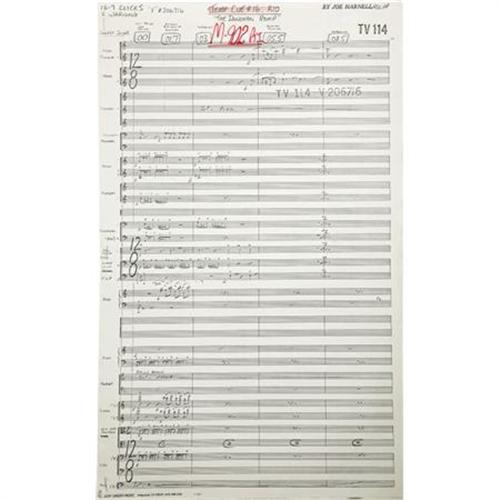 <B>Joe Harnell Original Scores for</B></I> <B><I>V</B></I></B></I> <B>Miniseries.</B></I> With the eerie tagline "Humankind's last stand," the original <I>V</B></I> miniseries descended upon the viewing public in 1983, and spawned a short-lived but popular TV series. This massive archive, containing most of the sheet music to both parts of the miniseries, includes scores appropriately titled "Lizard Love" and "Lizard Wrestling," and measures approximately 12" x 22". The scores are filled with handwritten notations (mostly in red ink) by the music's composer, Joe Harnell, who was was subsequently nominated for an Emmy Award for his work. In Very Fine to Excellent condition with staple holes and mild toning. <I>From the Joe Harnell Estate</B></I>.<BR><BR><b>Shipping:</b> Flat Material, Large (<a target="_blank" href="http://www.heritageauctions.com/common/shipping.php">view shipping information</a>)