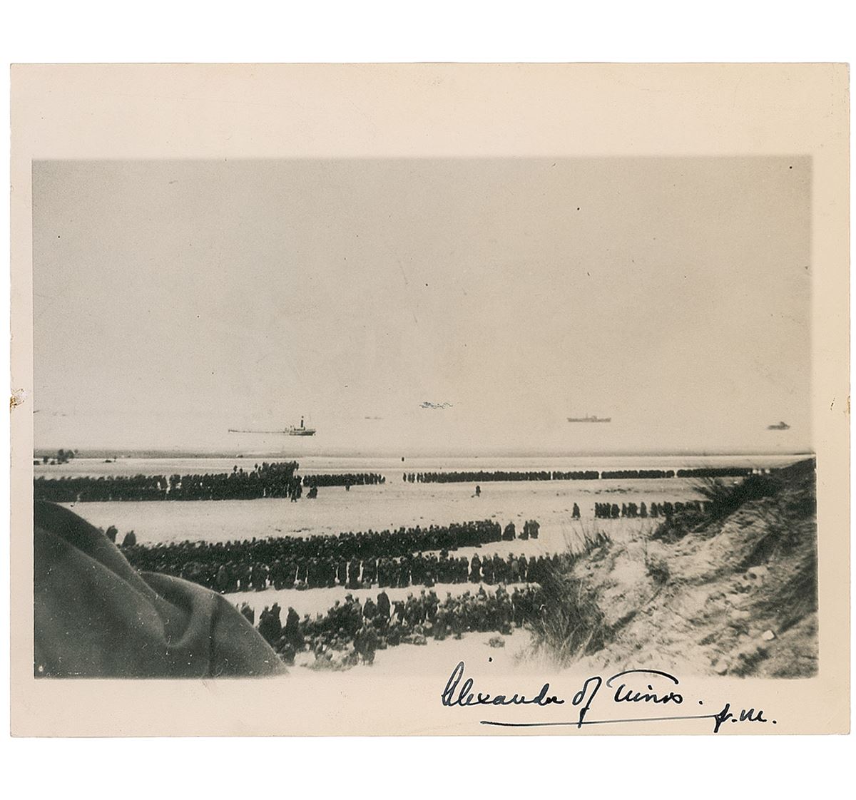 Matte-finish 10 x 8 photo of the crowded Dunkirk beach with several military ships in the distance, signed in the lower border in black felt tip, “Alexander of Tunis, F. M.” Reverse bears a Wide World photography stamp. In fine condition, with trivial soiling and dings and creases to edges. Alexander was the last British Army officer off the beach during the Dunkirk evacuation in 1939.