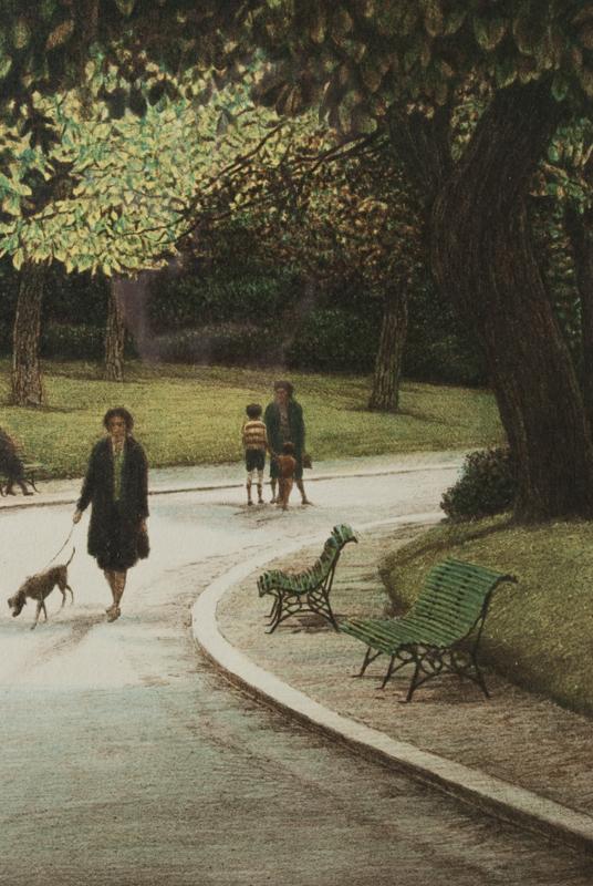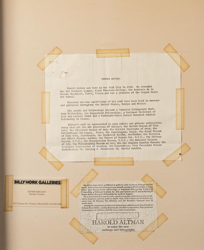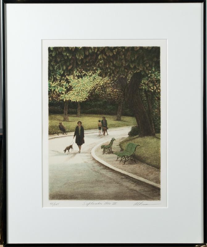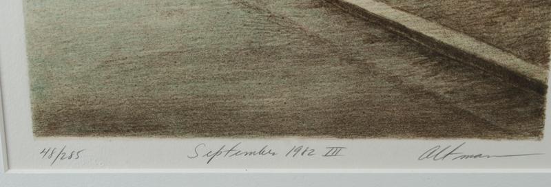 Titled, "September 1982 III," depicting a curved sidewalk with figures walking. Harold Altman, (1924-2003), Pennsylvania/France, was known for landscape/figure paintings and lithographs. Signed in pencil in LR, titled in LM and edition 48/285 in LL. Matted and framed behind glass, 13.5" H x 10" W (sight) with 3.25" for matting and frame. Further information about the artist en verso.