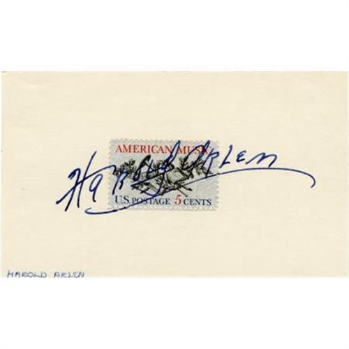 <B>Harold Arlen Autograph.</B></I> A 5" x 3" card, with a five-cent commemorative postage stamp affixed, signed by the celebrated composer in dark blue ink. Arlen's autograph extends across the face of the stamp and is large and clean. In Excellent condition.<BR><BR><b>Shipping:</b> Flat Material, Small (<a target="_blank" href="http://www.heritageauctions.com/common/shipping.php">view shipping information</a>)