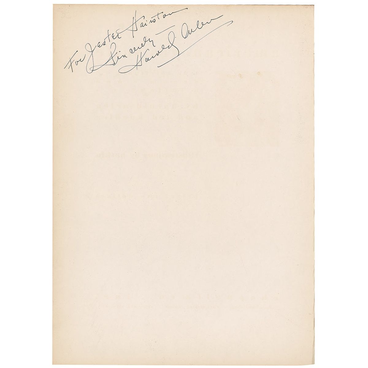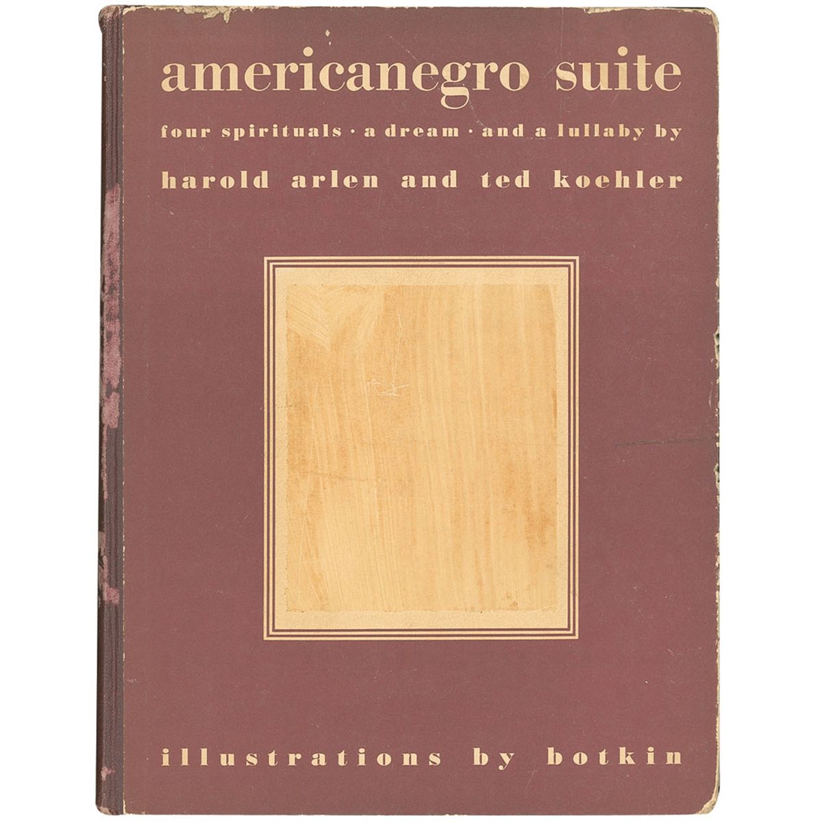 Distinguished American composer (1905–1986) best known for his songs for the film The Wizard of Oz. Signed book: American Negro Suite. First edition. NY: Chappell & Co., 1941. Hardcover, 9 x 12, 71 pages. Signed and inscribed on the reverse of the first free end page, “For Jester Hairston, Sincerely—Harold Arlen.” Some mild toning to signed page, pencil notations to title page, toning to inside pages, loose front hinge, fraying to spine, dings and edge loss to covers, as well as scattered surface marks and dings, otherwise very good condition.