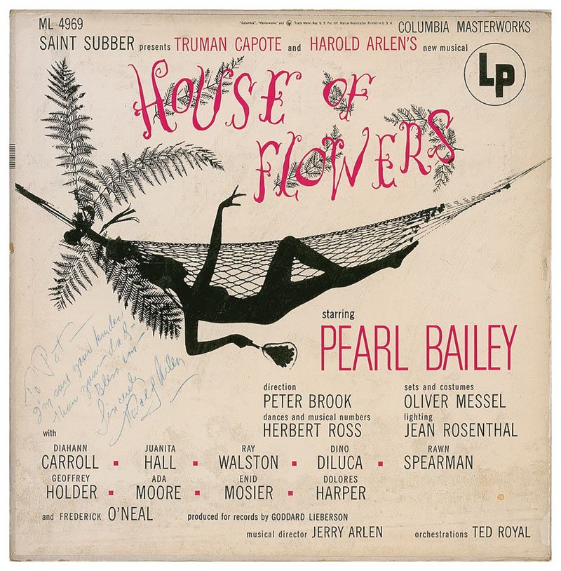 House of Flowers album signed and inscribed on the front in blue ballpoint, “To Pat, I’m sure your [sic] kinder than your dad—Bless ‘em—Sincerely, Harold Arlen.” In very good condition, with scattered light toning and rubbing, separations to the top and bottom edges, and light ‘rings of wear.’ The record is included.