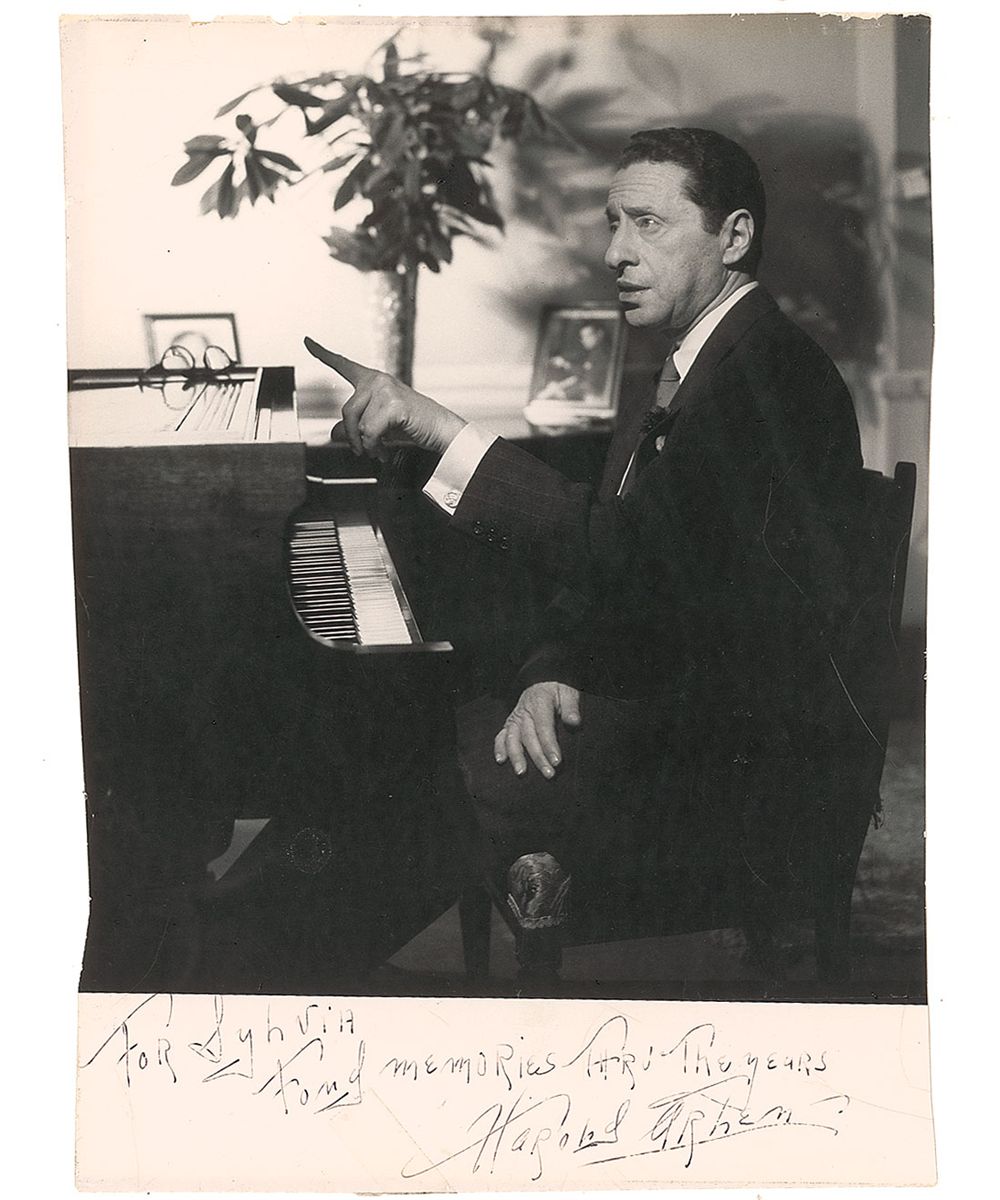 Distinguished American composer (1905–1986) best known for his songs for the film The Wizard of Oz. Vintage glossy 7.25 x 10 photo of Arlen seated at a piano, signed and inscribed in black ink “For Sylvia, fond memories thru the years, Harold Arlen.” Trimmed edges, scattered creases and surface marks, and overall irregular ink adhesion to signature and inscription, otherwise very good condition.