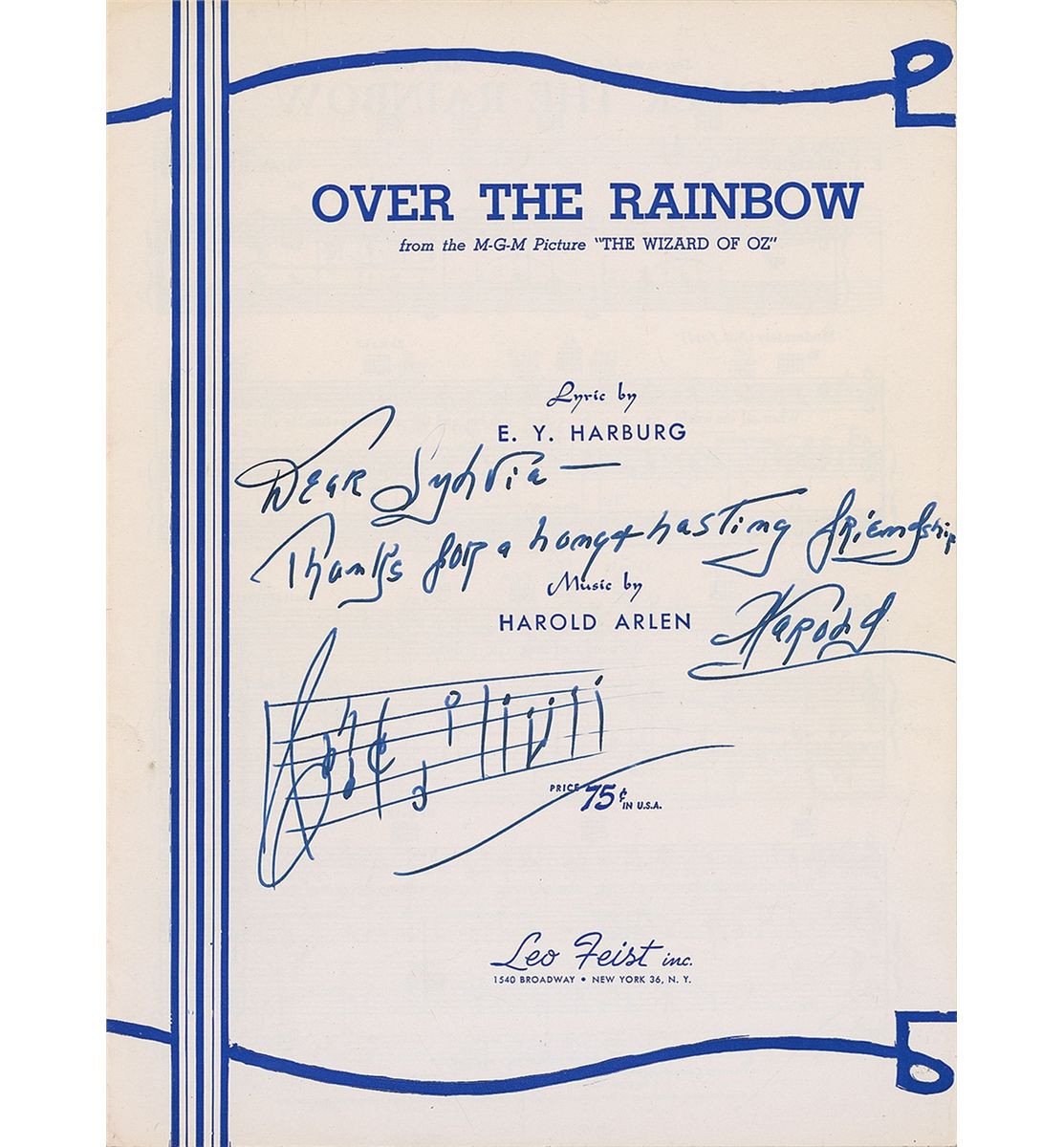 Vintage sheet music for ‘Over the Rainbow,’ 9 x 12, five pages, signed and inscribed on the front cover in fountain pen, “Dear Sylvia—Thanks for a long & lasting friendship, Harold,” adding a two-bar AMQS from the beginning of the song’s famous chorus. In fine condition, with mild scattered creases and trivial toning to the borders.