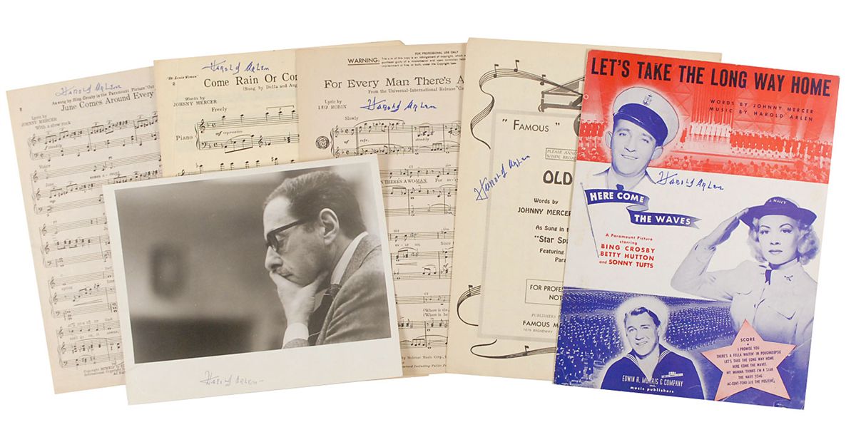 Distinguished American composer (1905–1986) best known for his songs for the film The Wizard of Oz. Collection of six items: a pearl-finish 10 x 8 photo signed in black ballpoint; and five pieces of sheet music, each signed on the front page in blue felt tip. Some light toning to the sheet music and a couple light creases to photo, otherwise fine condition.