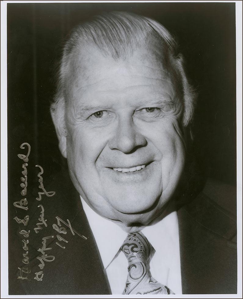 Hockey Hall of Famer (1903-1990) and former owner of the Toronto Maple Leafs. Glossy 8 x 10 head-and-shoulders photo, signed vertically in silver ink, “Harold E. Ballard, Happy New Year 1987.” In fine condition.