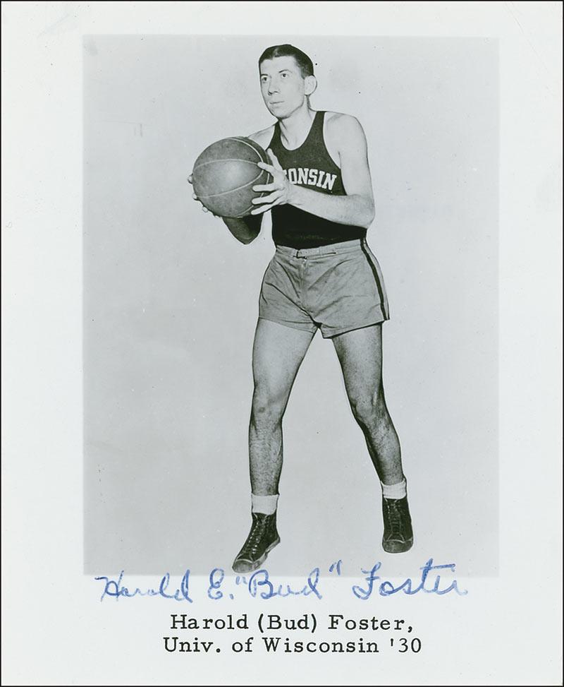 Basketball Hall of Famer (1906–1996). Glossy 4 x 5 Basketball Hall of Fame photo of Foster in his Wisconsin uniform, signed in blue ballpoint. In fine condition, with a few creases to top right corner.