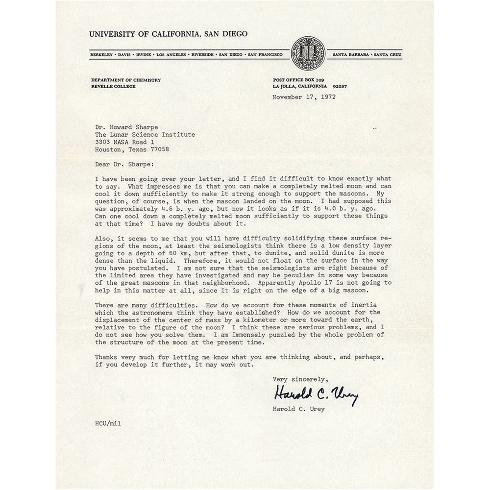 TLS, one page, 8.5 x 11, University of California, San Diego letterhead, November 17, 1972. Letter to Dr. Howard Sharpe of the Lunar Science Institute, in part: "I have been going over your letter, and I find it difficult to know exactly what to say. What impresses me is that you can make a completely melted moon and can cool it down sufficiently to make it strong enough to support the mascons. My question, of course, is when the mascon landed on the moon. I had supposed this was approximately 4.6 b. y. ago, but now it looks as if it is 4.0 b. y. ago. Can one cool down a completely melted moon sufficiently to support these things at that time? I have my doubts about it.